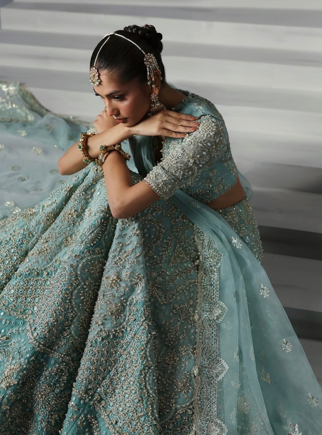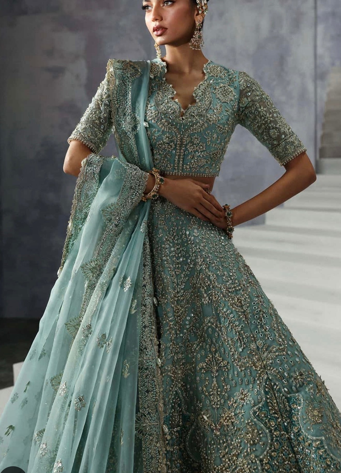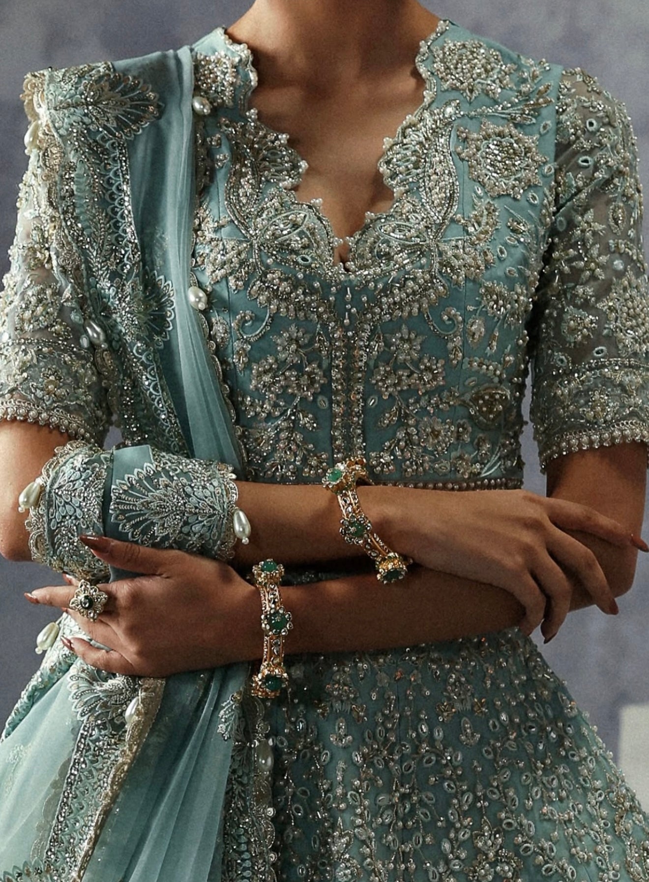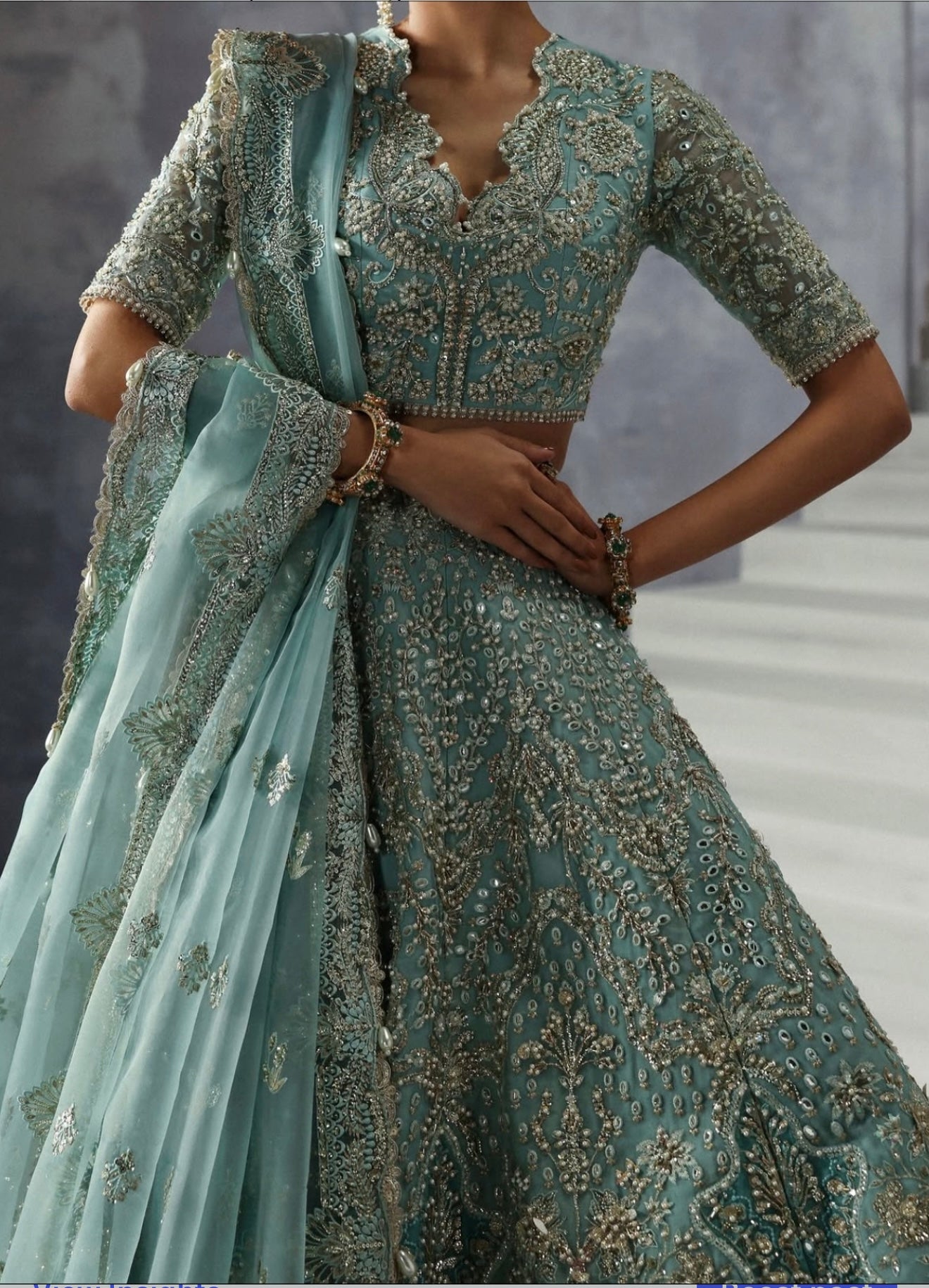 A turquoise lehenga choli set. The choli features a jewel-like neckline, crafted from sheer organza and meticulous hand embellishments. The flared lehenga showcases heavily embellished panels and stunning applique details, with a embroidered organza dupatta.