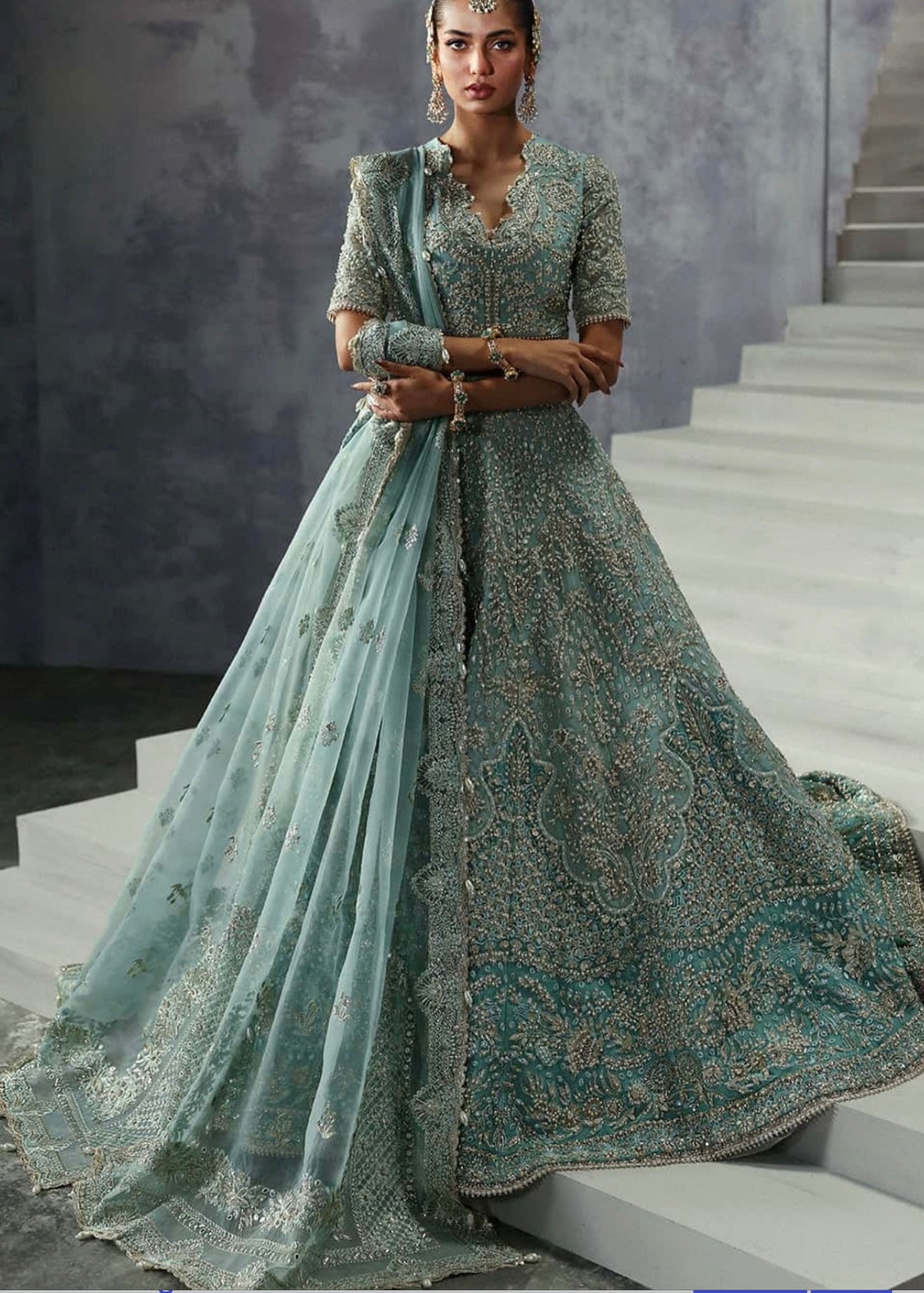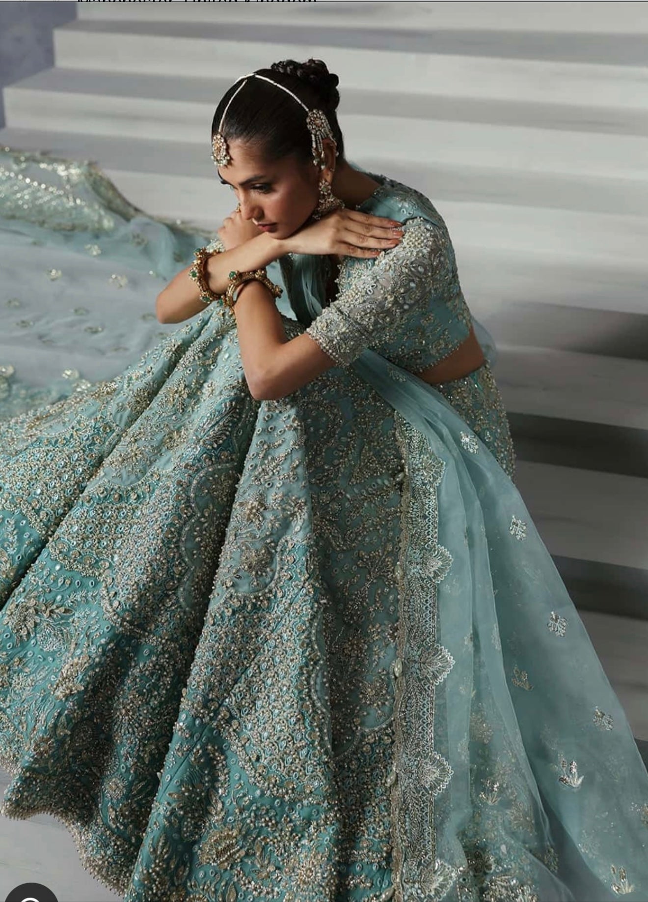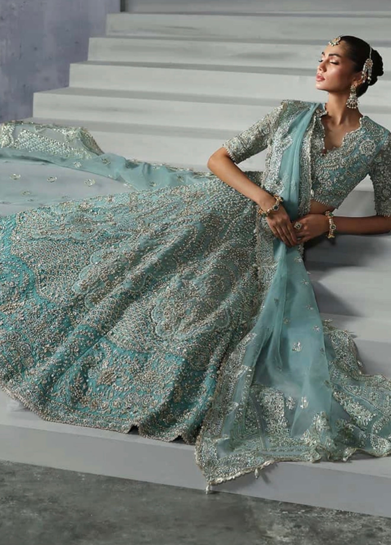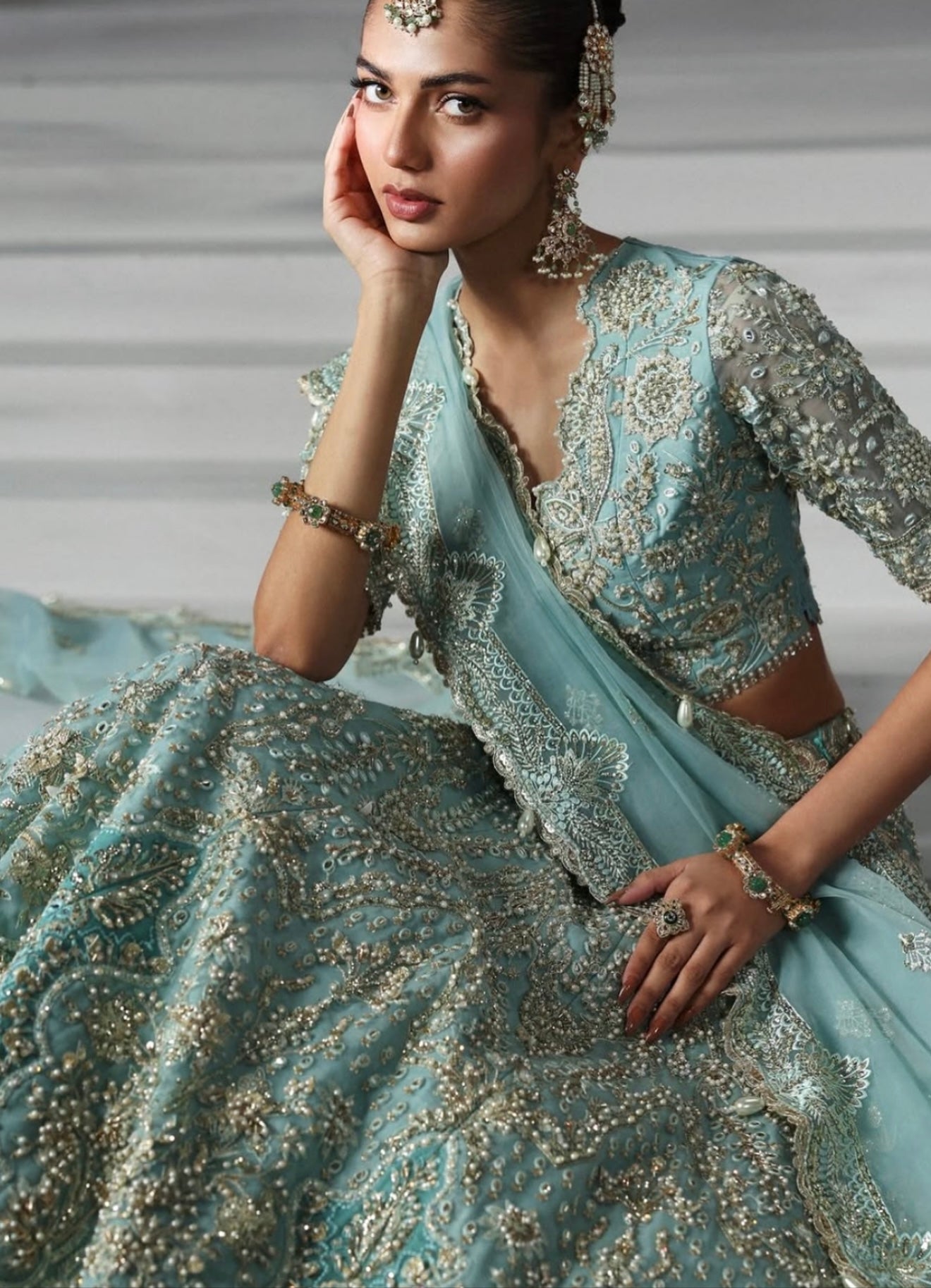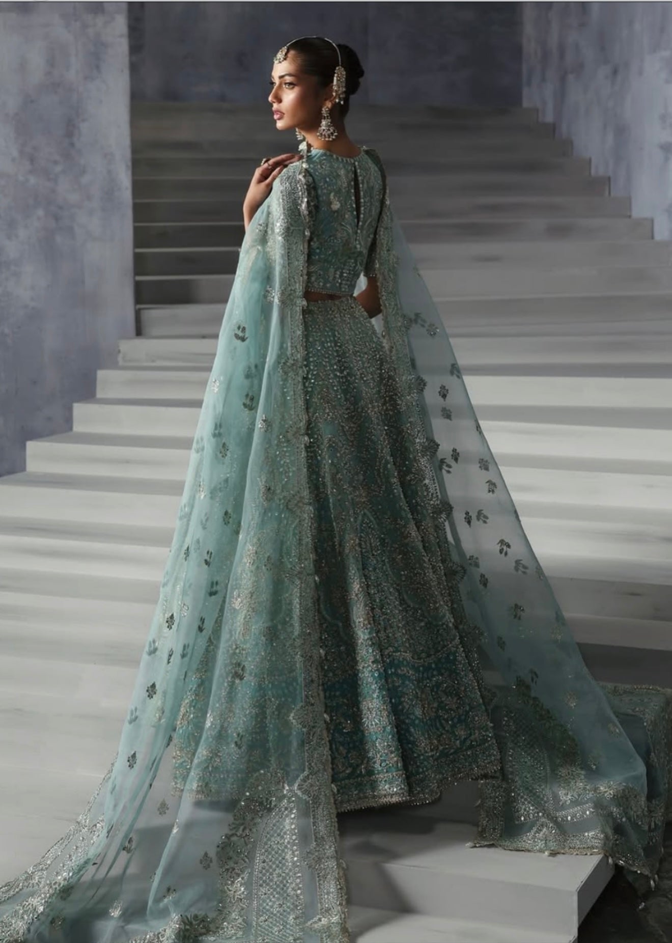 A turquoise lehenga choli set. The choli features a jewel-like neckline, crafted from sheer organza and meticulous hand embellishments. The flared lehenga showcases heavily embellished panels and stunning applique details, with a embroidered organza dupatta.