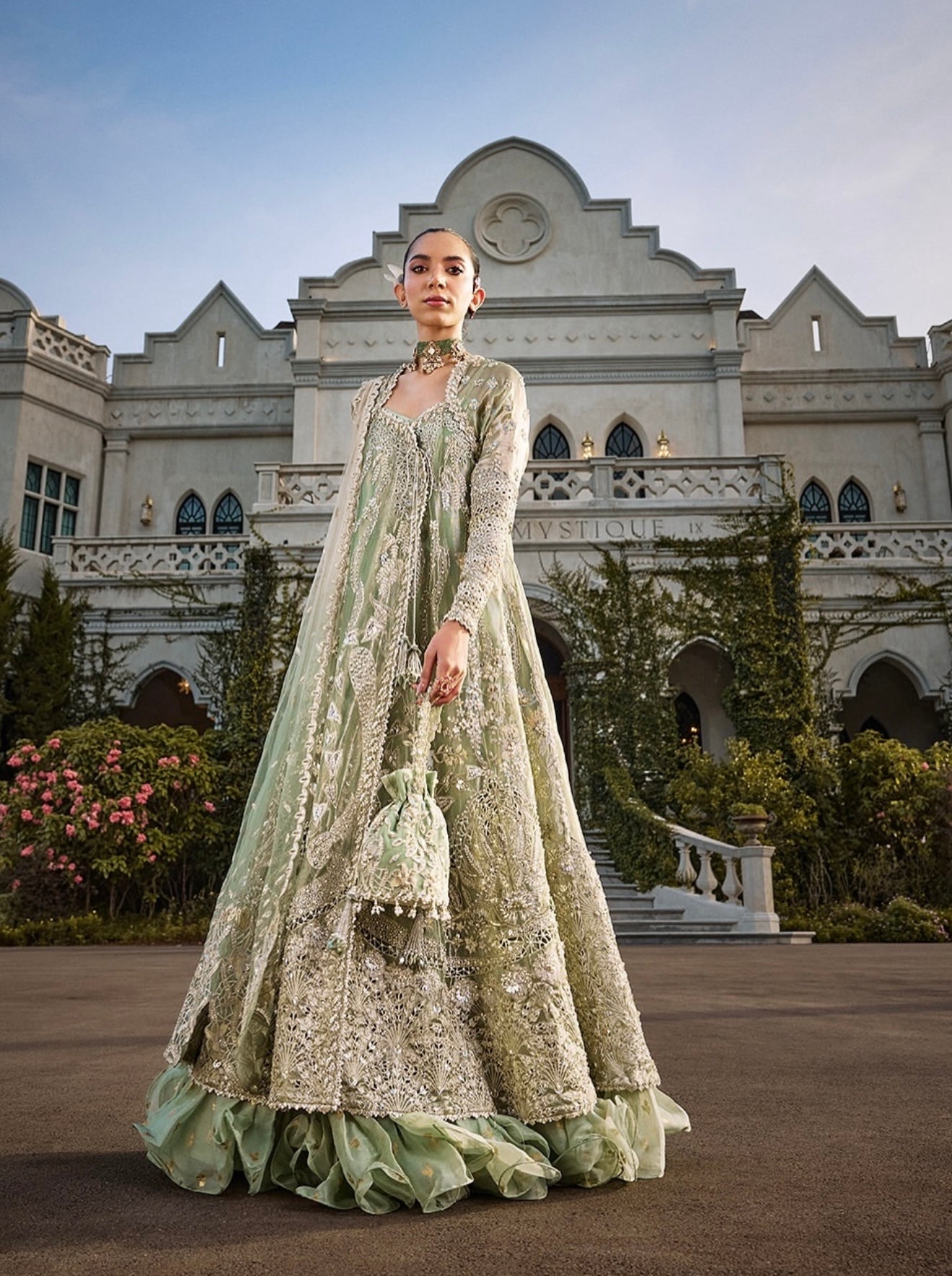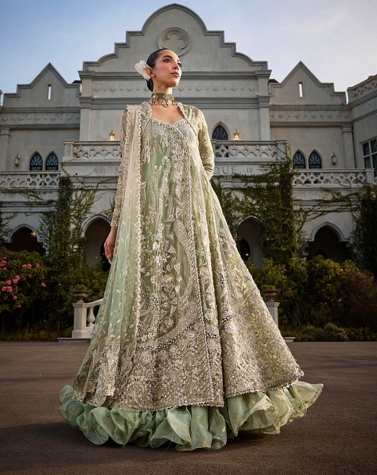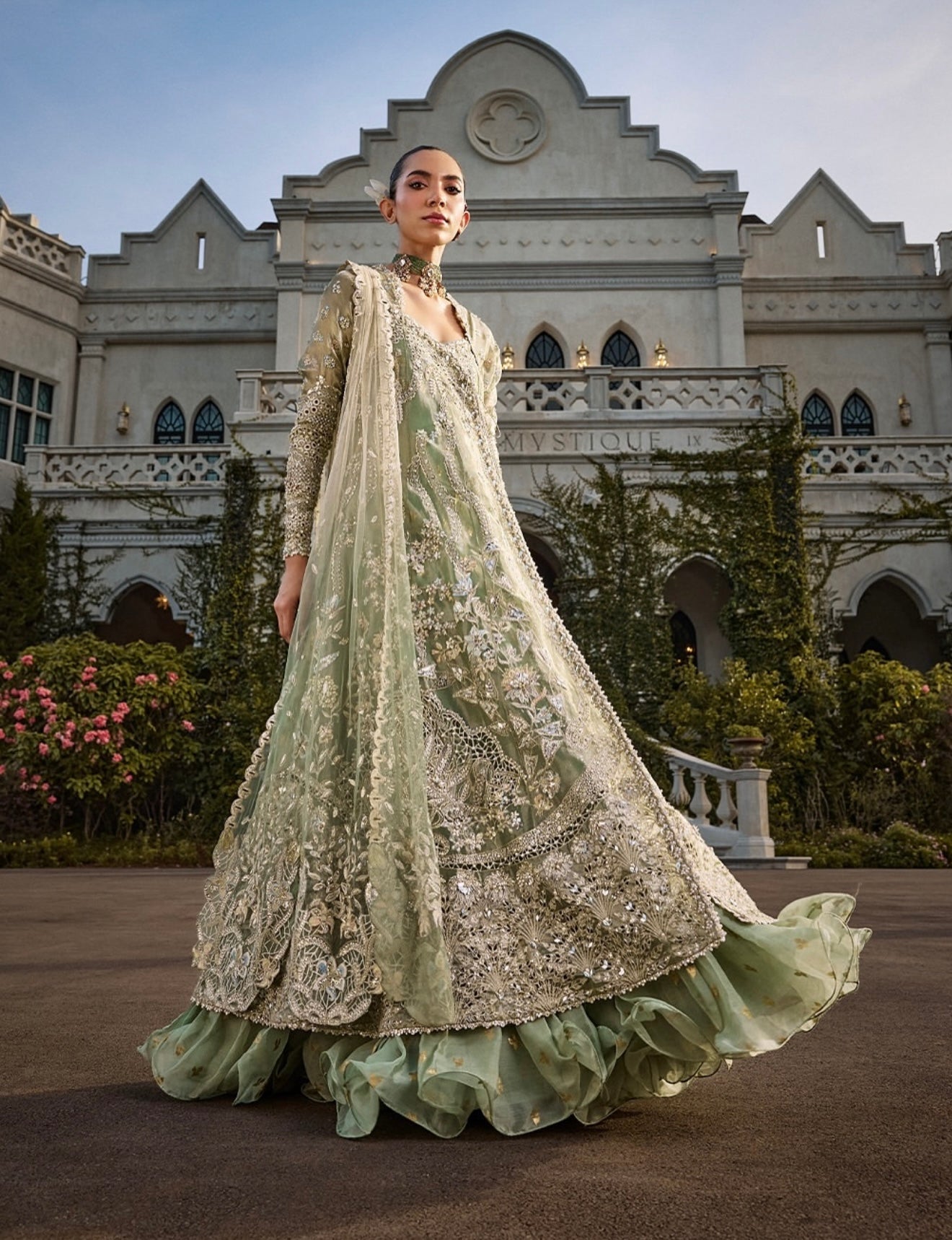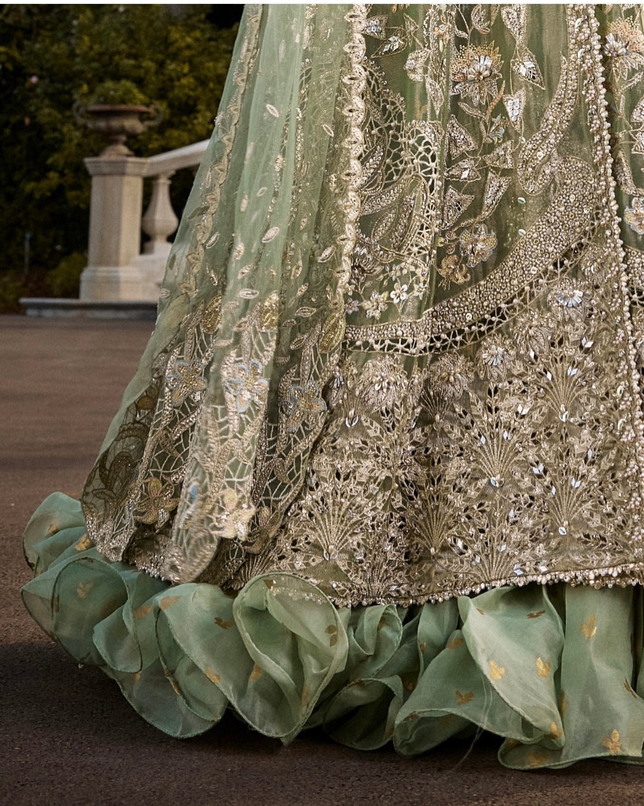Tissue material hand embellished dress with inner slip, skirt with organza ruffle and dupatta.