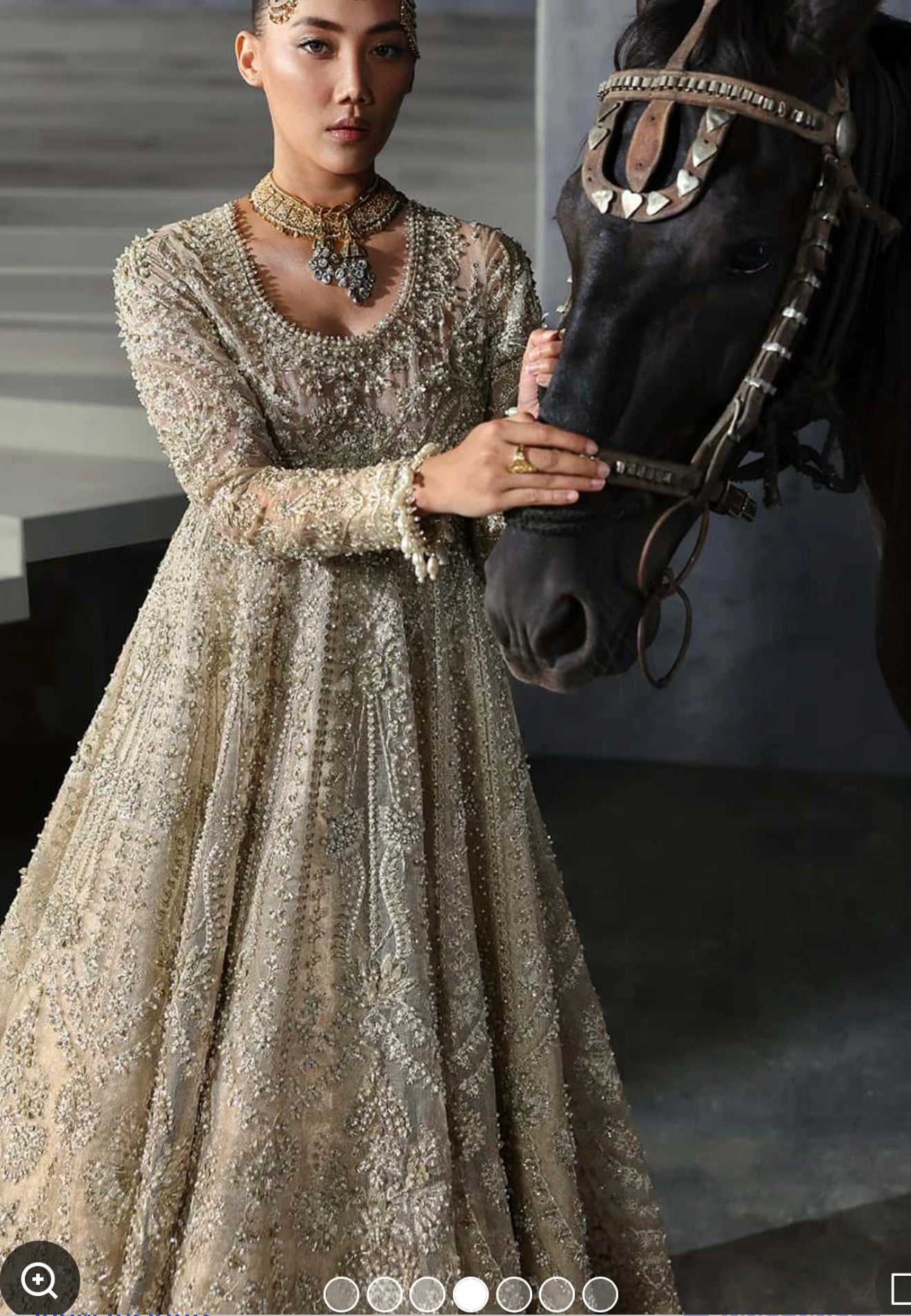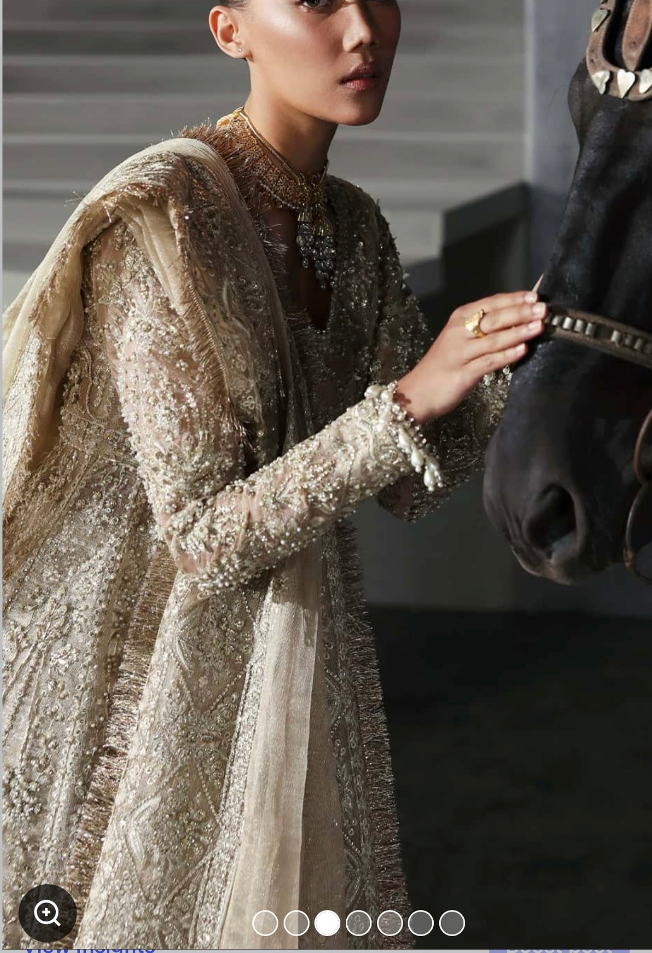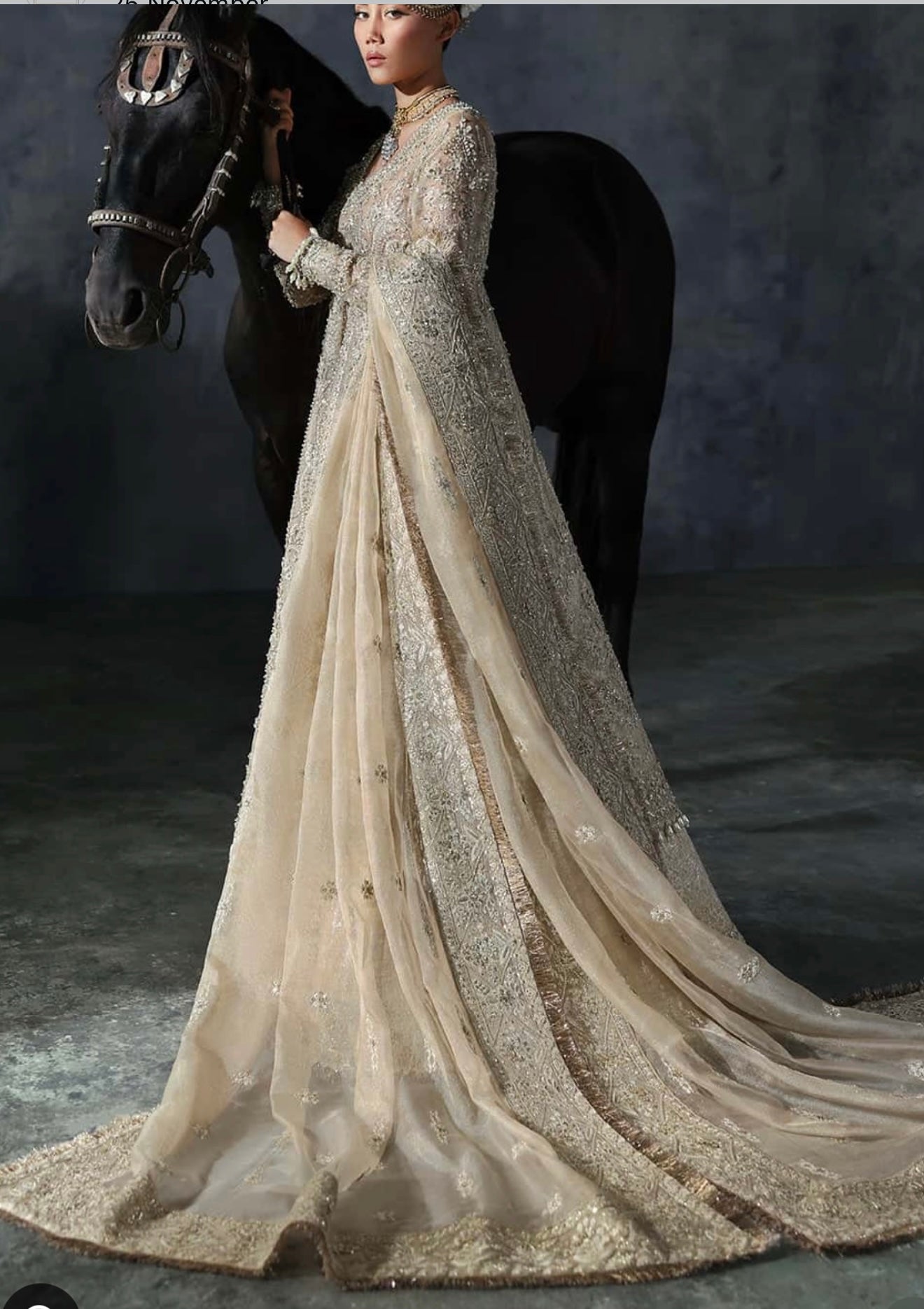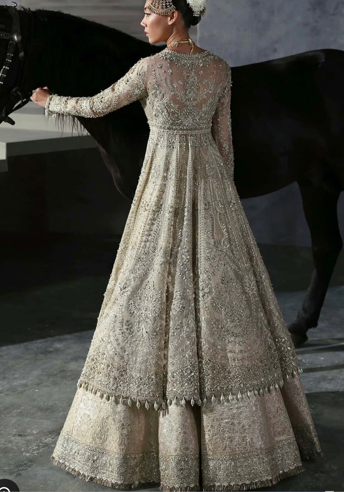 The peshwas, crafted from opulent khadi net, adorned with lavish silk thread embroidery and intricate embellishments. Its zari net sleeves, featuring delicately embellished motifs. With khadi net dupatta, enriched with heavy sequins, pearl tilla, and cutdana work.