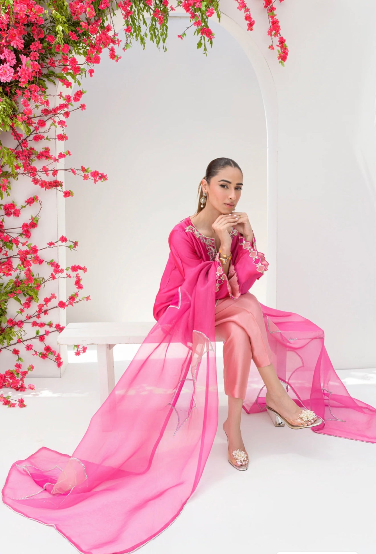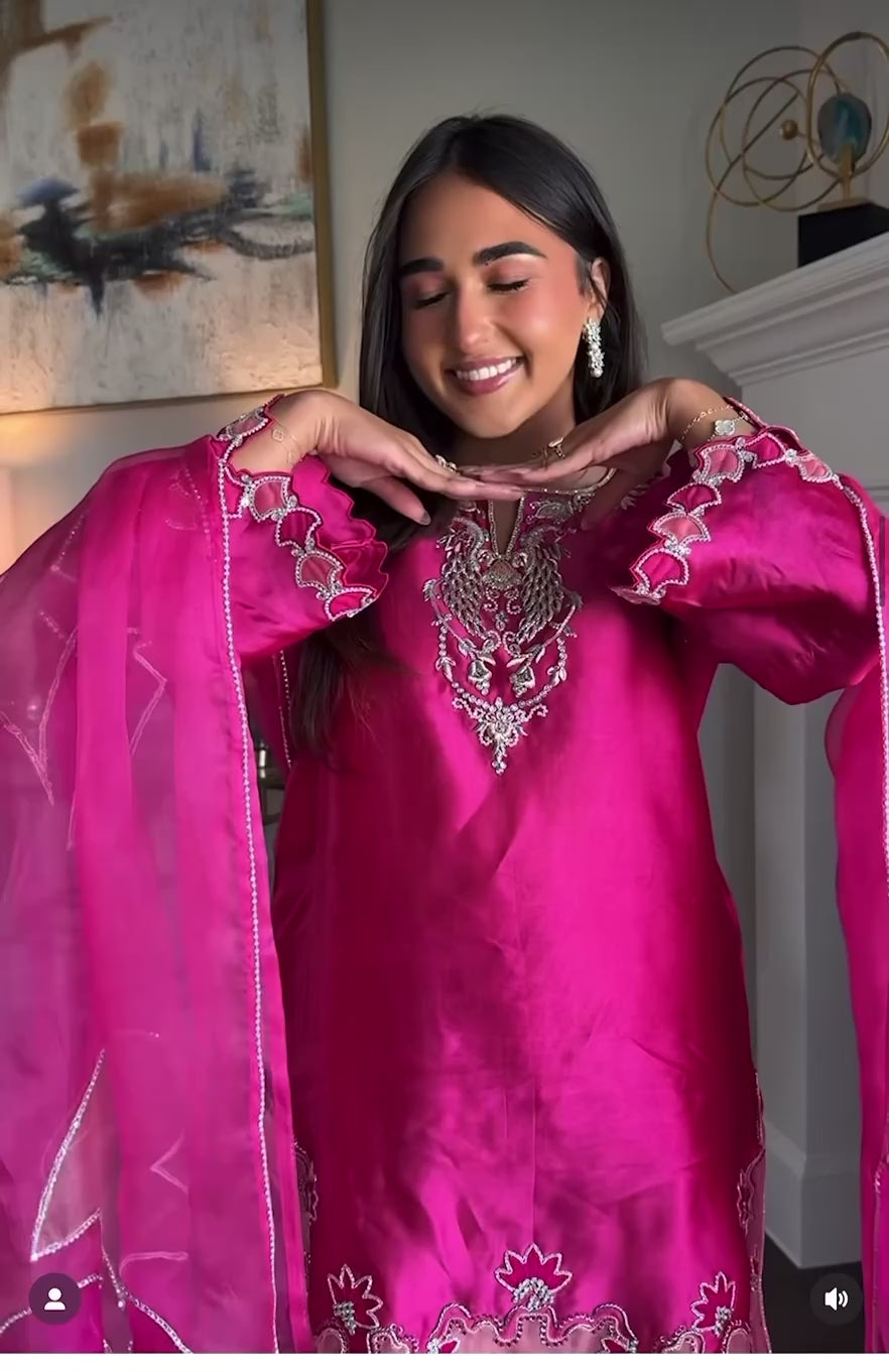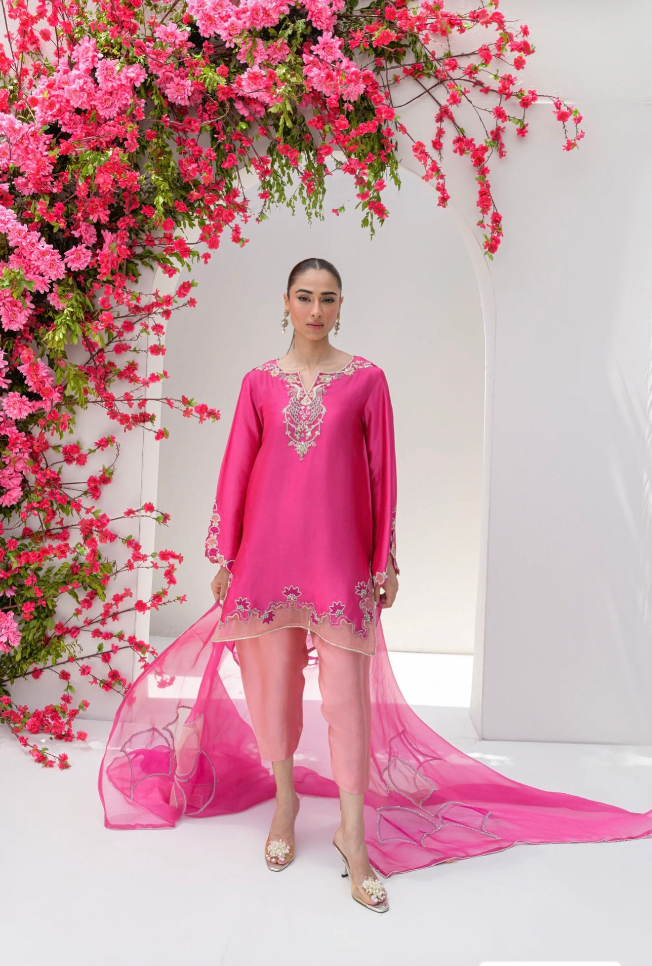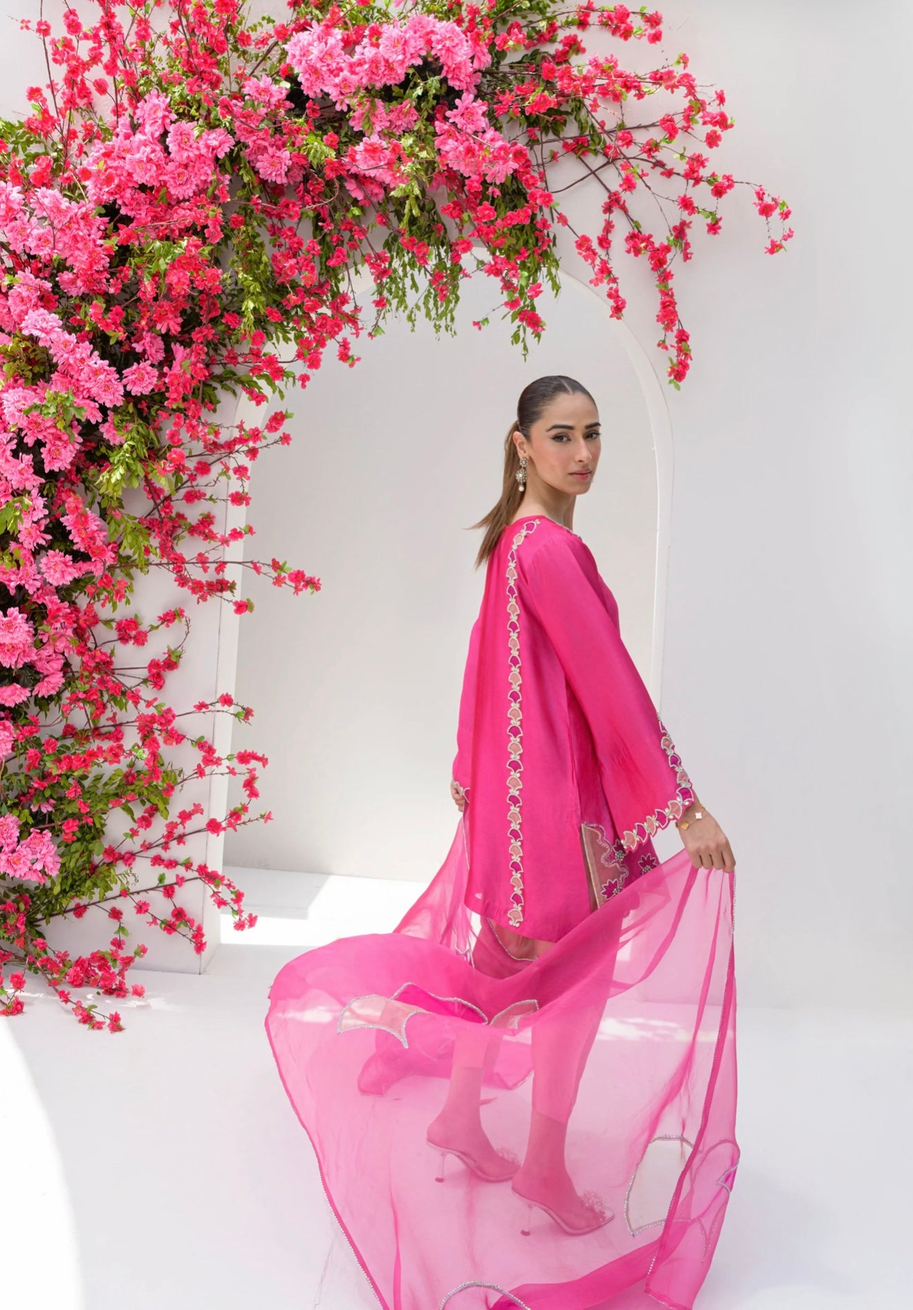 A pink-toned fuchsia shirt paired with a candy-colored shalwar, made from Sheesha silk. The outfit has detailed handwork—Dabka, Kora, Resham, and intricate appliqué. The pure Kattan organza dupatta has appliqué detailing and shimmering Swarovski stones.