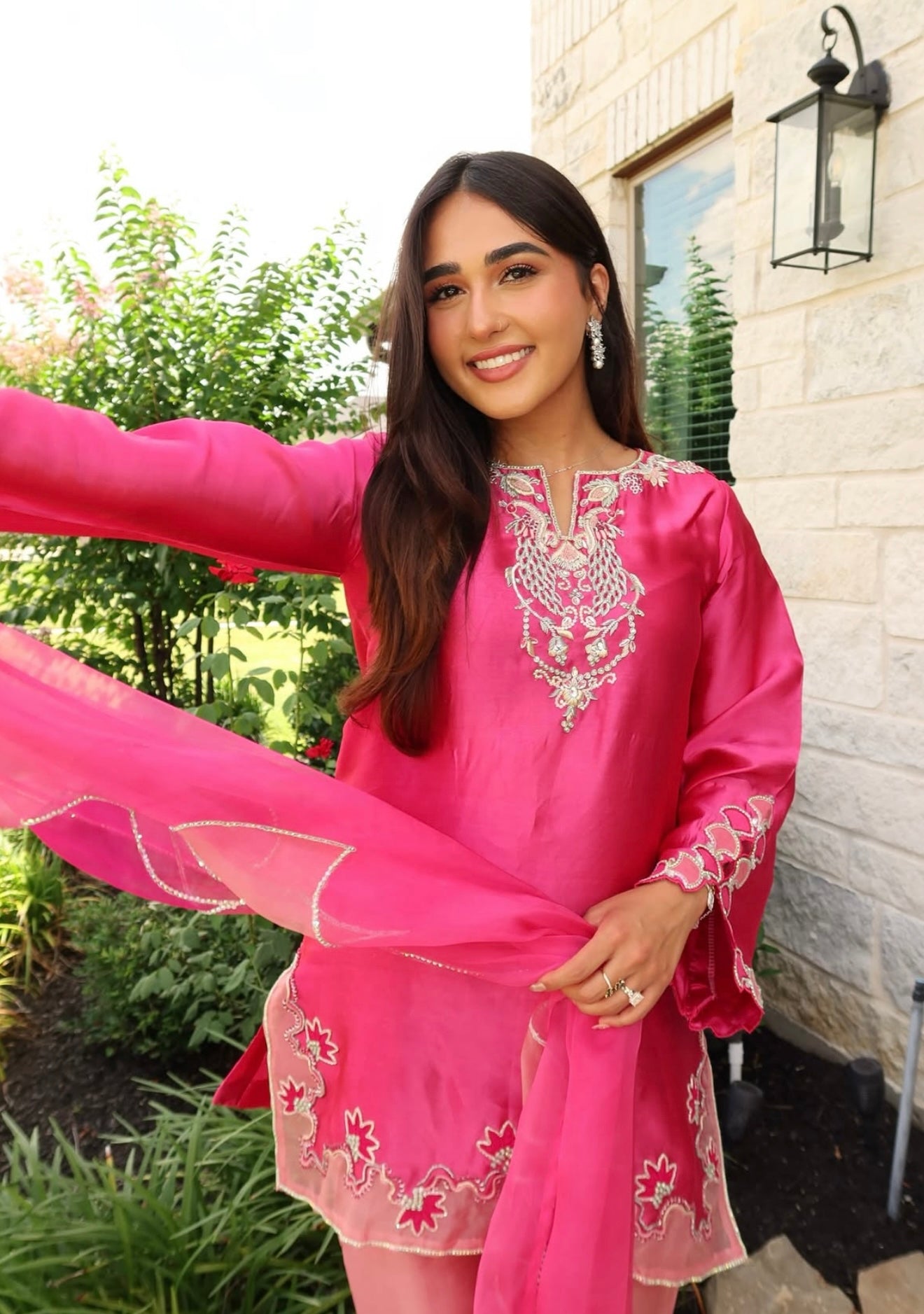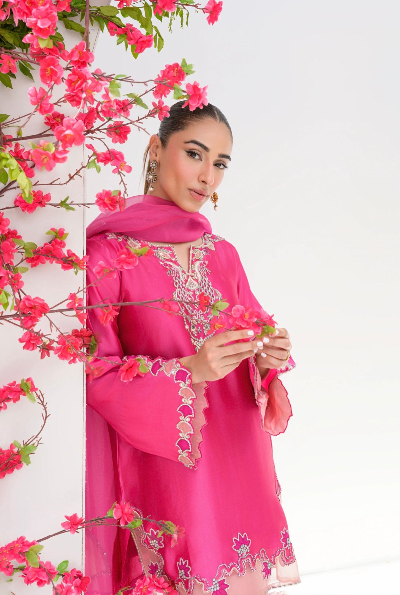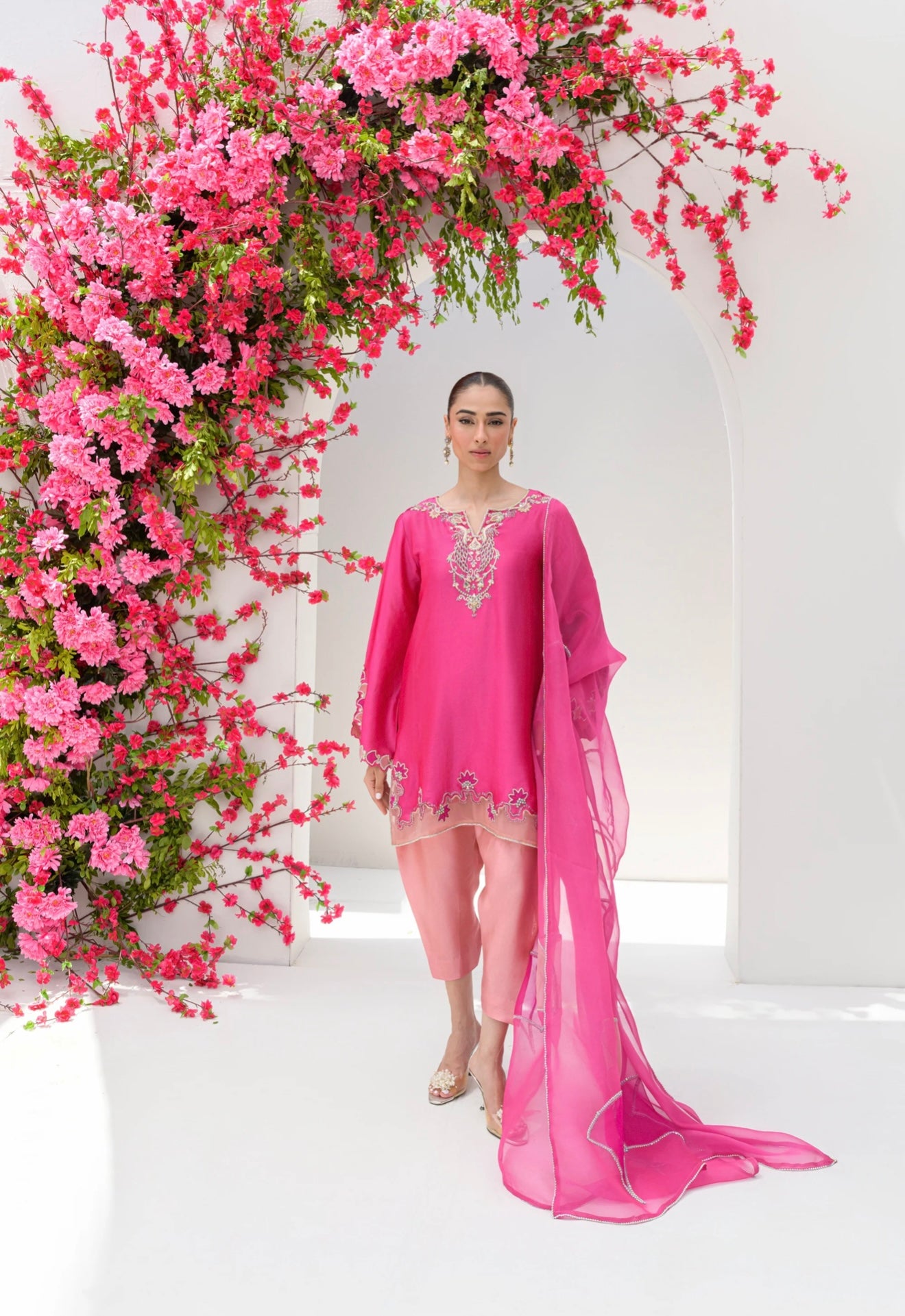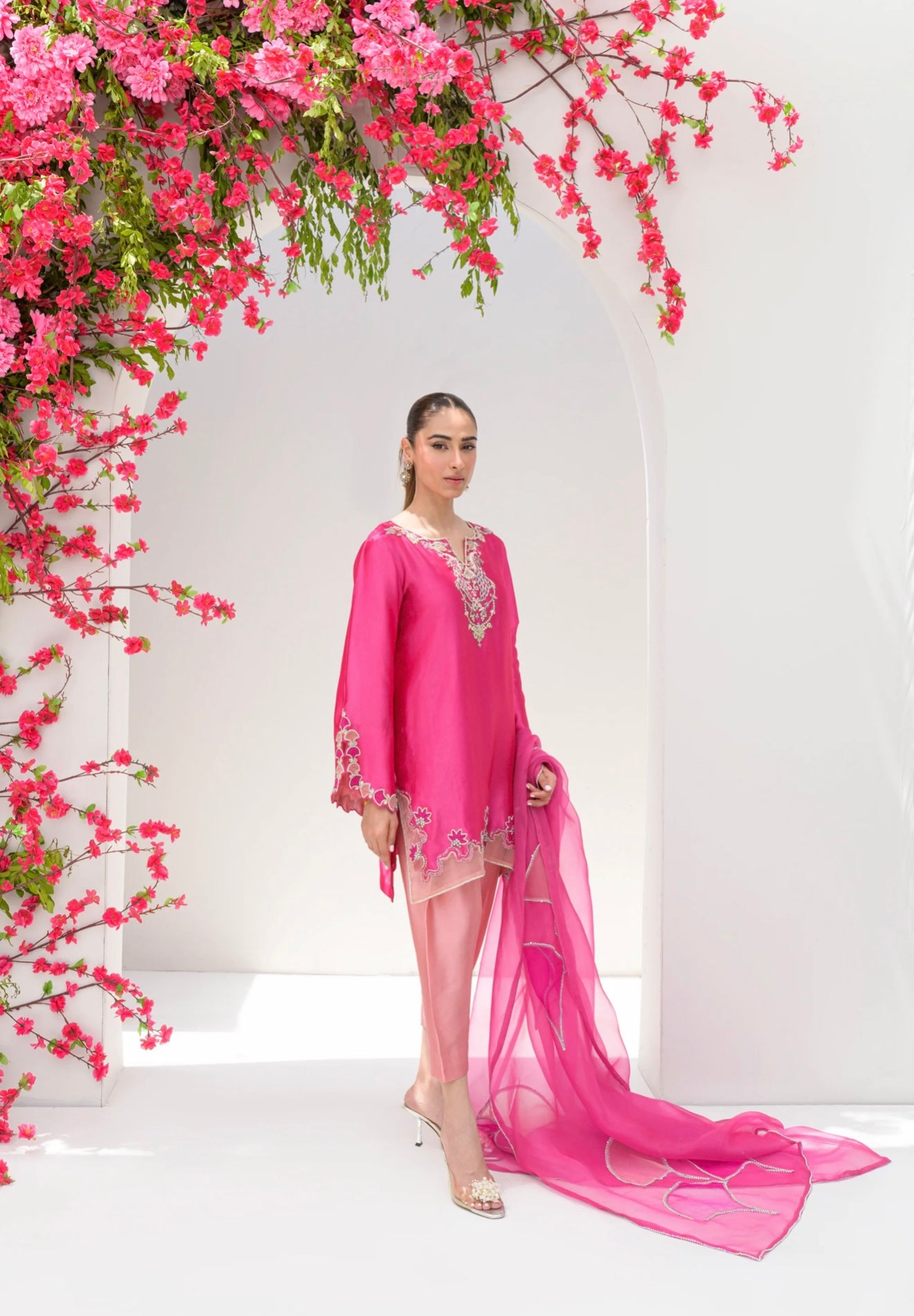 A pink-toned fuchsia shirt paired with a candy-colored shalwar, made from Sheesha silk. The outfit has detailed handwork—Dabka, Kora, Resham, and intricate appliqué. The pure Kattan organza dupatta has appliqué detailing and shimmering Swarovski stones.