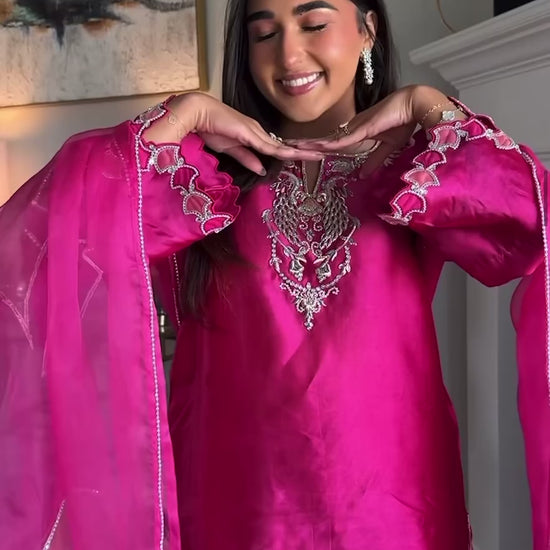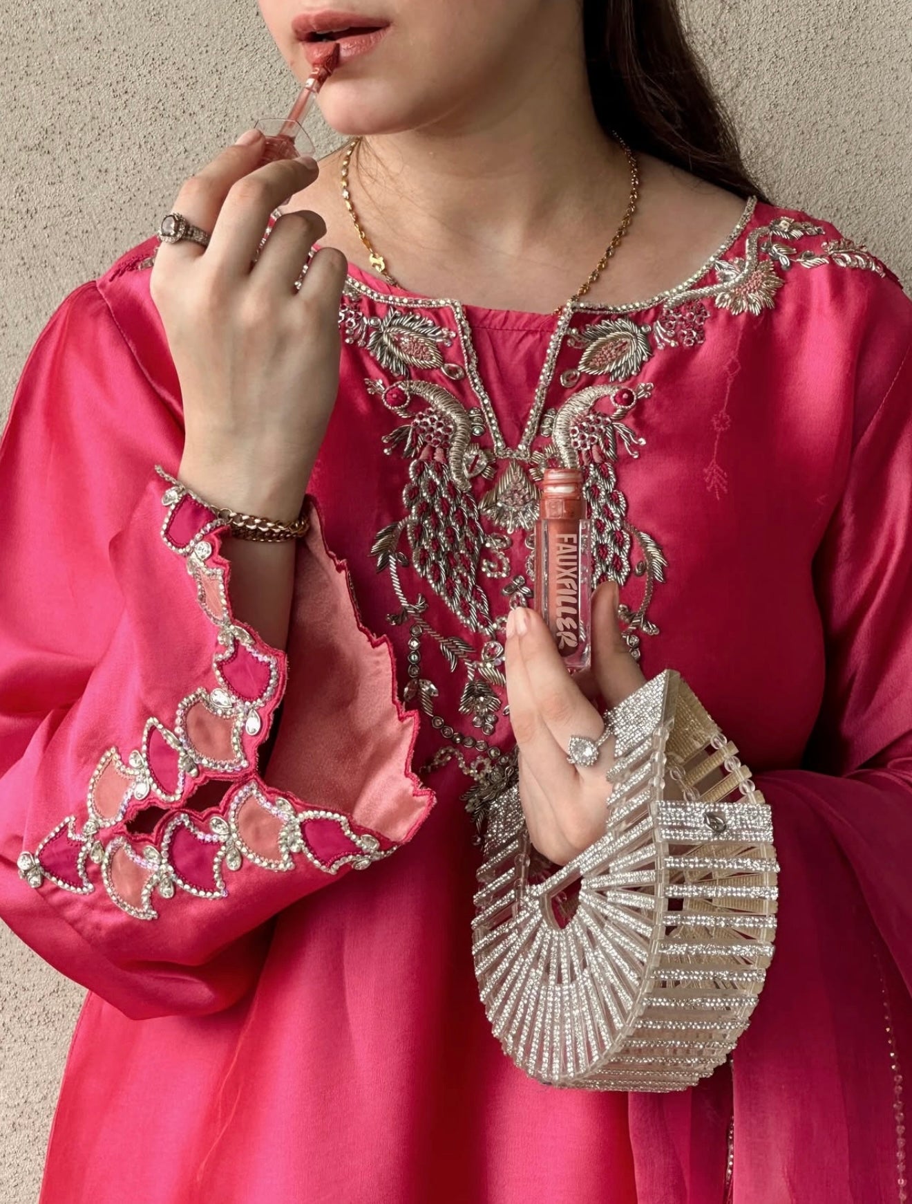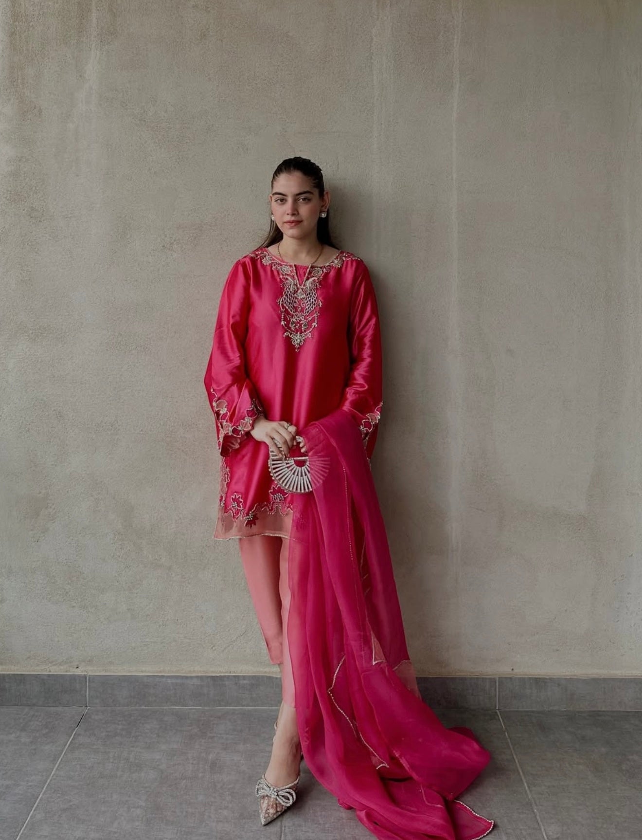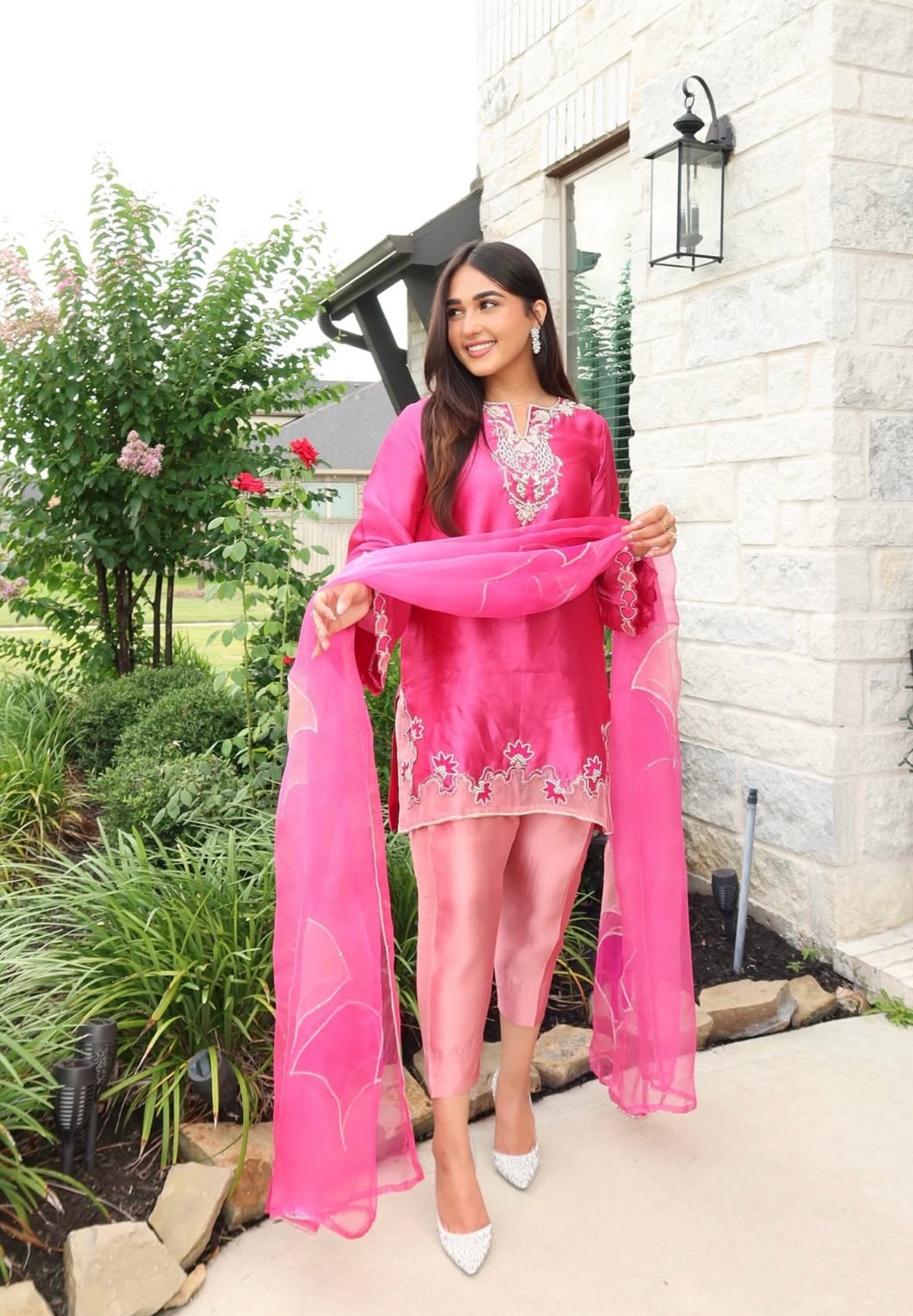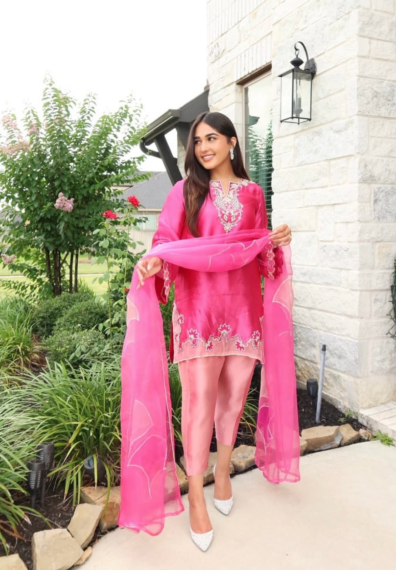 A pink-toned fuchsia shirt paired with a candy-colored shalwar, made from Sheesha silk. The outfit has detailed handwork—Dabka, Kora, Resham, and intricate appliqué. The pure Kattan organza dupatta has appliqué detailing and shimmering Swarovski stones.