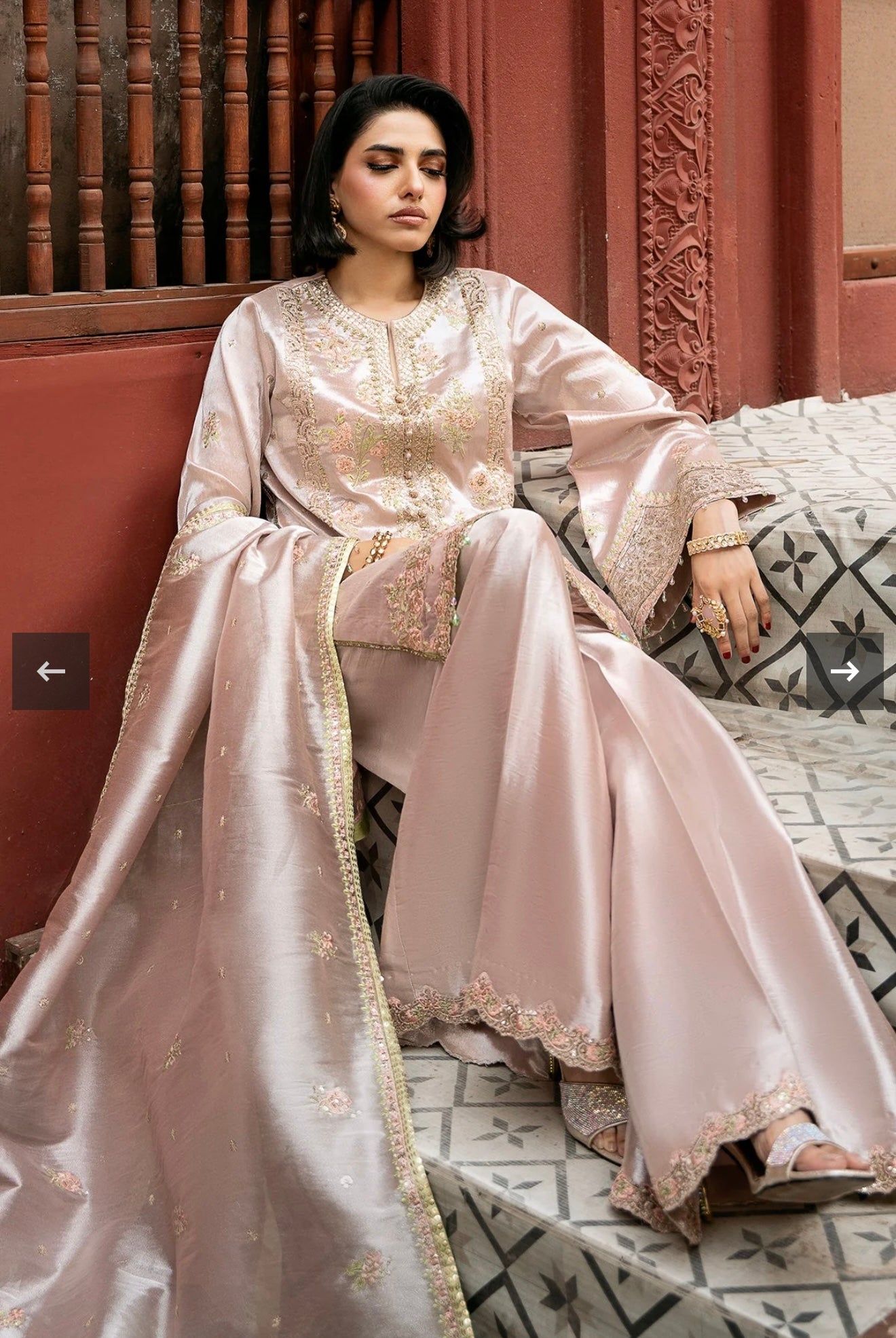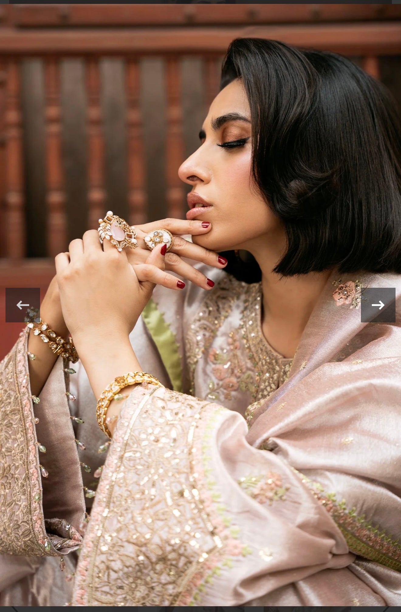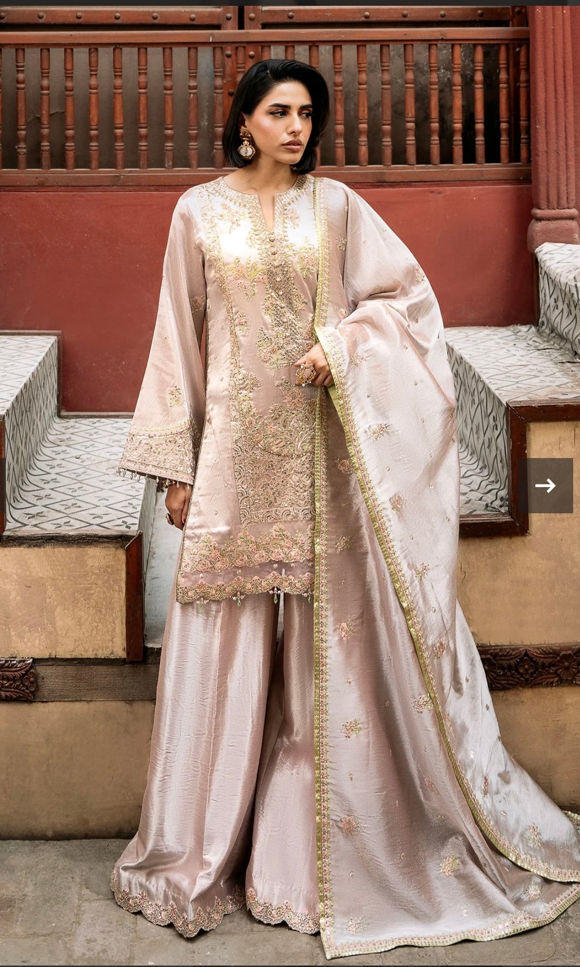 Exquisite embroidery adorned with tilla and shimmering sequins, enriched by resham threads and pure zardozi craftsmanship. Kora, dabka, nakshi, delicate pearls, crystals, and Japanese cut dana add layers of elegance, making each stitch a celebration of timeless artistry and luxury