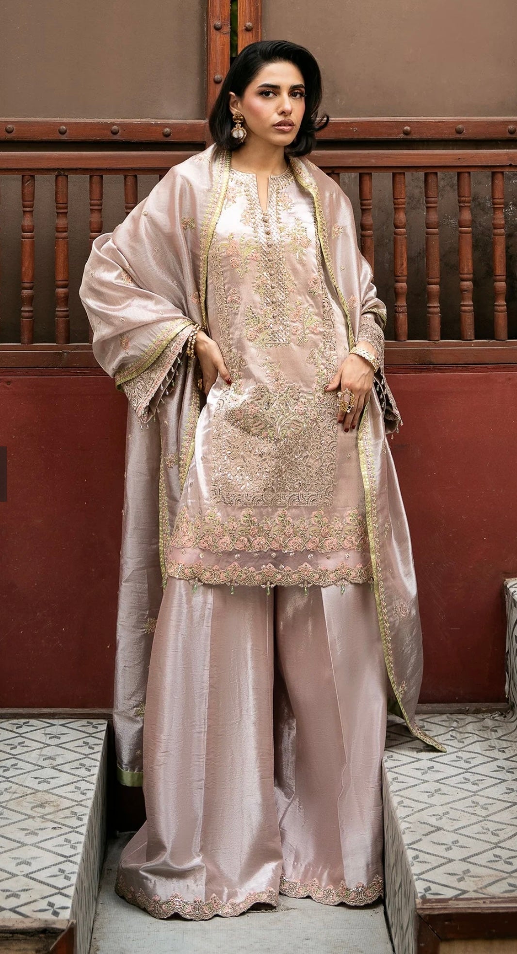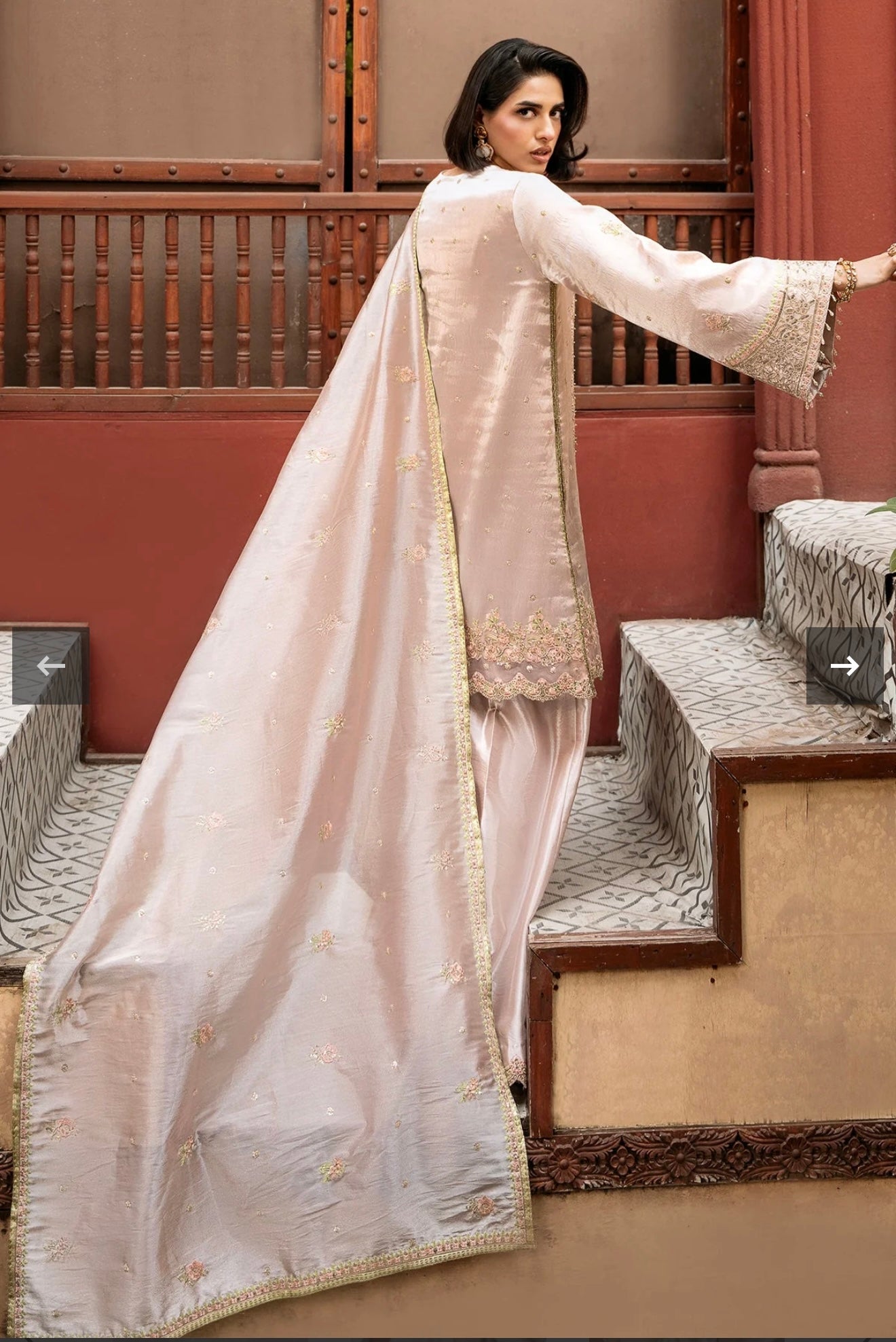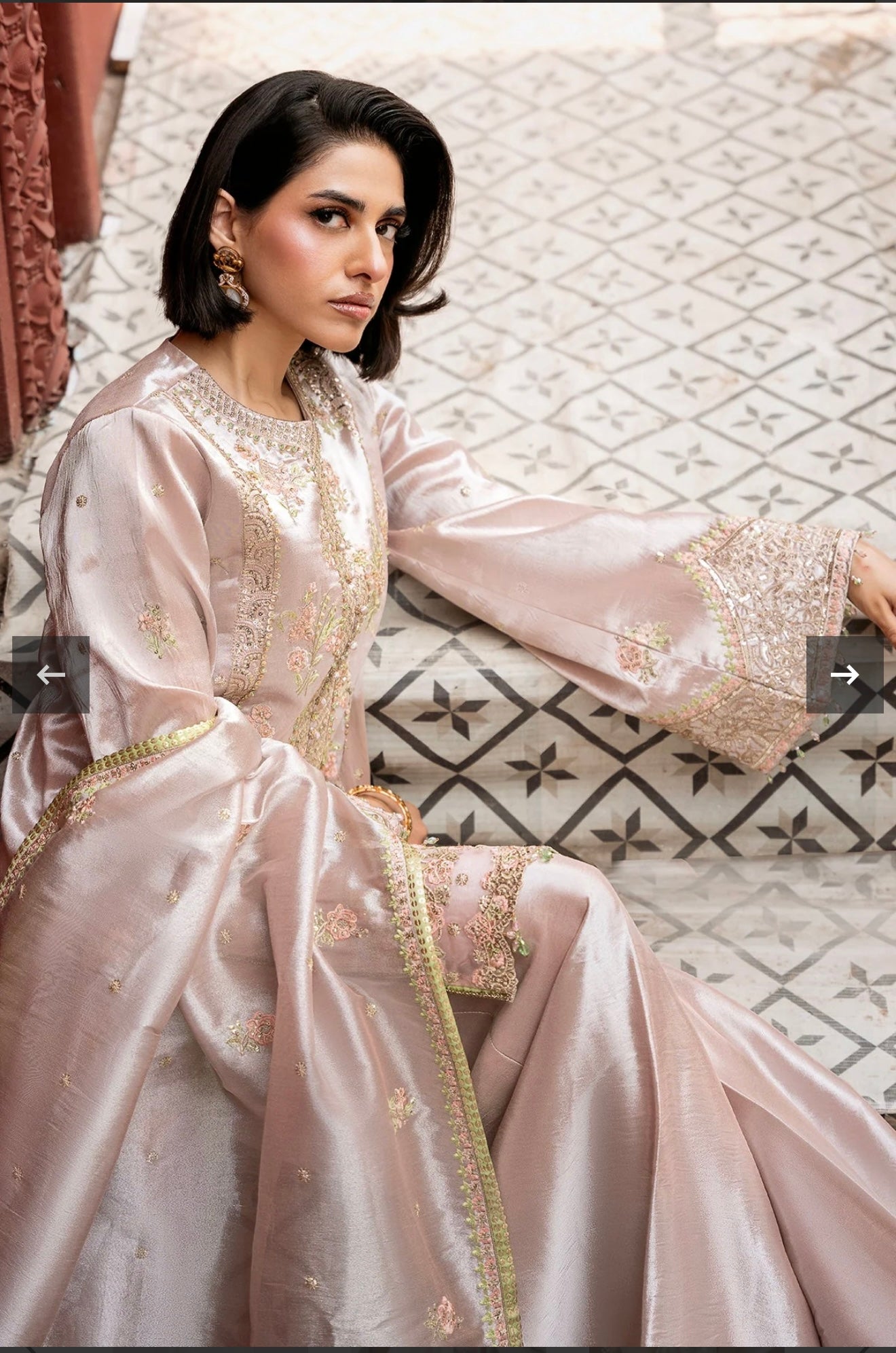 Exquisite embroidery adorned with tilla and shimmering sequins, enriched by resham threads and pure zardozi craftsmanship. Kora, dabka, nakshi, delicate pearls, crystals, and Japanese cut dana add layers of elegance, making each stitch a celebration of timeless artistry and luxury