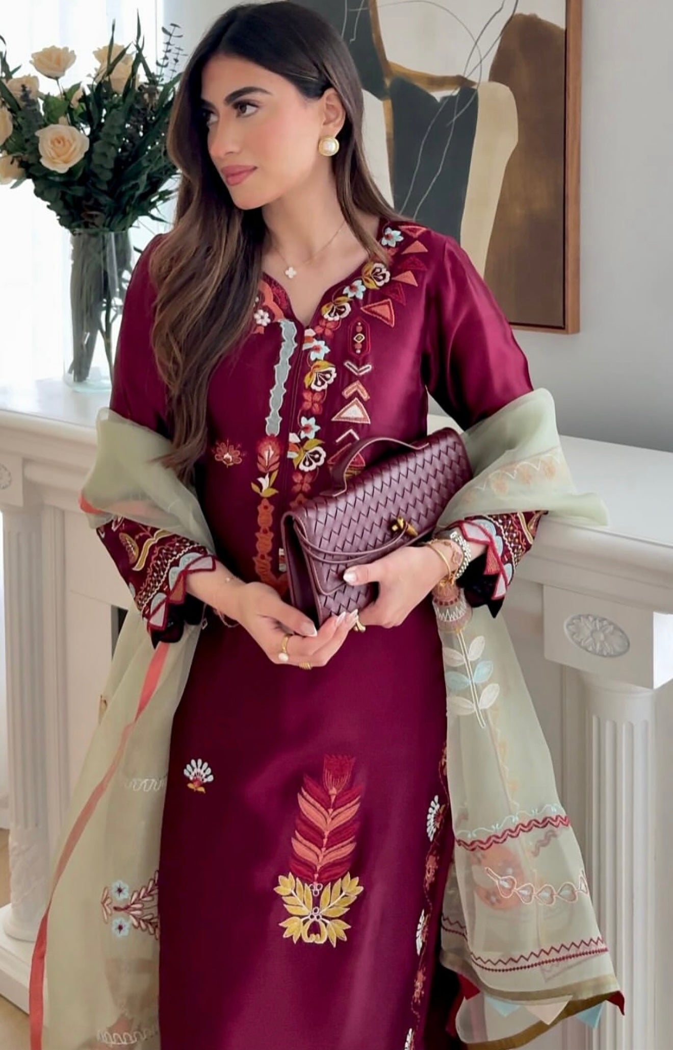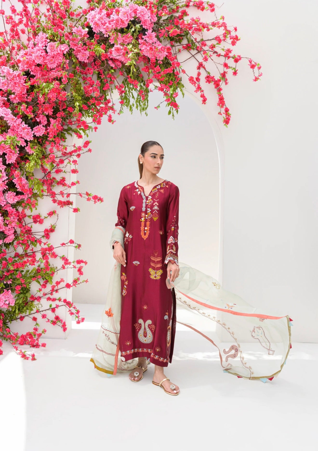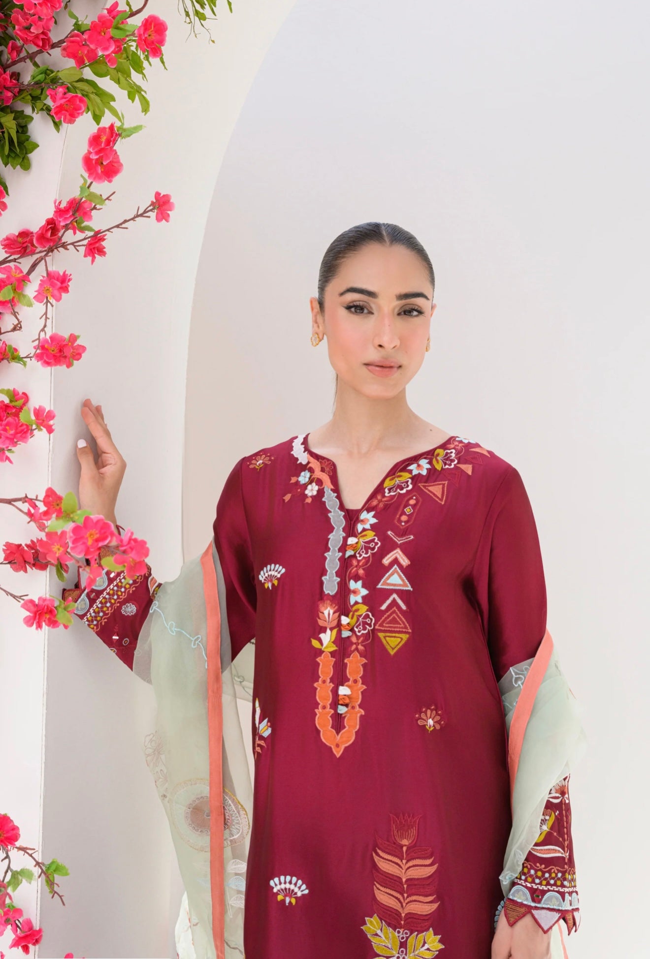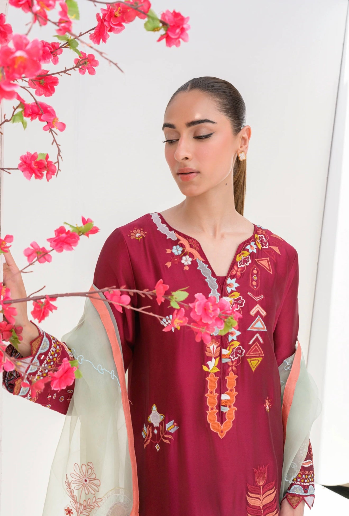 Cherry Pie is a deep maroon long shirt paired with an apple green dupatta. Both the shirt and dupatta are richly adorned with intricate machine embroidery in shades of ice blue, rust, and sage green.