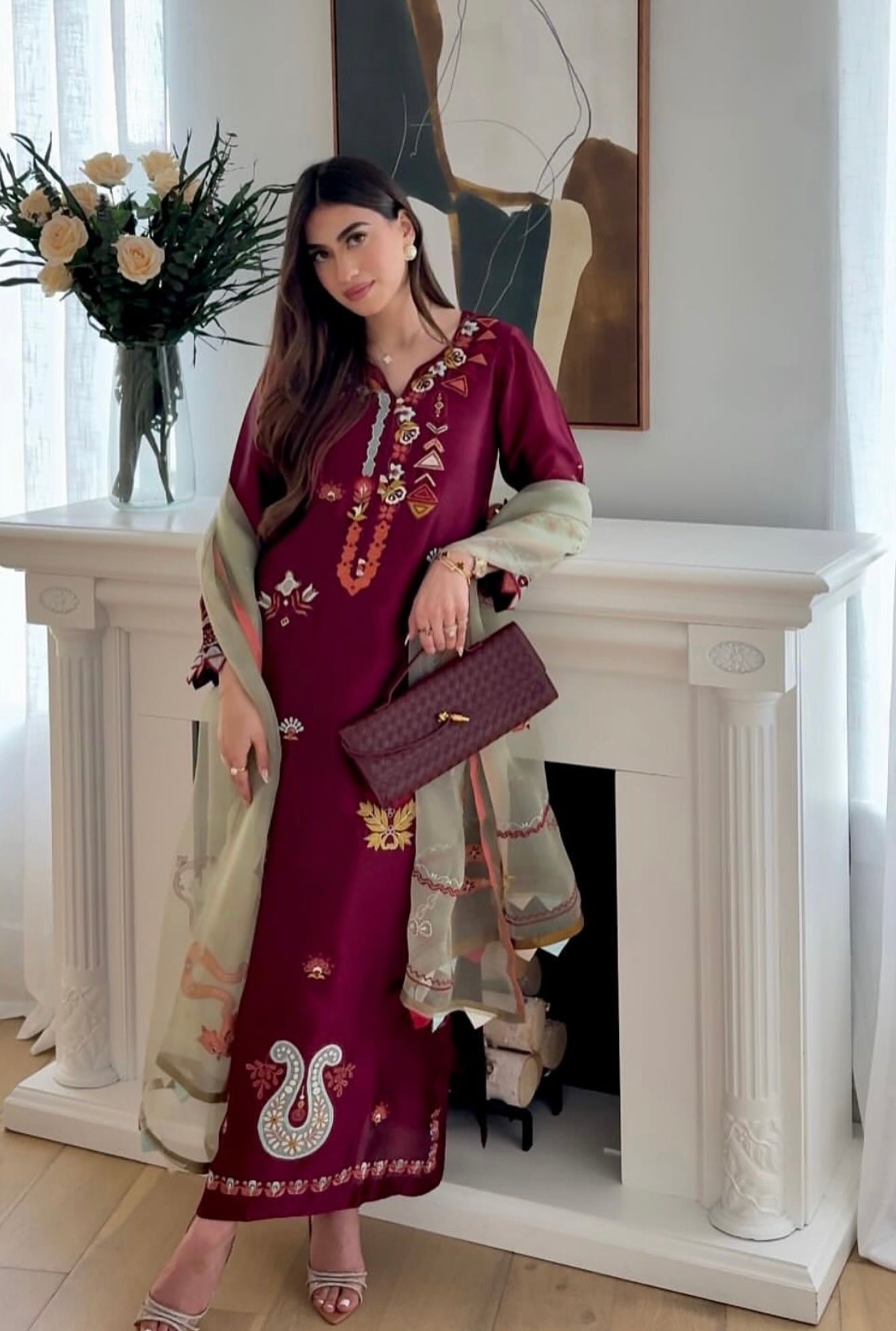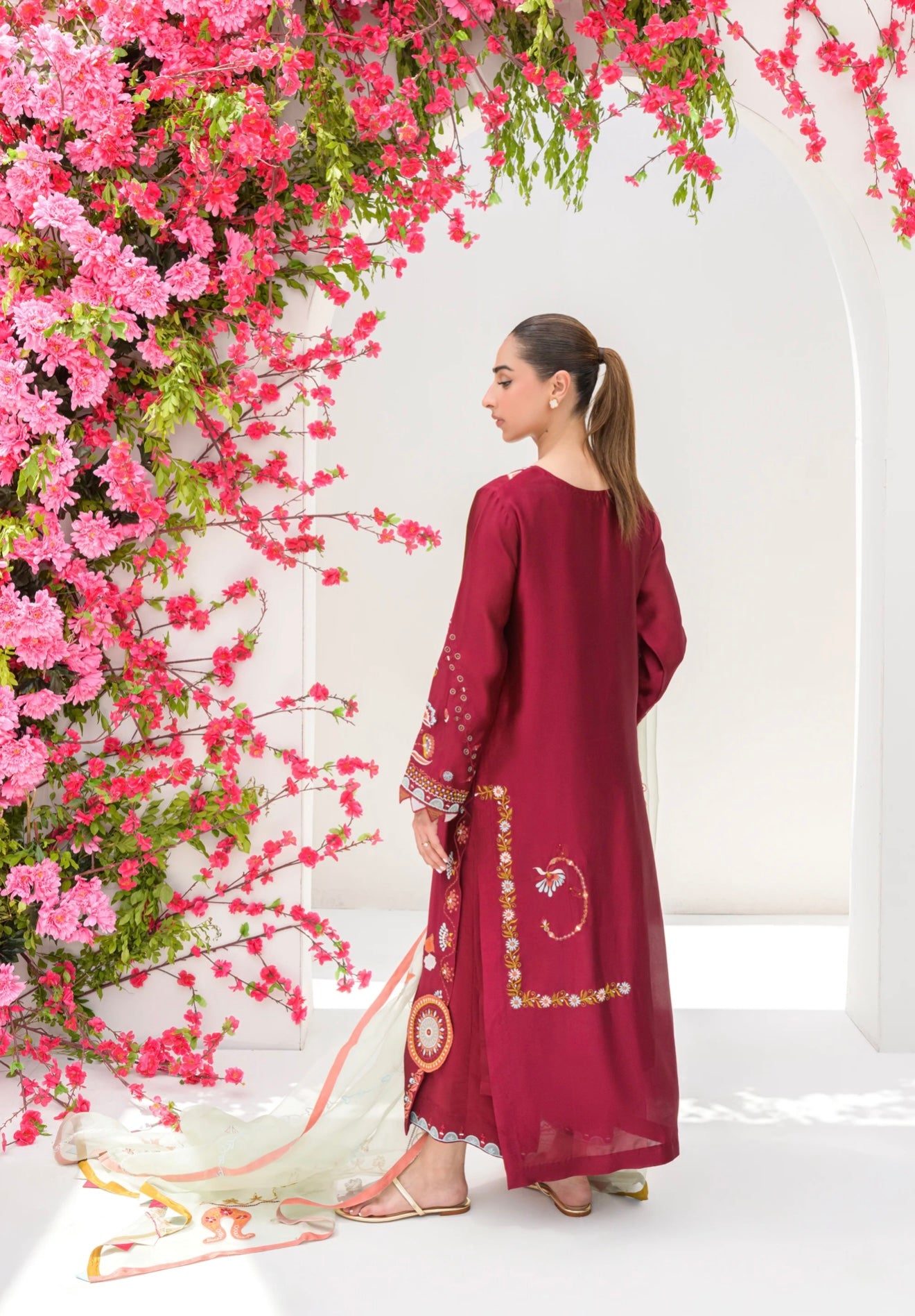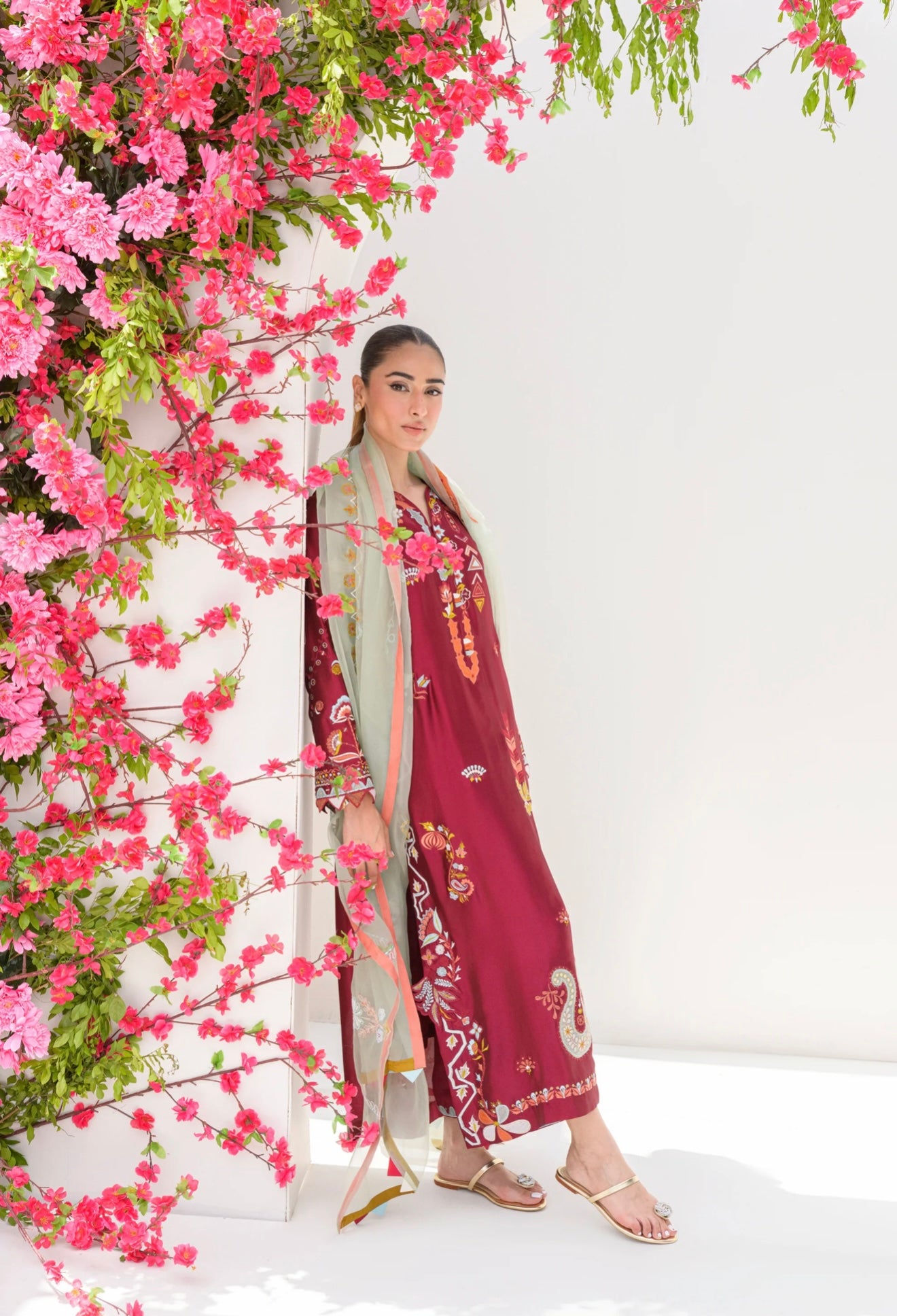 Cherry Pie is a deep maroon long shirt paired with an apple green dupatta. Both the shirt and dupatta are richly adorned with intricate machine embroidery in shades of ice blue, rust, and sage green.
