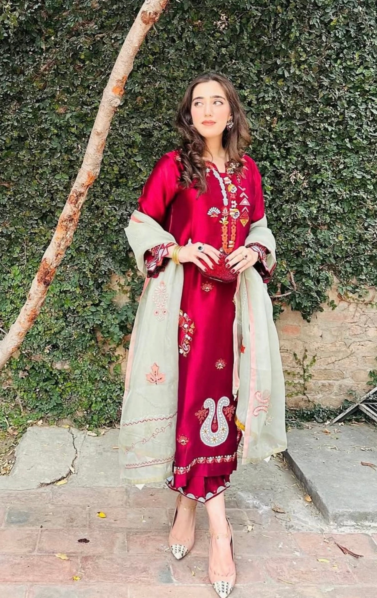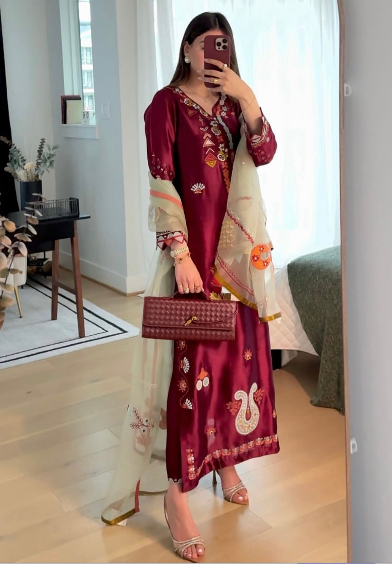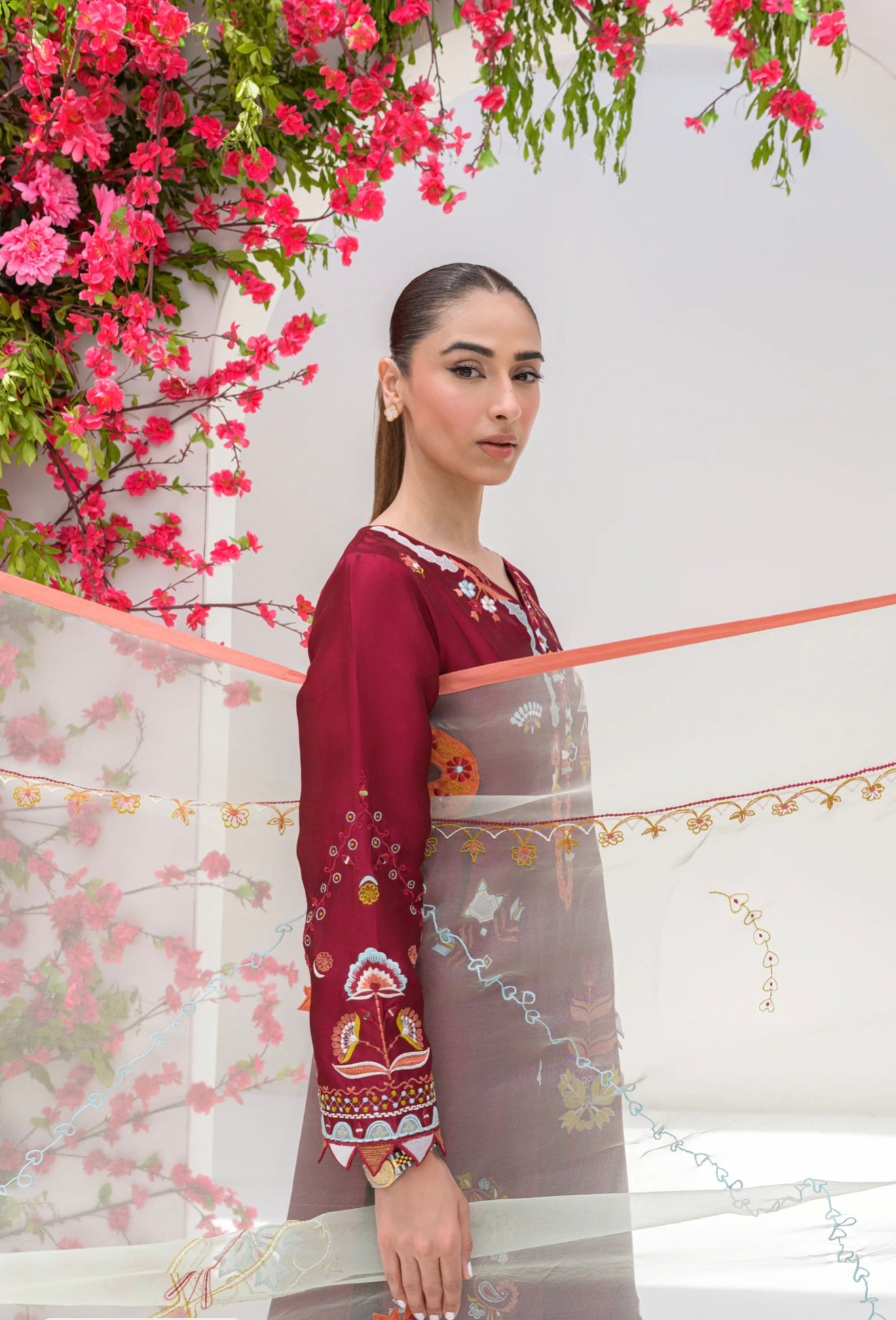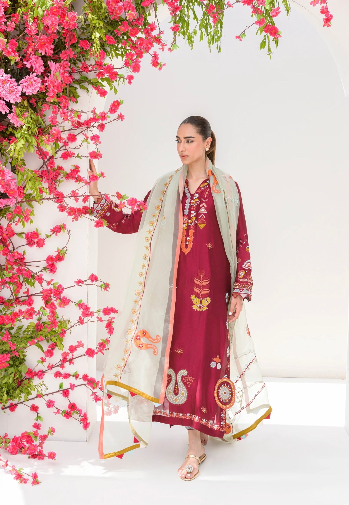 Cherry Pie is a deep maroon long shirt paired with an apple green dupatta. Both the shirt and dupatta are richly adorned with intricate machine embroidery in shades of ice blue, rust, and sage green.