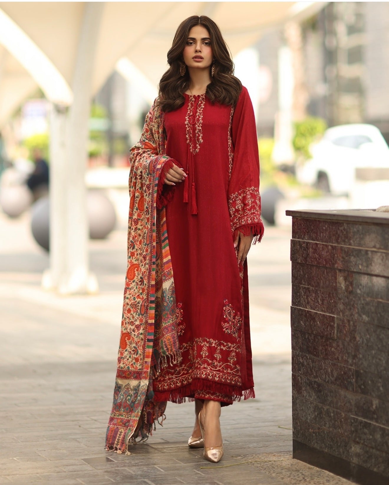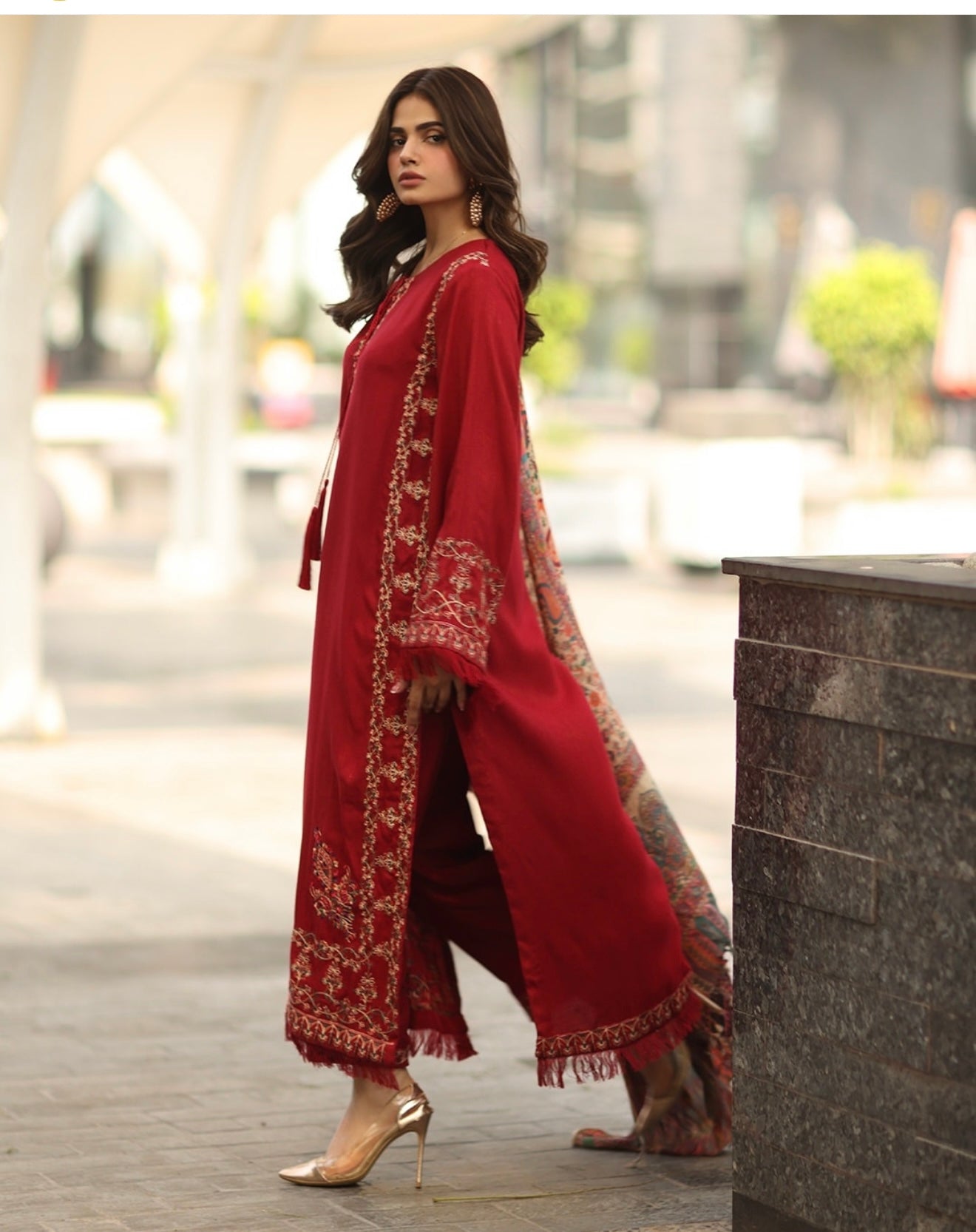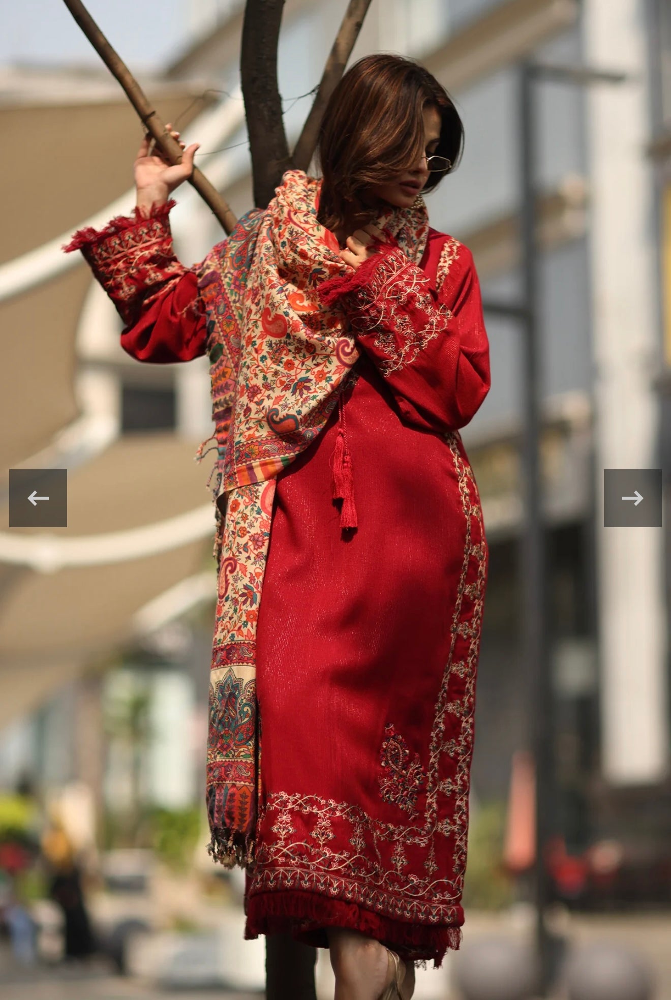 3 piece embroidered set with a round neckline having tassel and fray edges detail on sleeves and hem paired with straight pants and pashmina shawl.