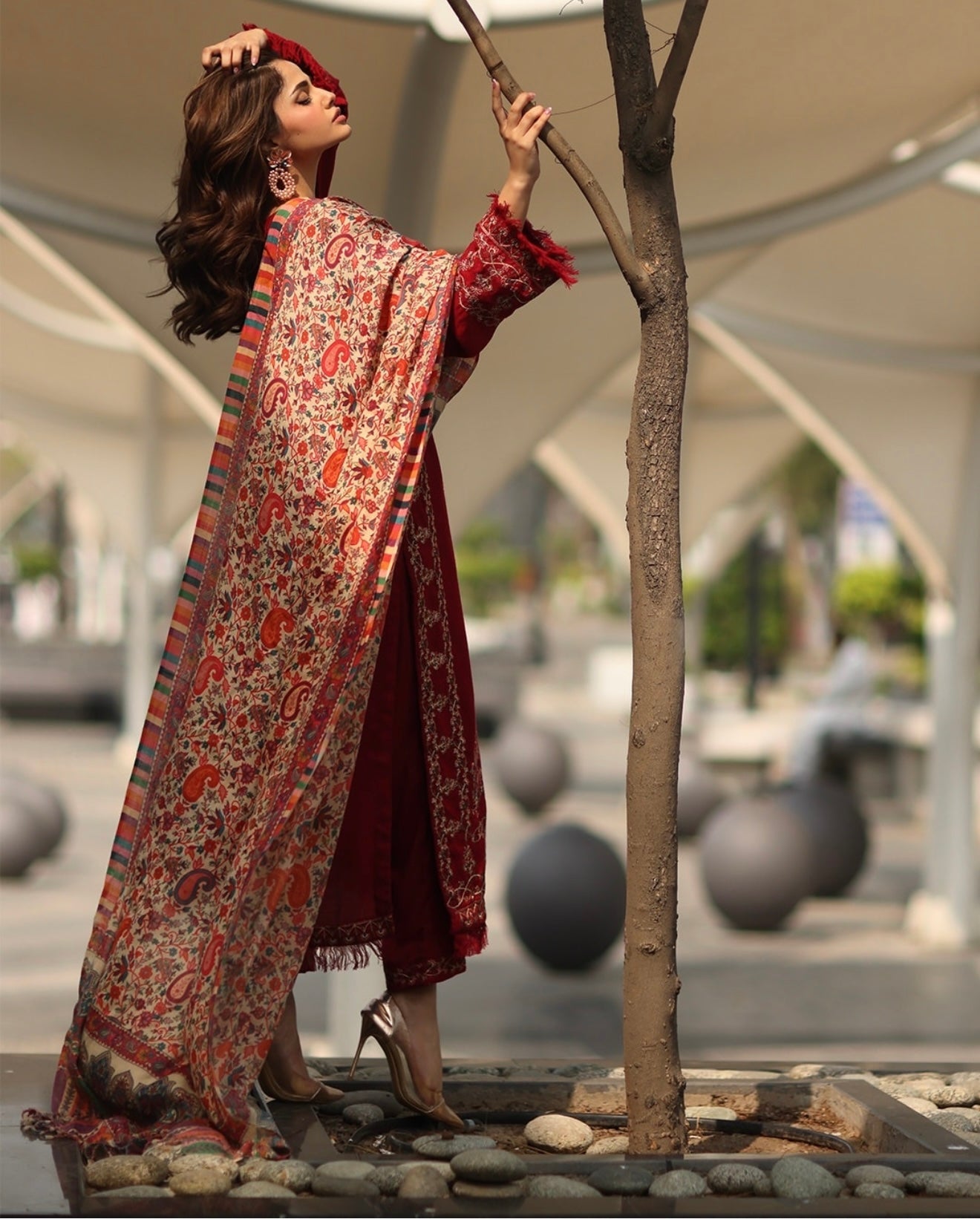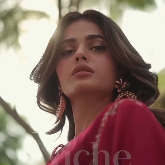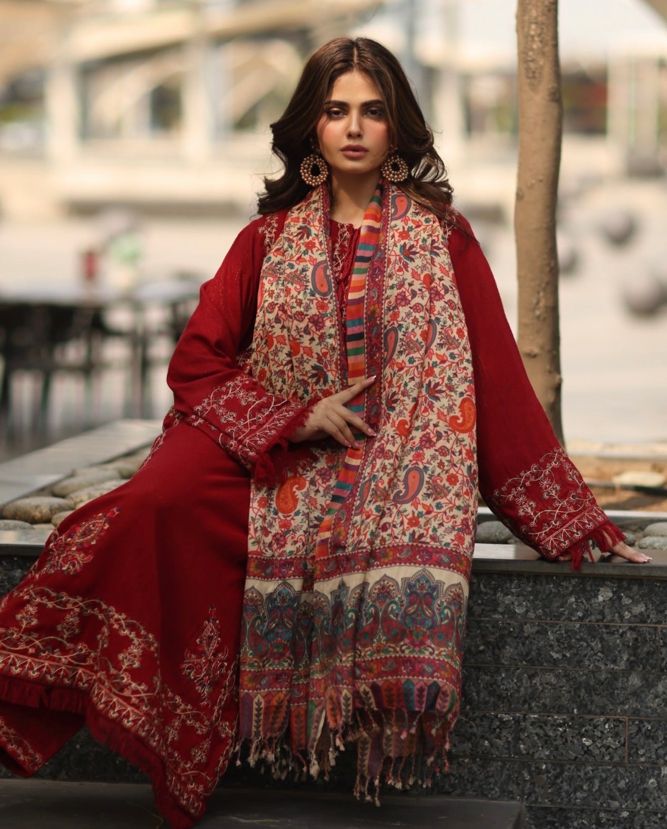 3 piece embroidered set with a round neckline having tassel and fray edges detail on sleeves and hem paired with straight pants and pashmina shawl.