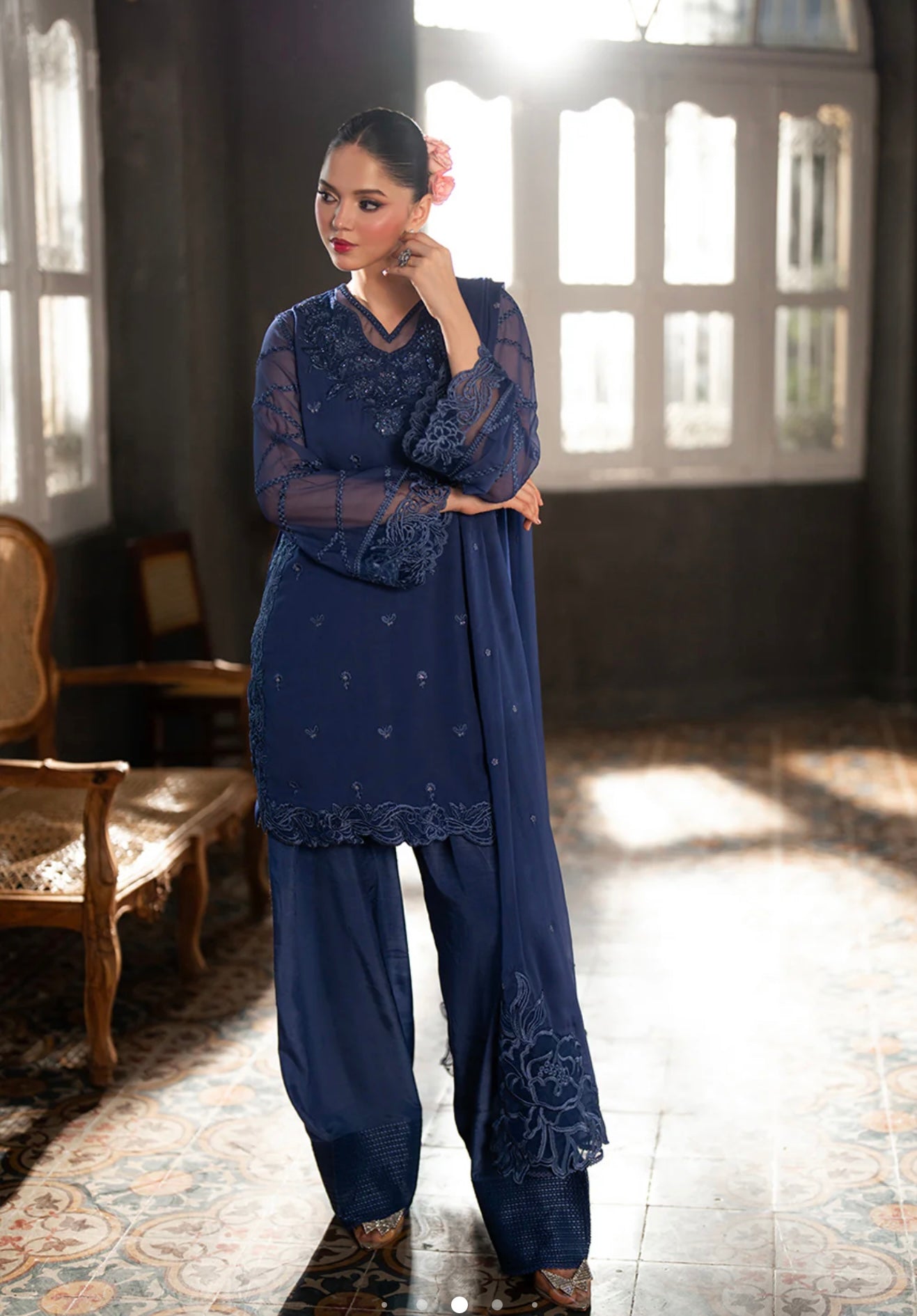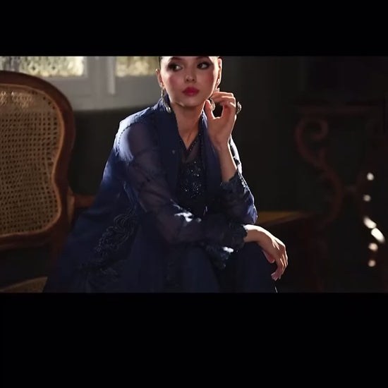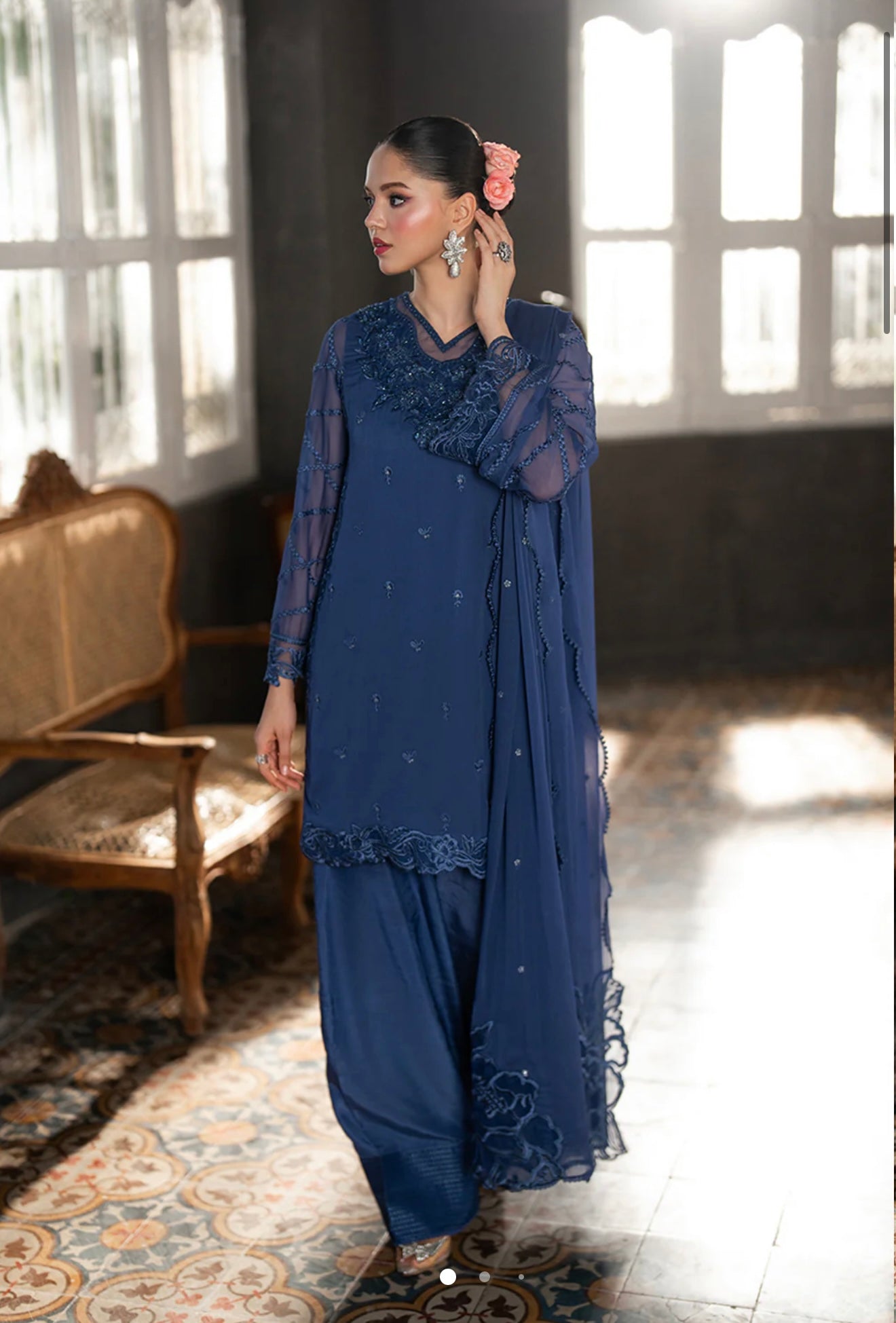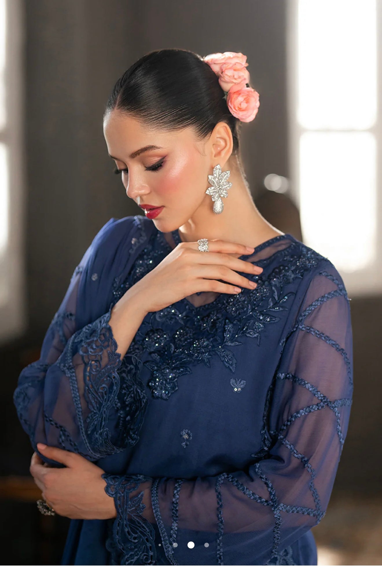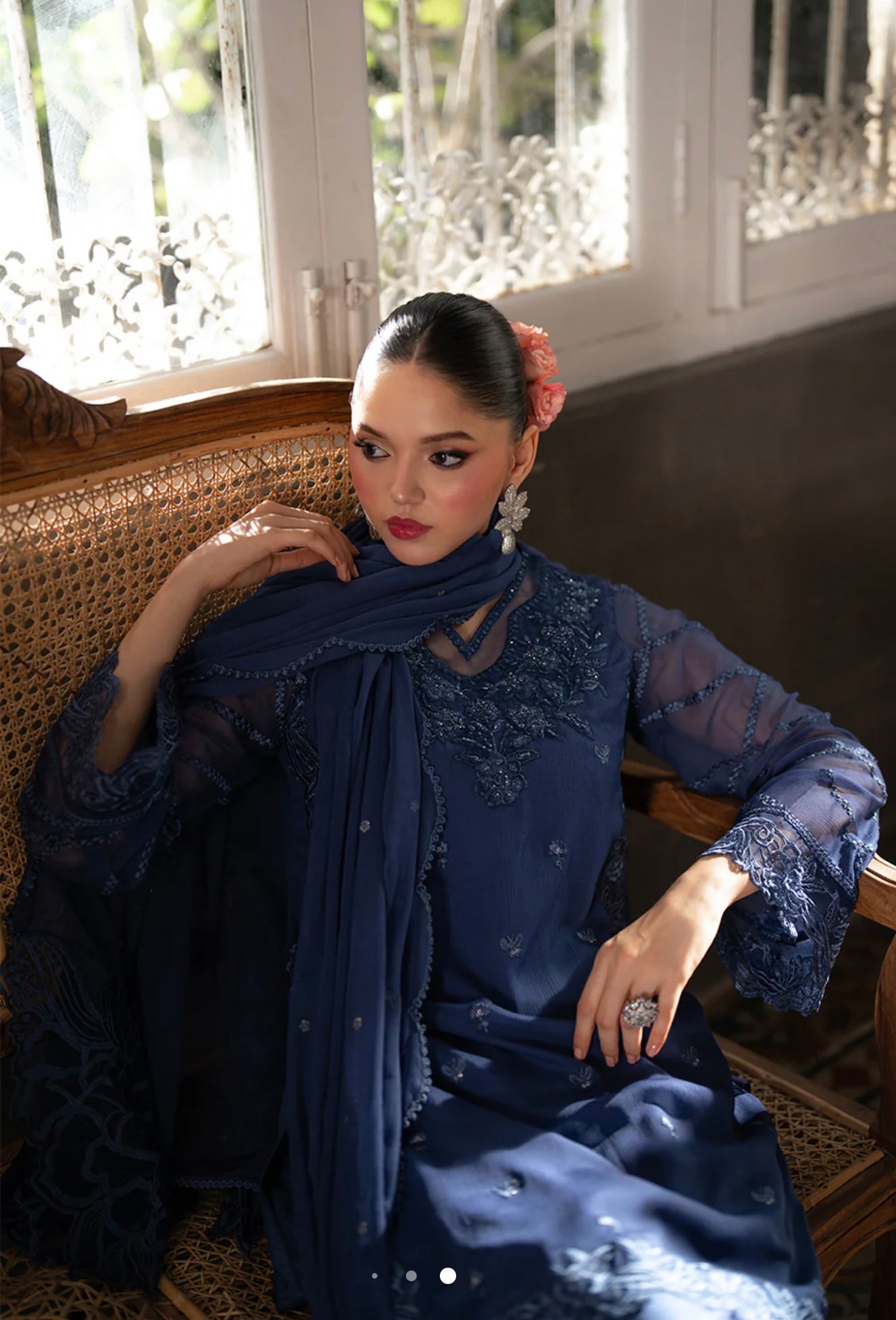 Cobalt Haze radiates a captivating charm in its rich cobalt blue chiffon fabric. The ensemble is elevated with a hand-embellished front patch. Paired with a dazzling sequins-embroidered chiffon dupatta. Finished with aflowing farshi shalwar