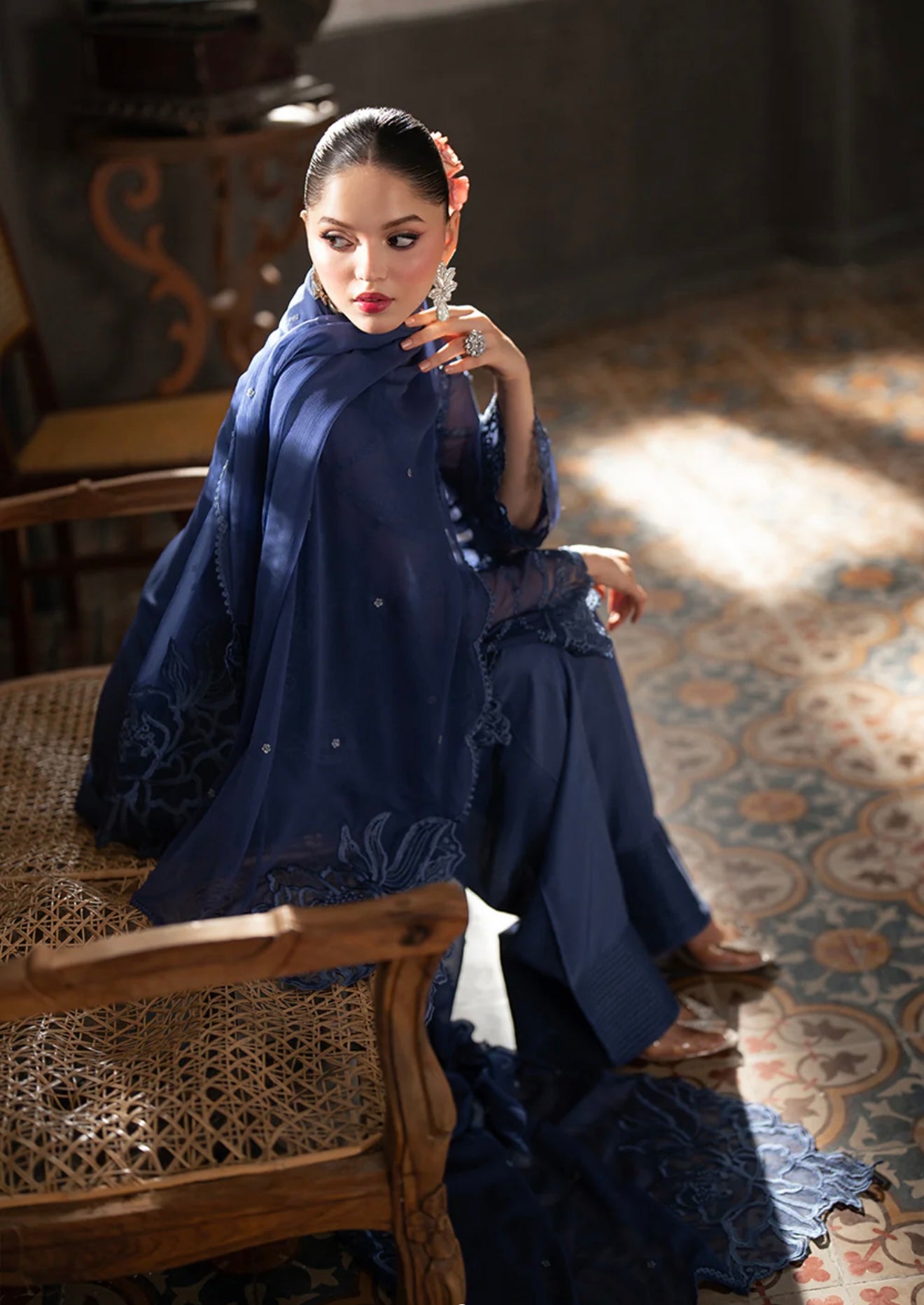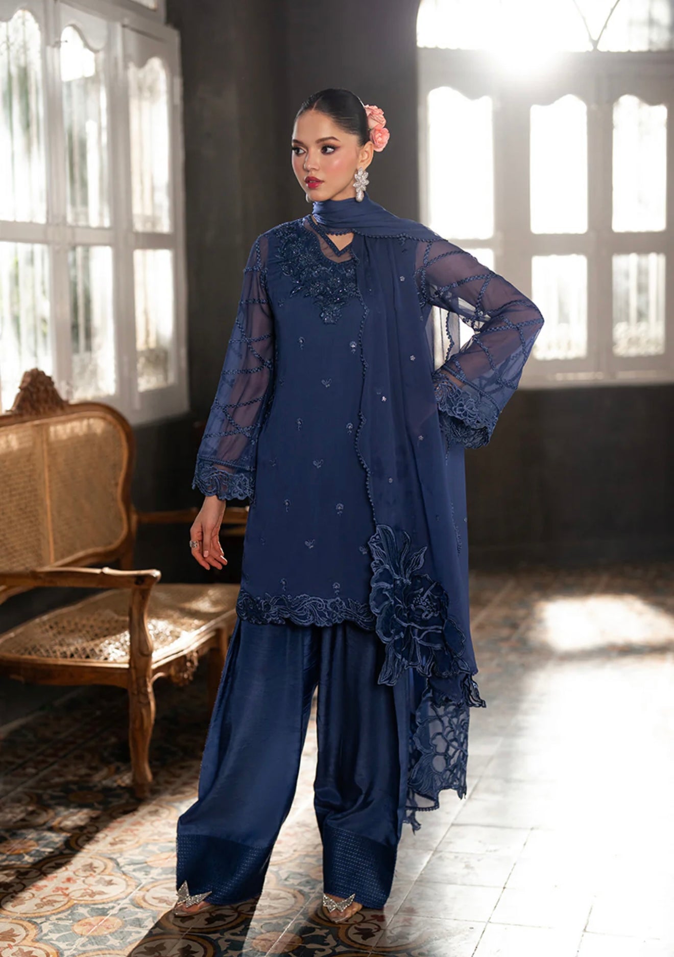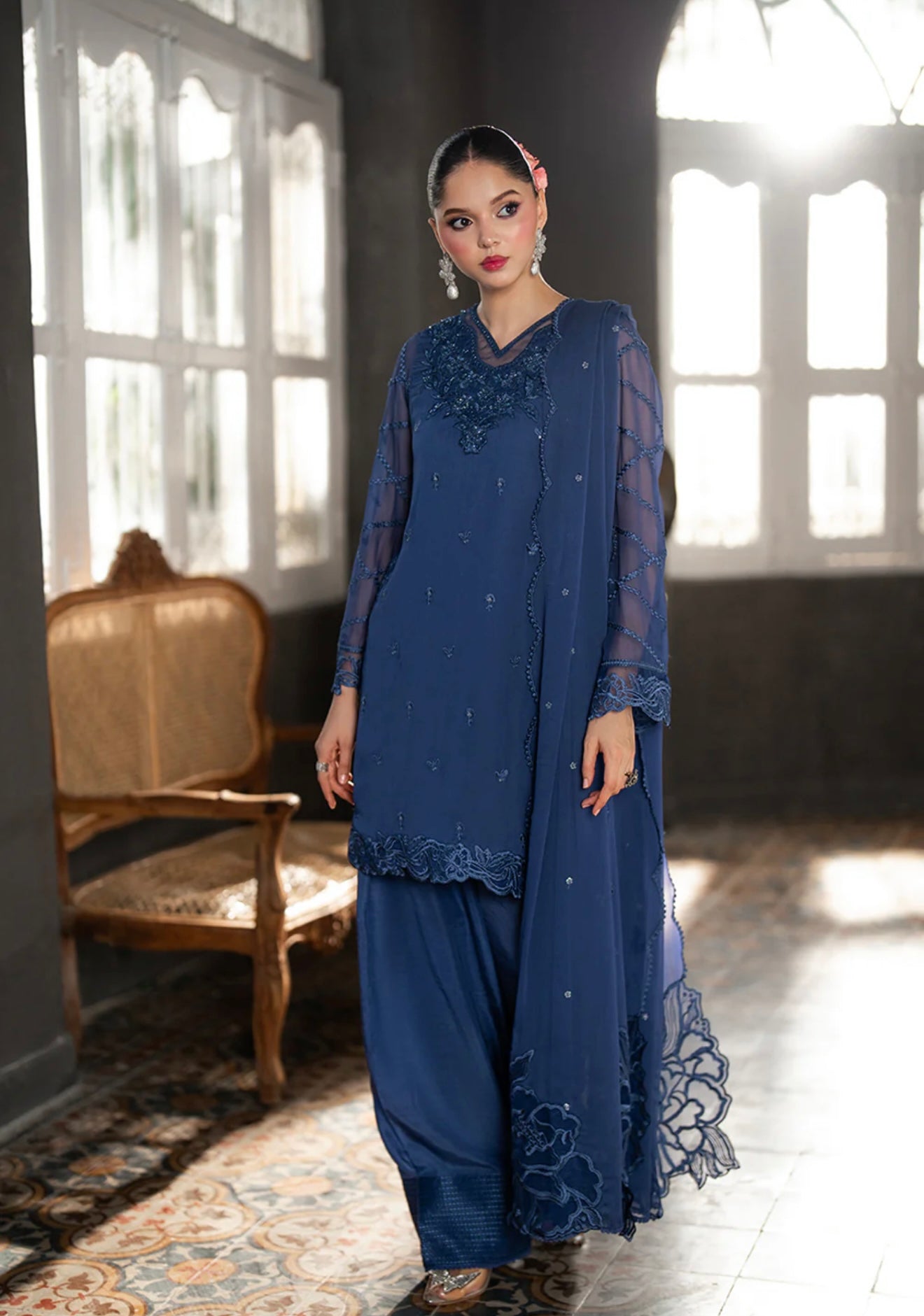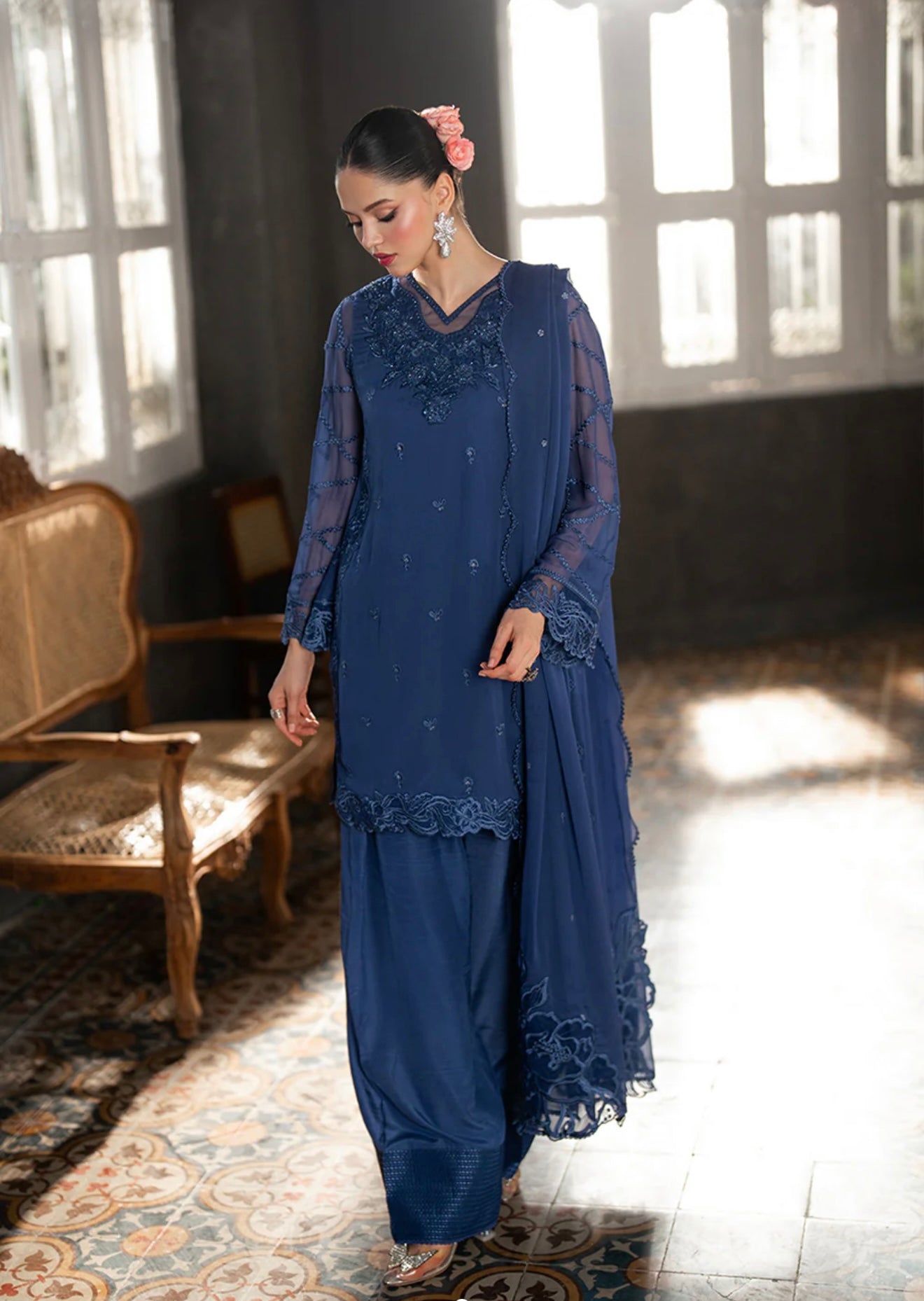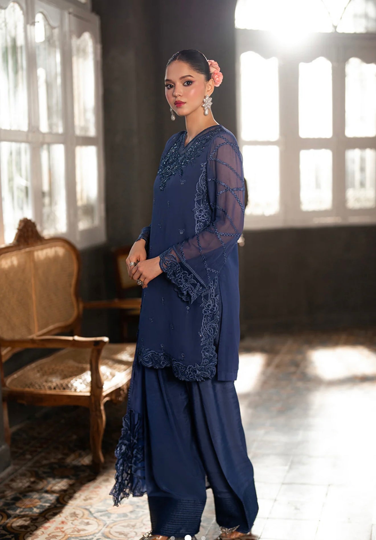 Cobalt Haze radiates a captivating charm in its rich cobalt blue chiffon fabric. The ensemble is elevated with a hand-embellished front patch. Paired with a dazzling sequins-embroidered chiffon dupatta. Finished with aflowing farshi shalwar