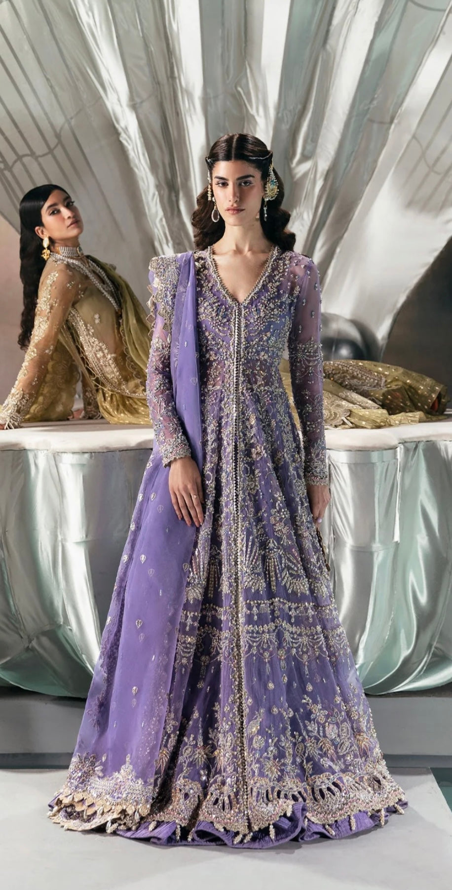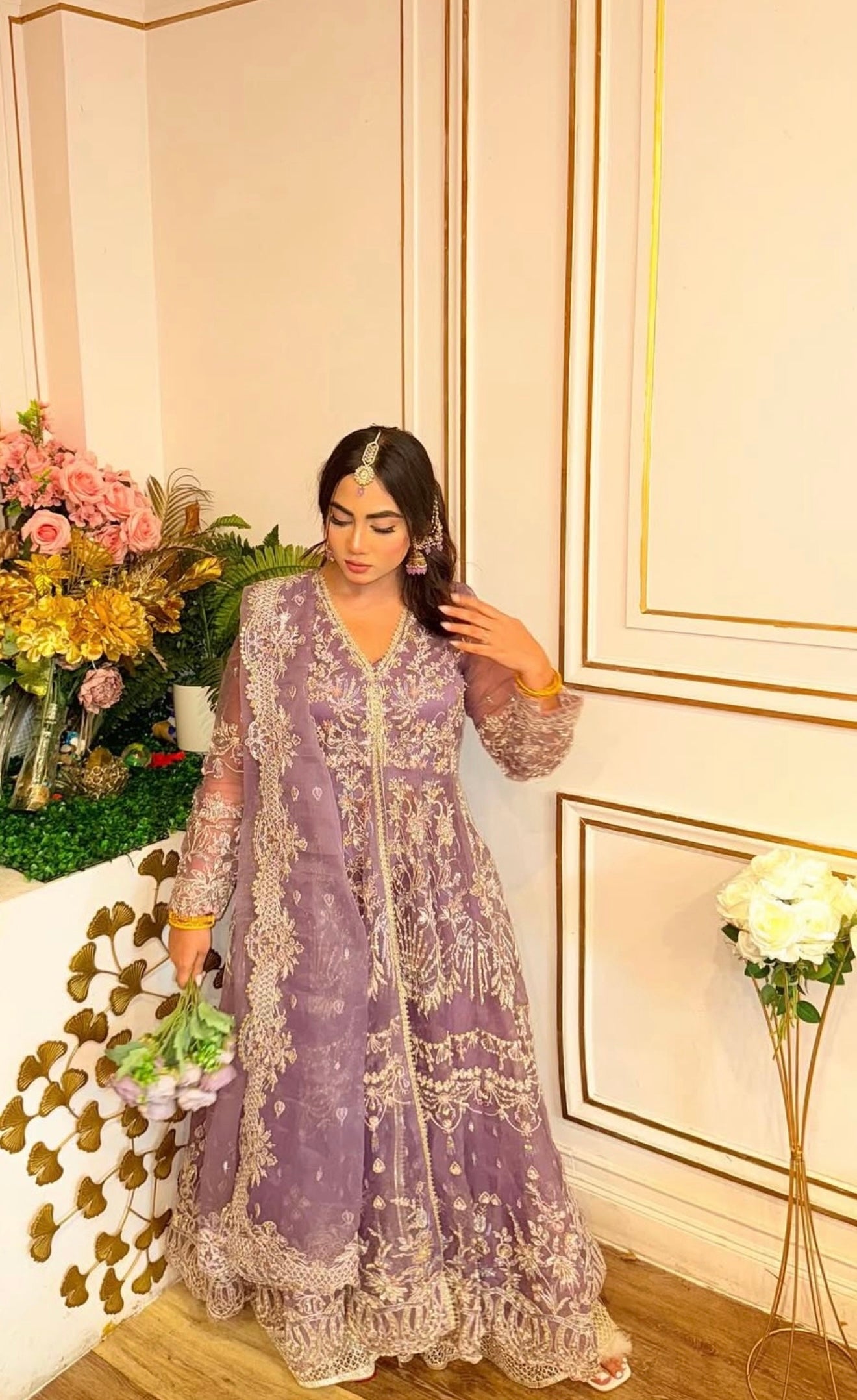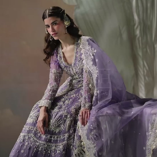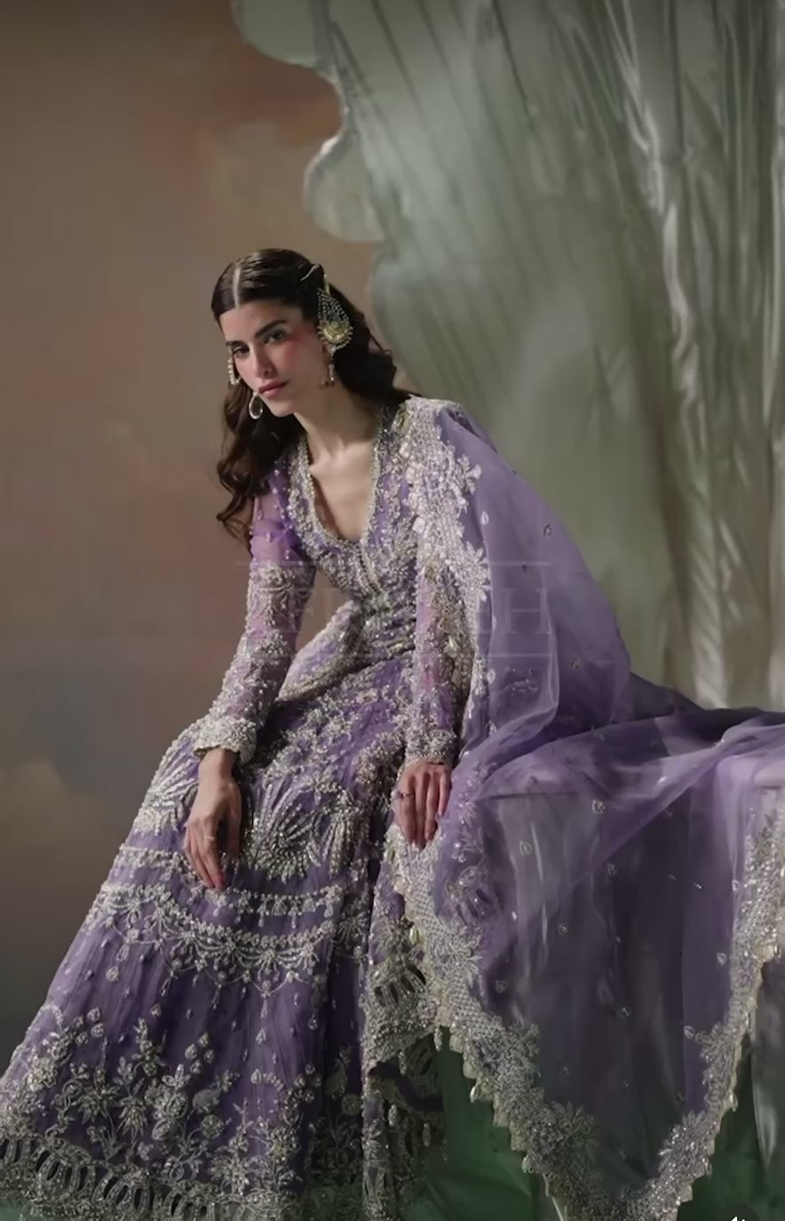 Crafted from soft organza, this peshwas features floral embroidered panels adorned with dull gold tilla, cutdana, pearls, and sequins hand-worked neatly onto it. Paired with a heavily embellished organza dupatta.