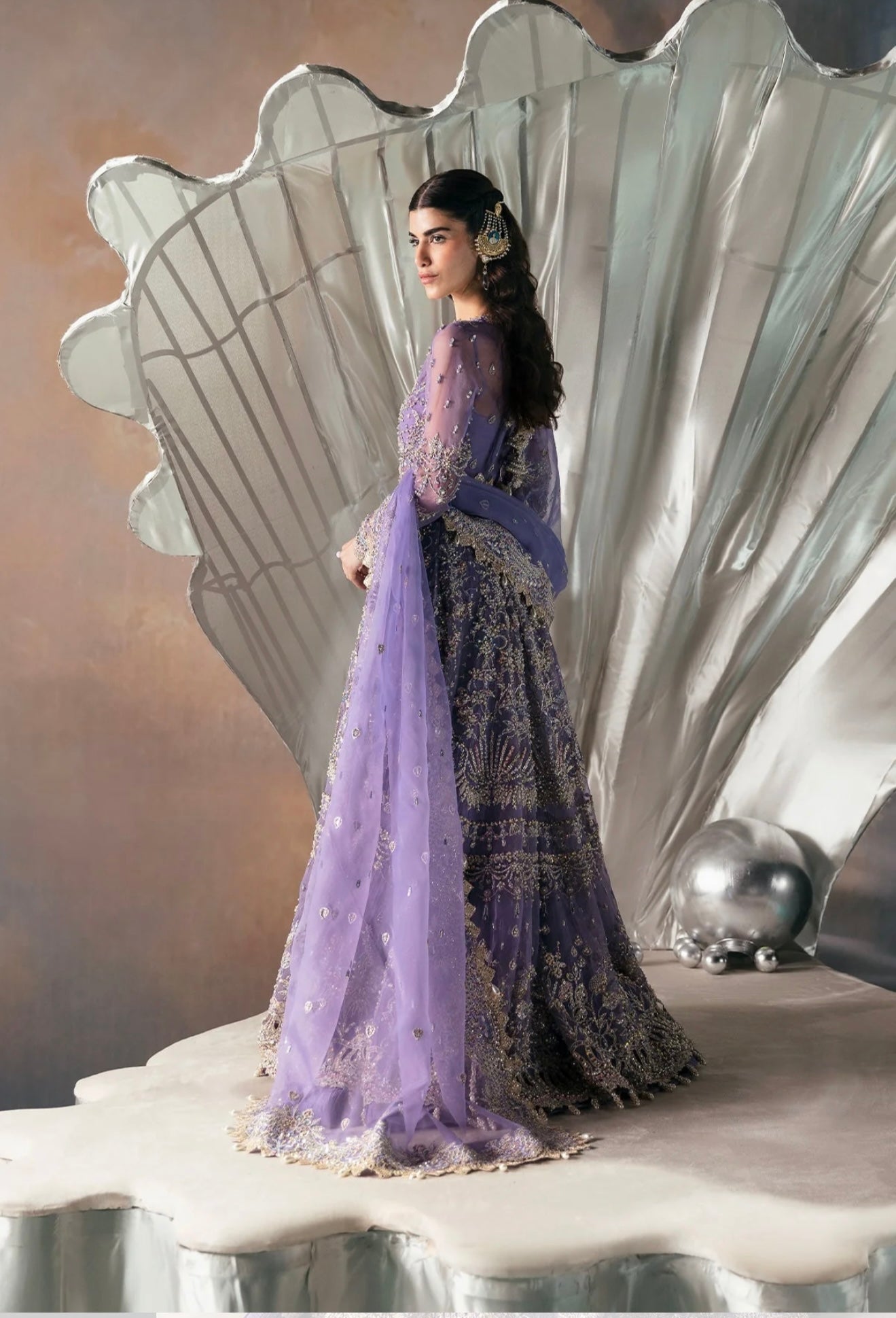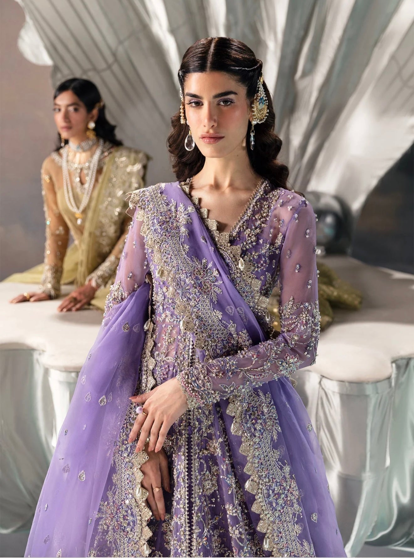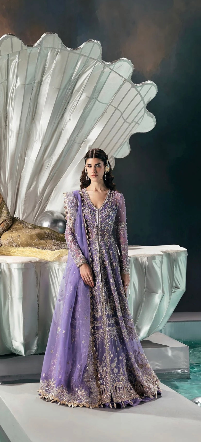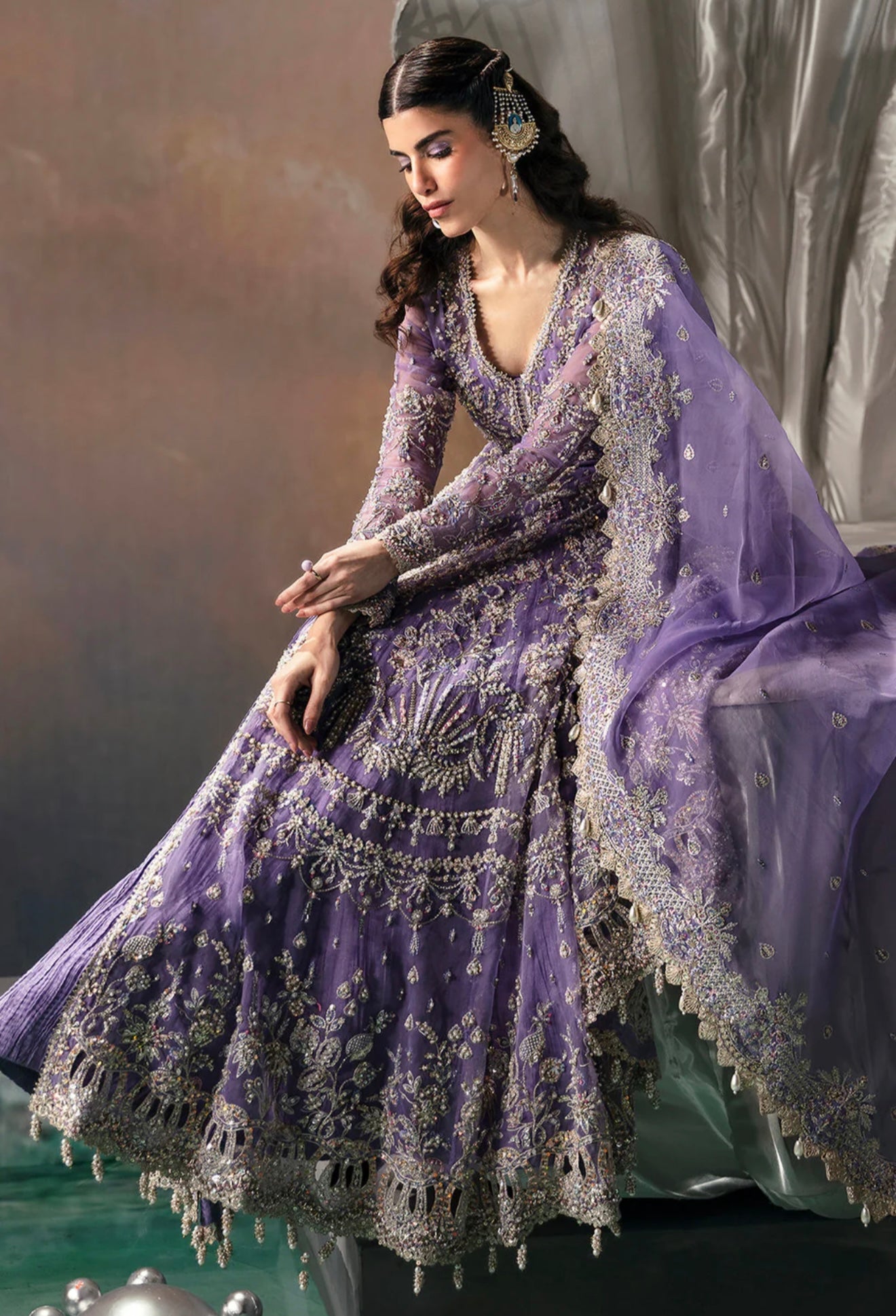 Crafted from soft organza, this peshwas features floral embroidered panels adorned with dull gold tilla, cutdana, pearls, and sequins hand-worked neatly onto it. Paired with a heavily embellished organza dupatta.