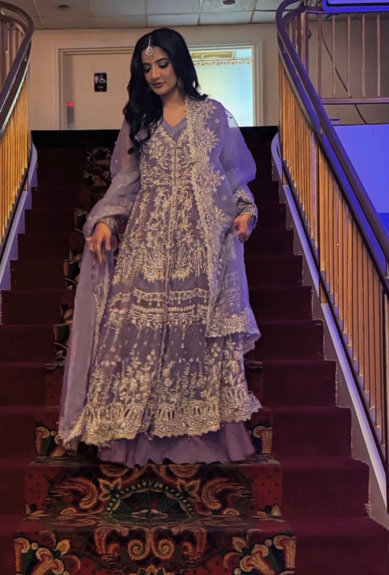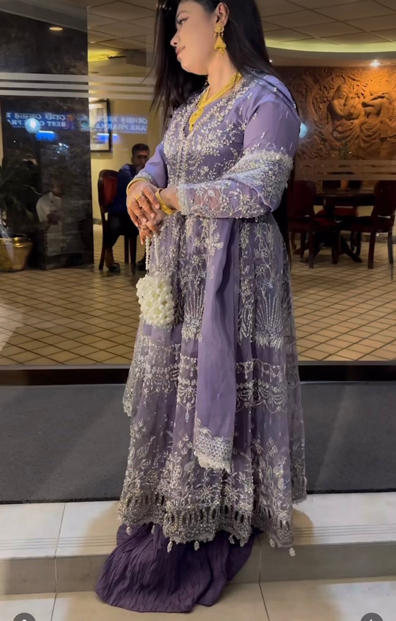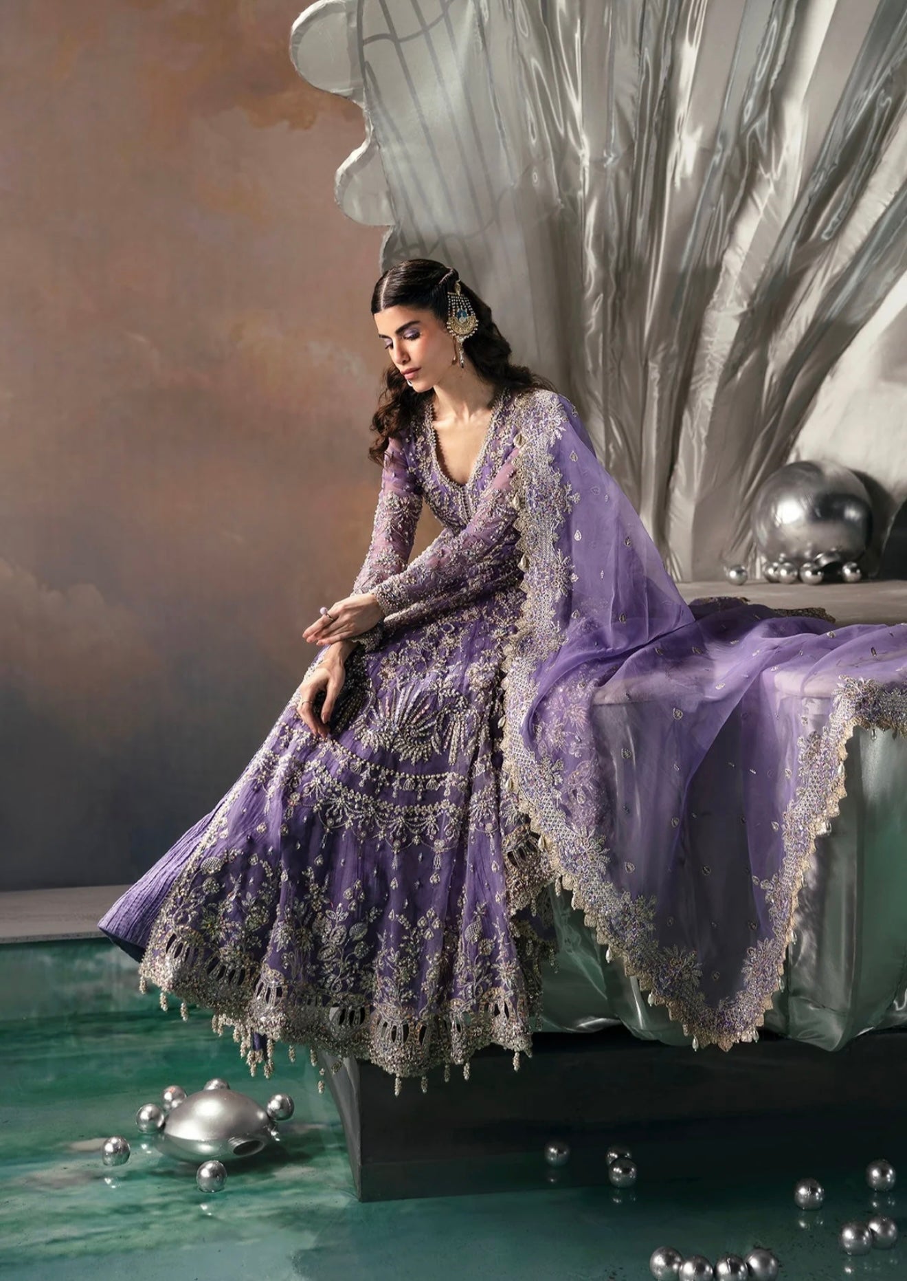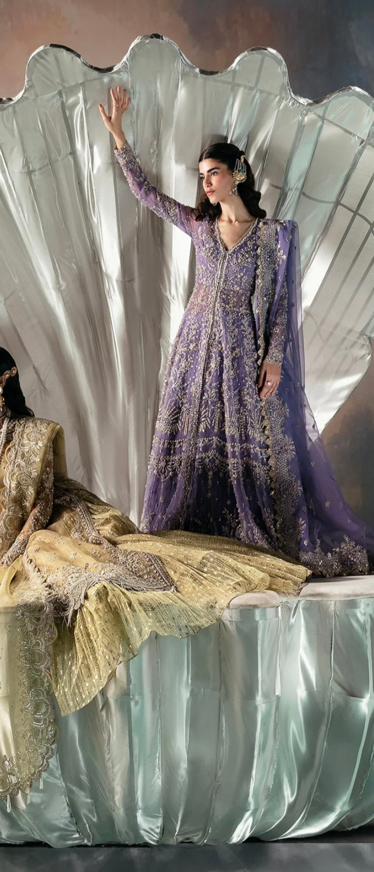 Crafted from soft organza, this peshwas features floral embroidered panels adorned with dull gold tilla, cutdana, pearls, and sequins hand-worked neatly onto it. Paired with a heavily embellished organza dupatta.
