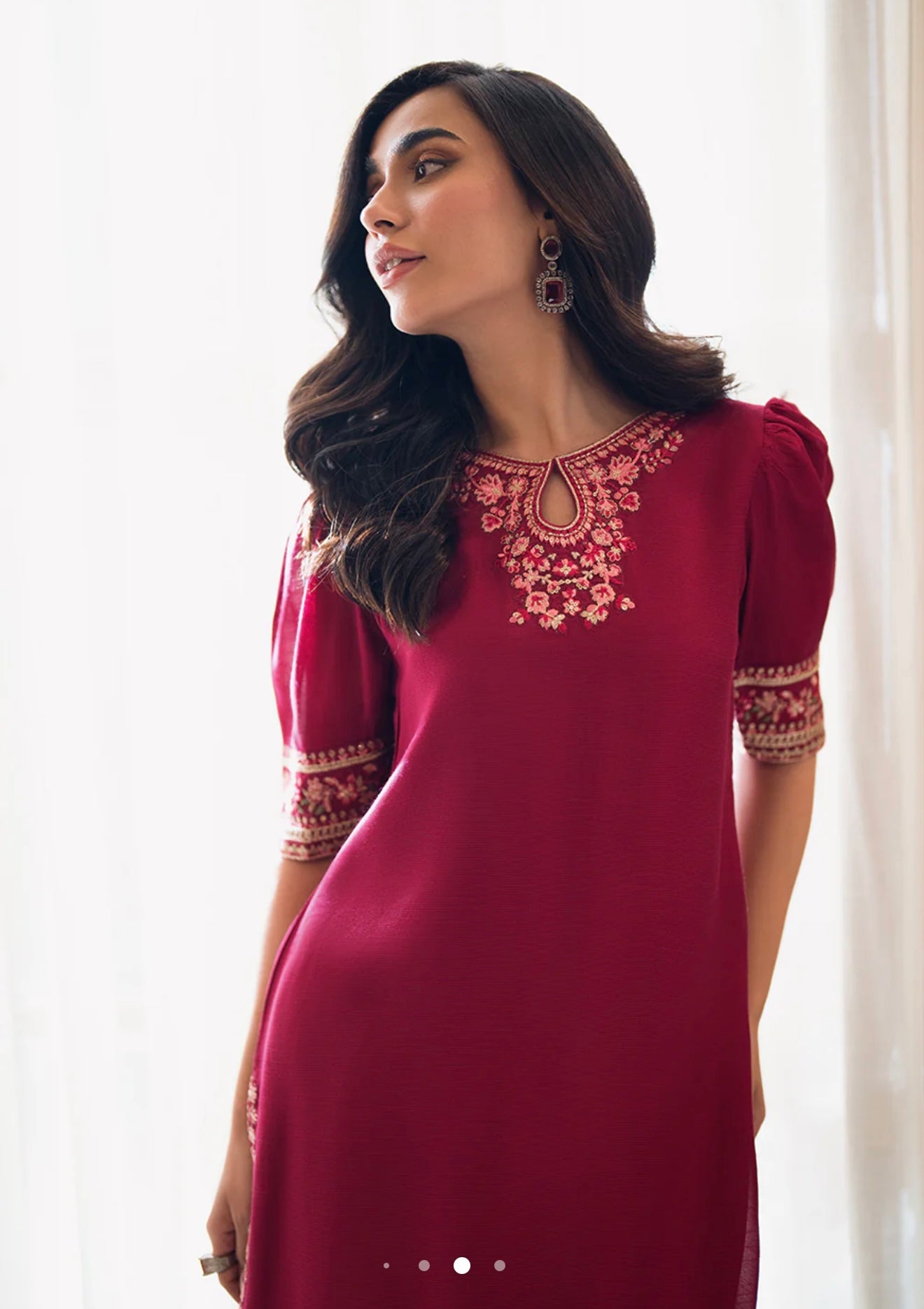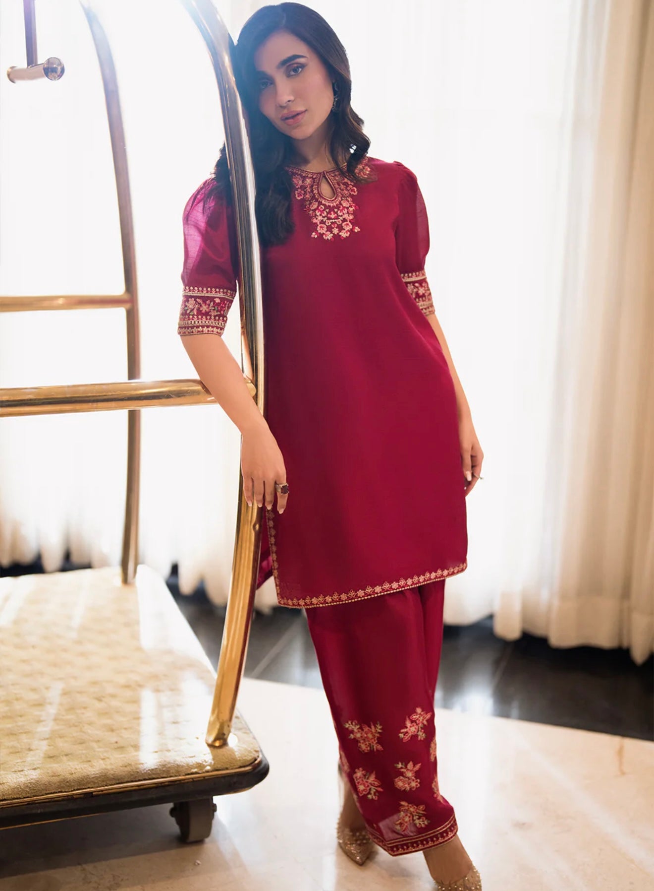 Fuchsia Grace – a vibrant magenta two-piece crafted from luxurious raw silk. Paired with a classic shalwar.