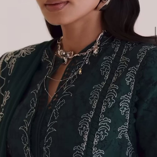 Peacock green A-line cotton shirt featuring a crew neckline and bell sleeves. It showcases detailed borders with dori embroidery and layered techniques of knots and patterns on the front. The shirt also includes contrasting white embroidery, a double overlay, and handmade lace details at the hem and on the sleeves.