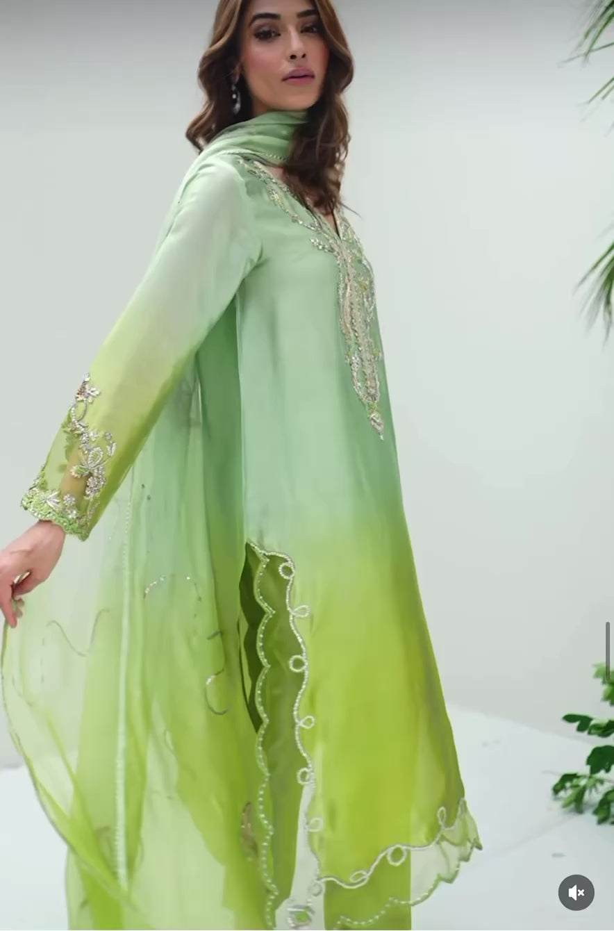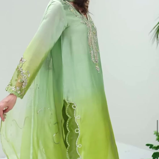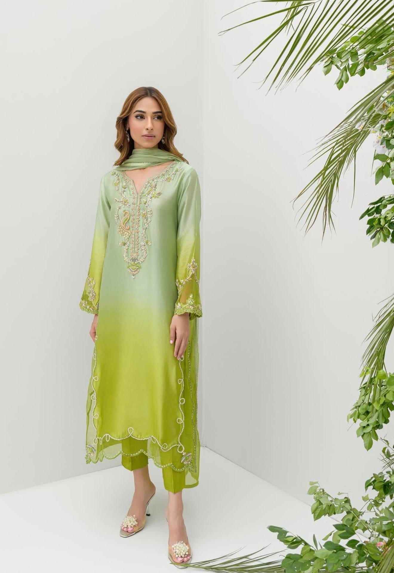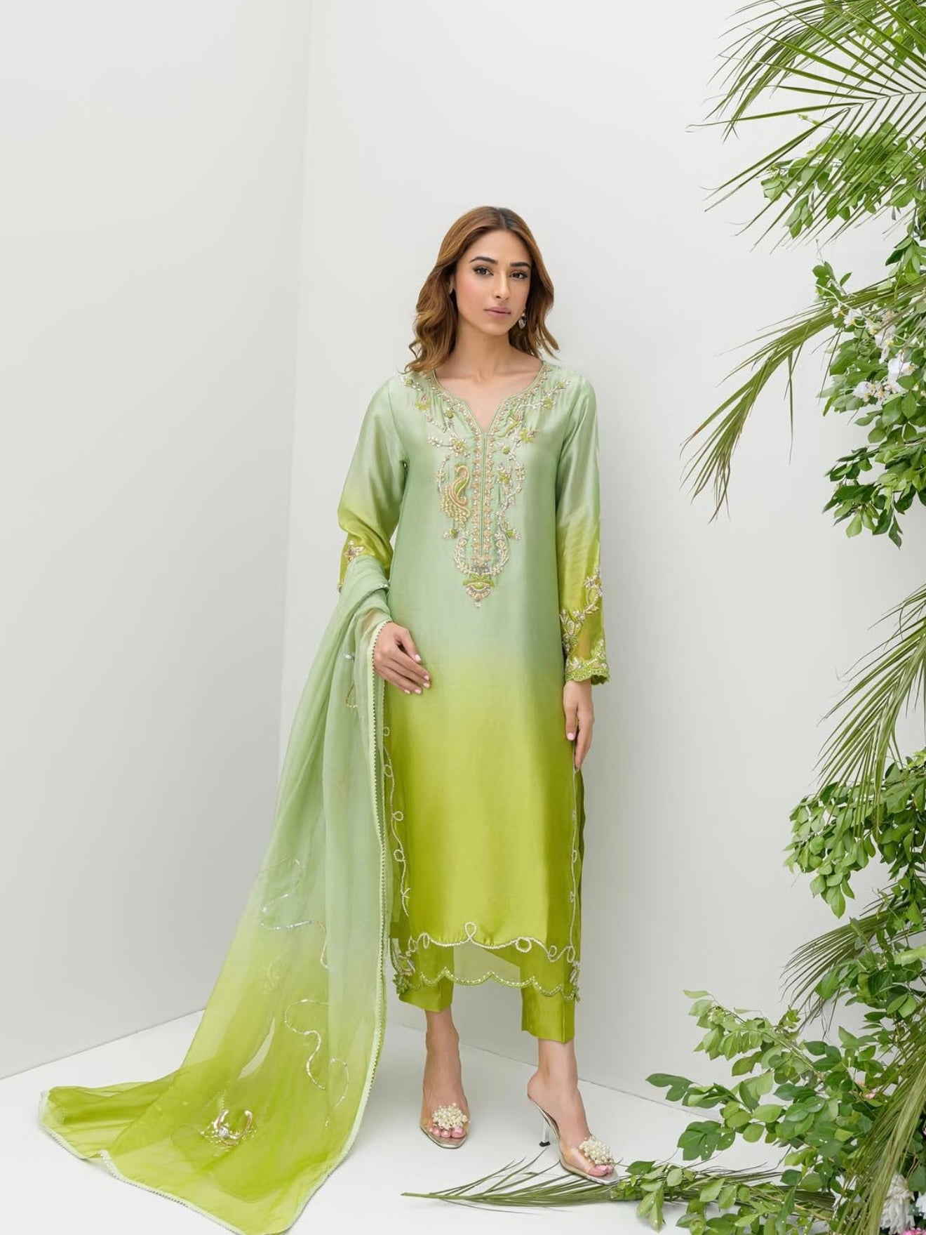 A lime-colored ombre long shirt, which transitions from a lighter to a deeper shade of green. With straight, narrow-cut pants and organza dupatta. The fabric is crafted from pure sheesha silk. Adorning the outfit is intricate silver kora work and Swarovski embellishments, which are strategically placed along the hemline, border, and dupatta.
