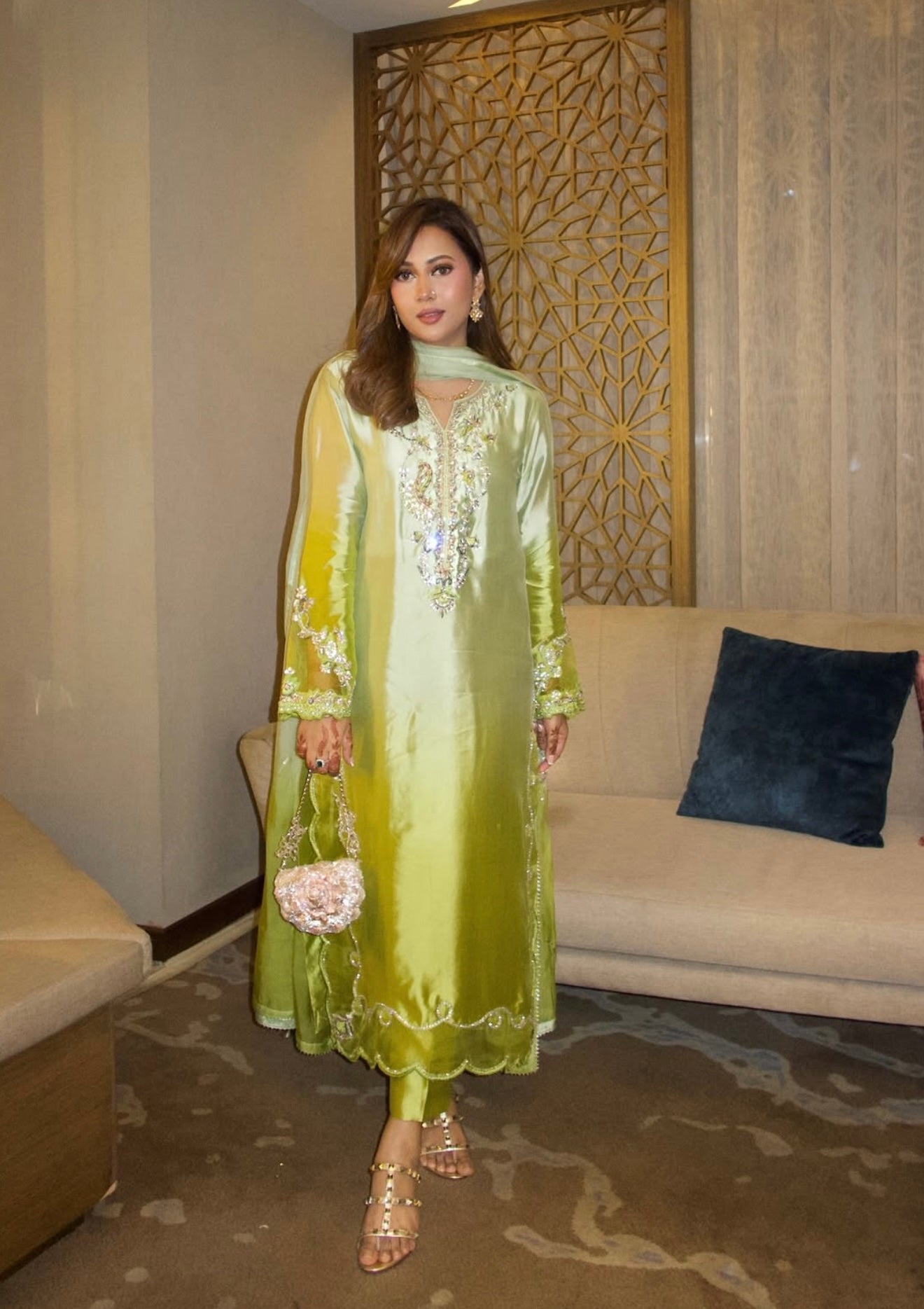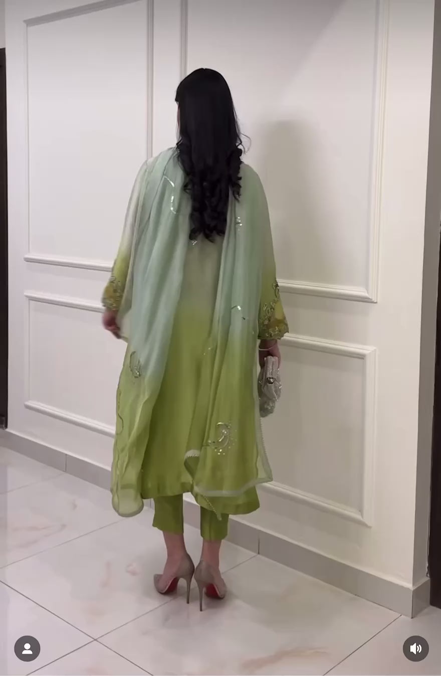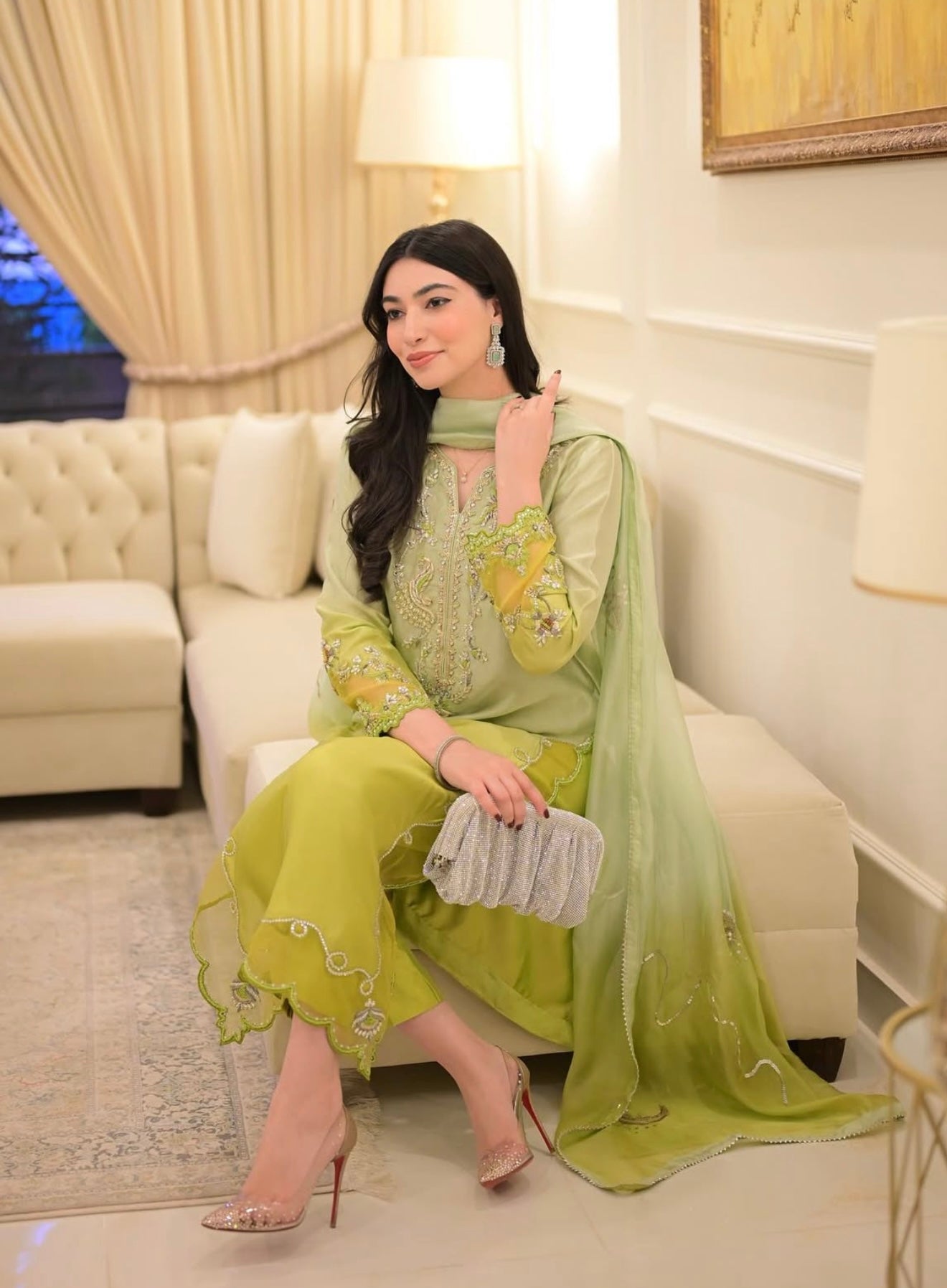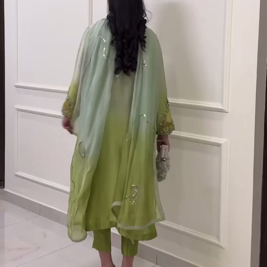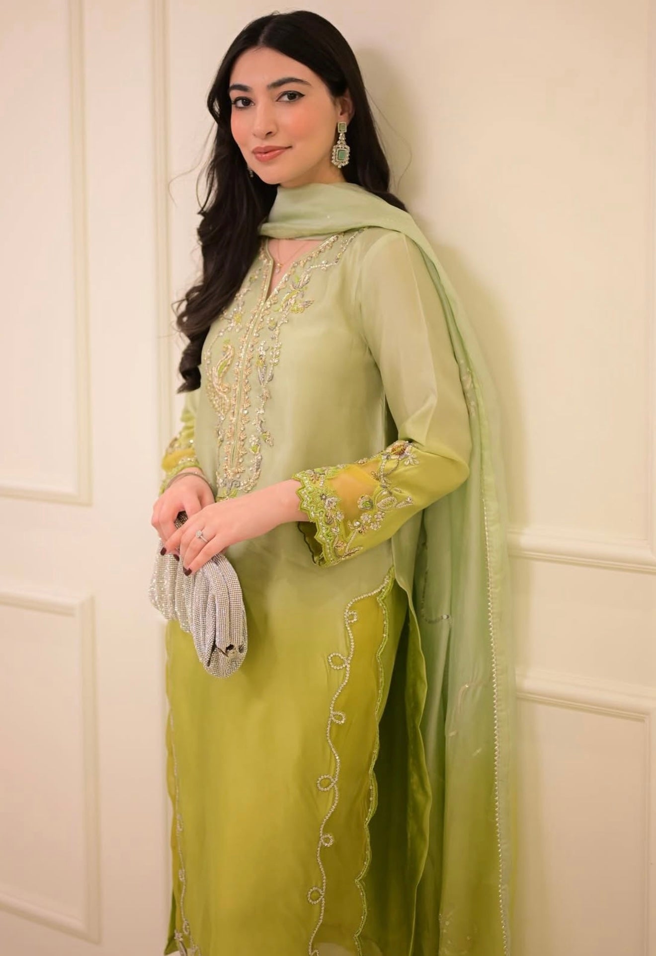 A lime-colored ombre long shirt, which transitions from a lighter to a deeper shade of green. With straight, narrow-cut pants and organza dupatta. The fabric is crafted from pure sheesha silk. Adorning the outfit is intricate silver kora work and Swarovski embellishments, which are strategically placed along the hemline, border, and dupatta.