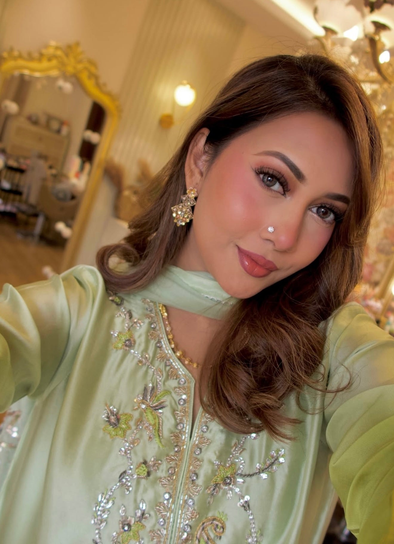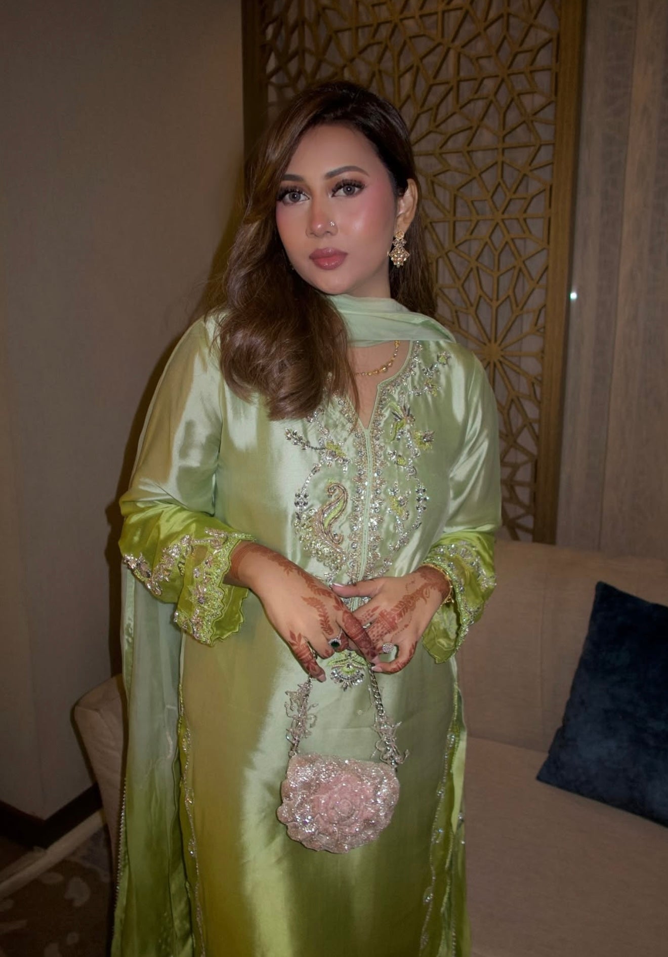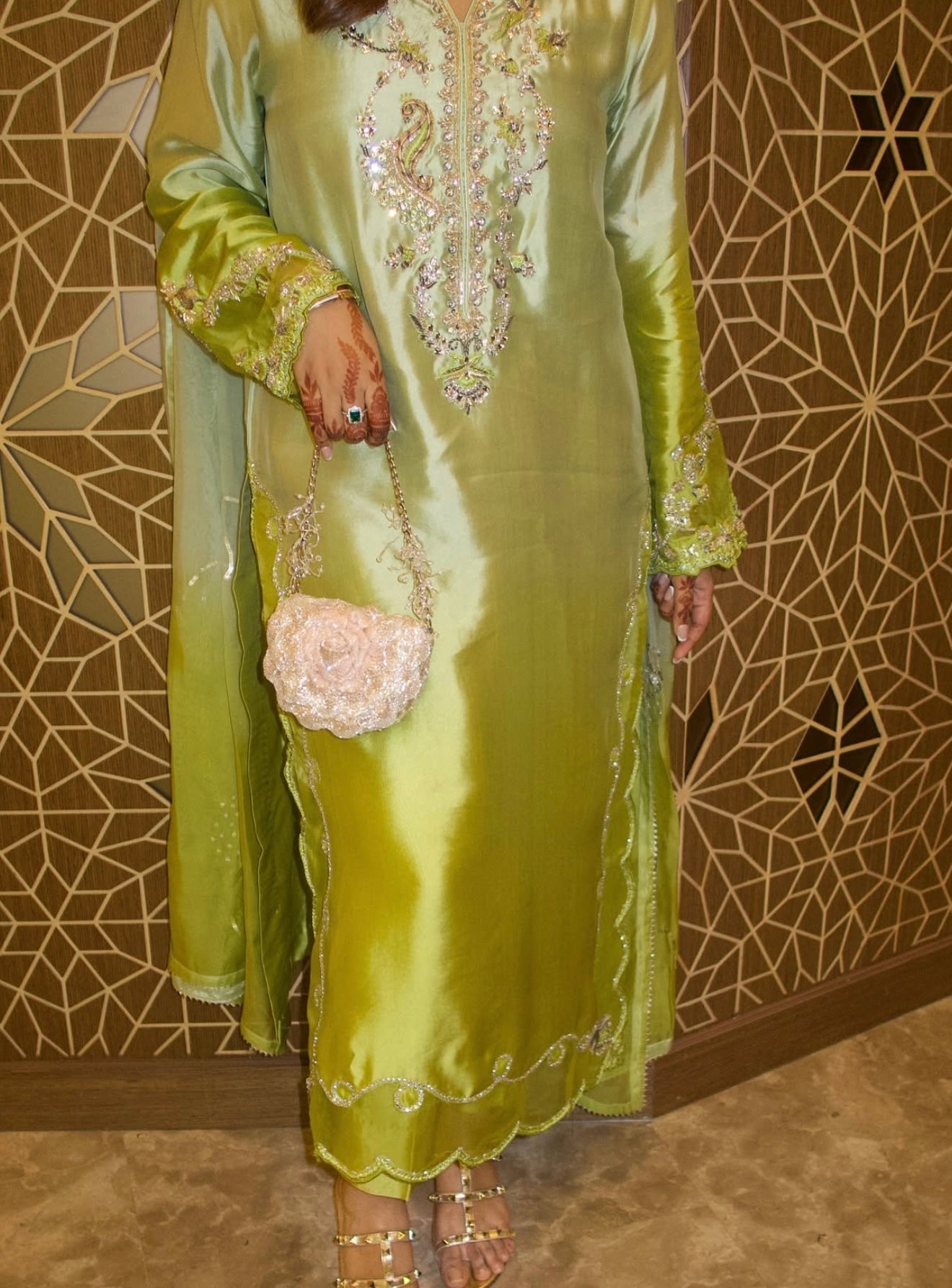 A lime-colored ombre long shirt, which transitions from a lighter to a deeper shade of green. With straight, narrow-cut pants and organza dupatta. The fabric is crafted from pure sheesha silk. Adorning the outfit is intricate silver kora work and Swarovski embellishments, which are strategically placed along the hemline, border, and dupatta.