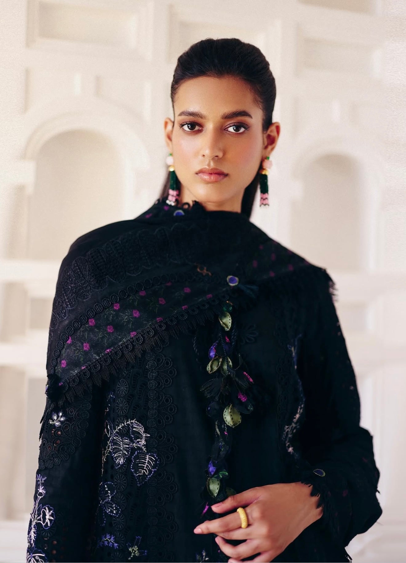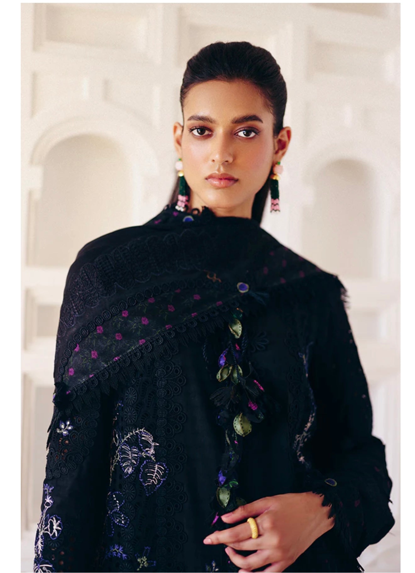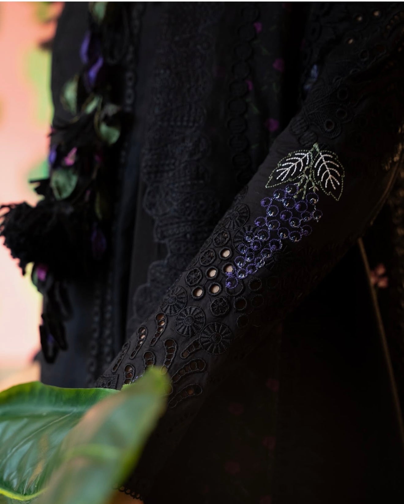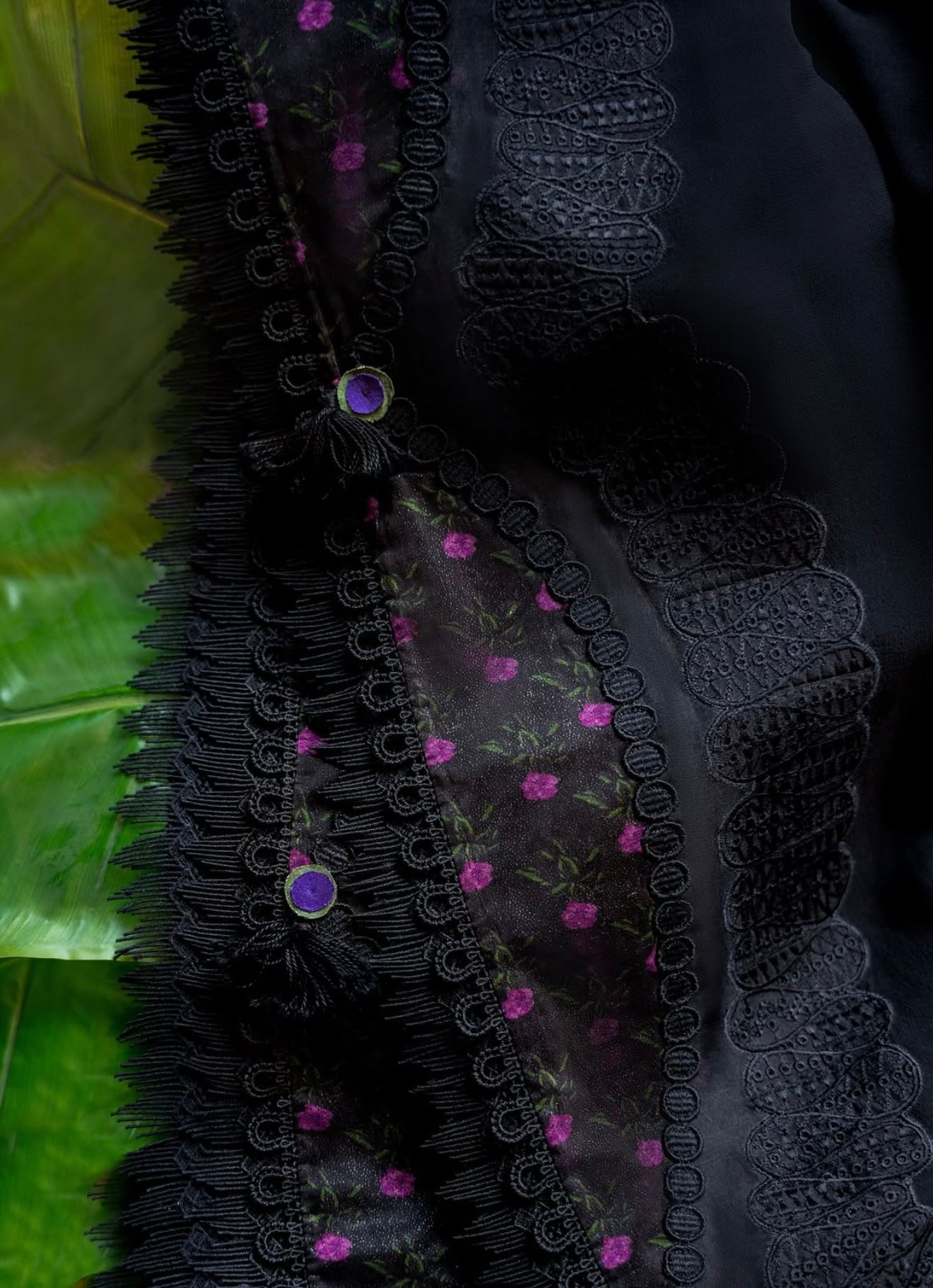 Midnight Black cotton shirt featuring a close-to-neck neckline. Marori detail on the front, with tassels hanging from the neck. Embroidered shirt with lace details. Moroccan floral embroidery, and the sleeves are fitted. It comes with a slip.