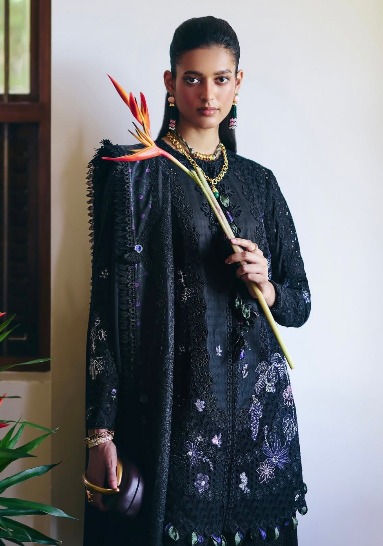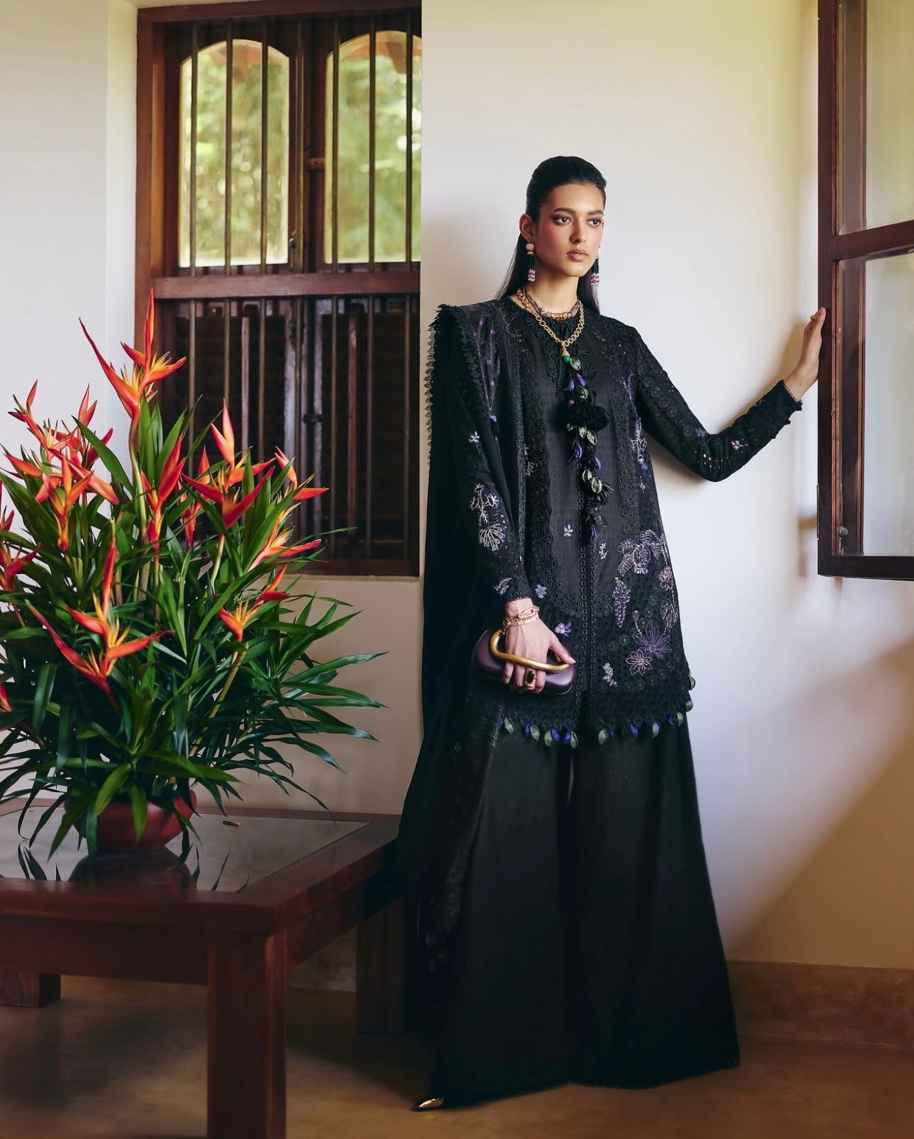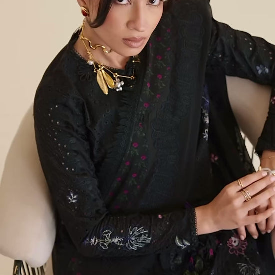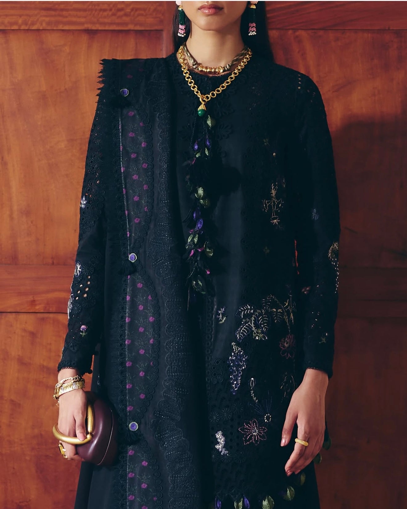 Midnight Black cotton shirt featuring a close-to-neck neckline. Marori detail on the front, with tassels hanging from the neck. Embroidered shirt with lace details. Moroccan floral embroidery, and the sleeves are fitted. It comes with a slip.
