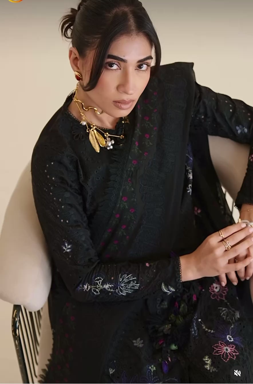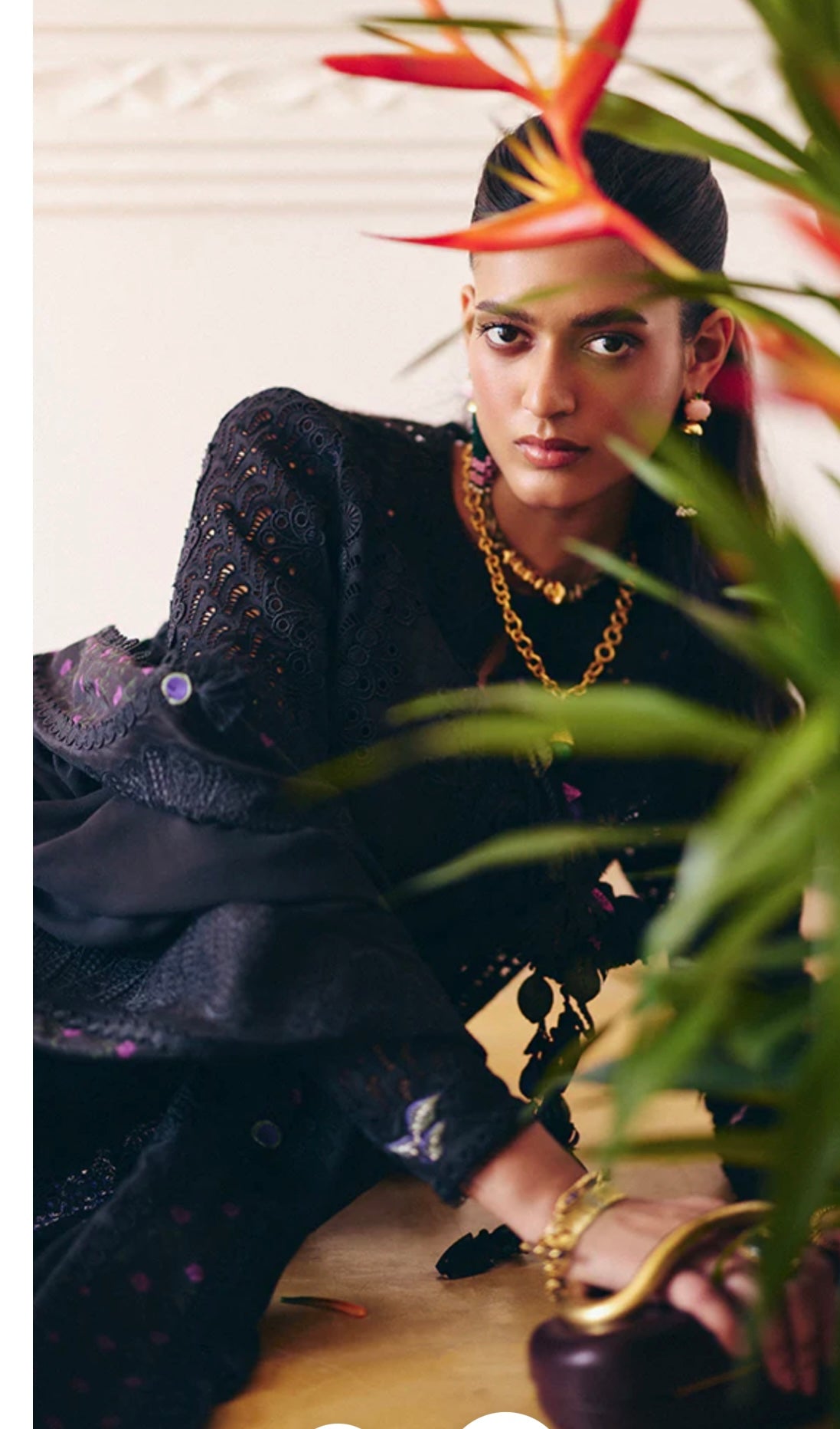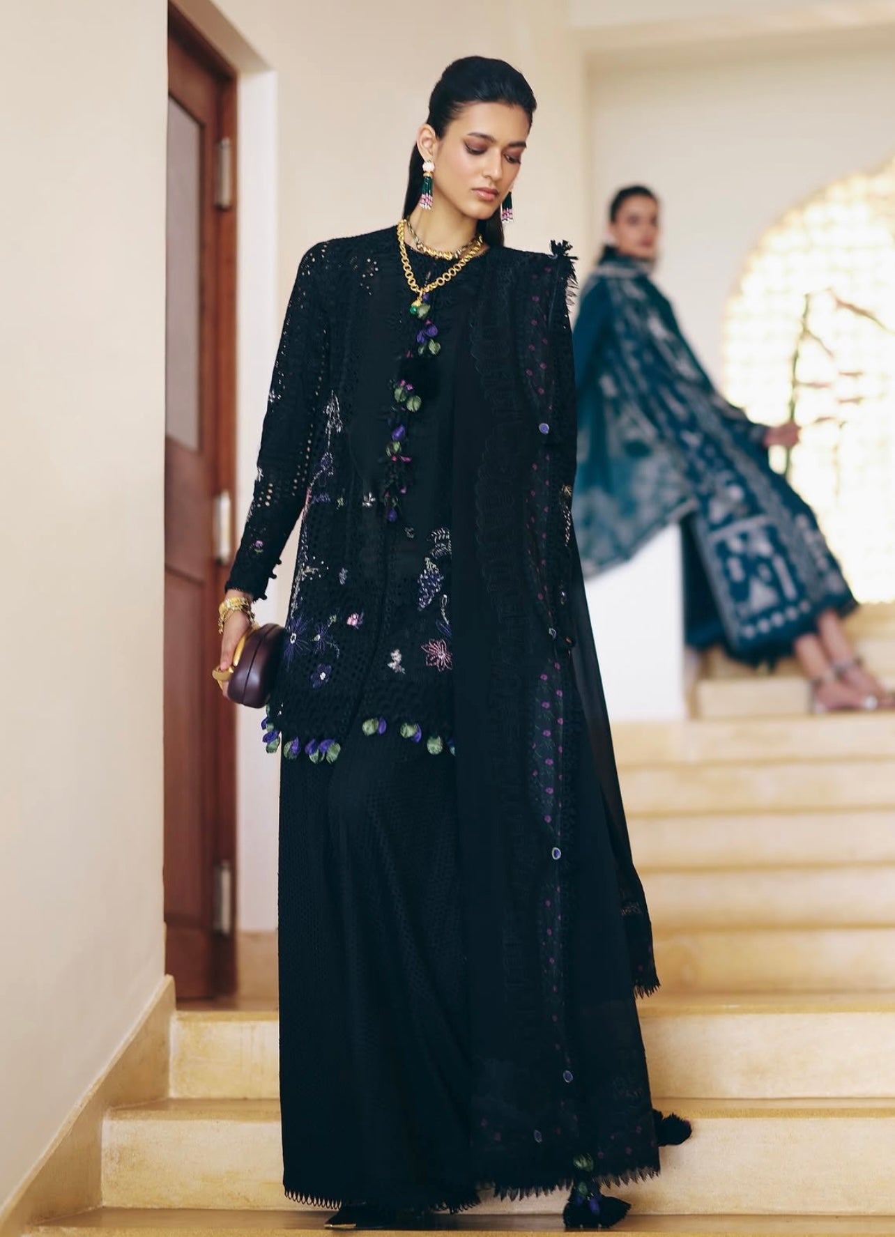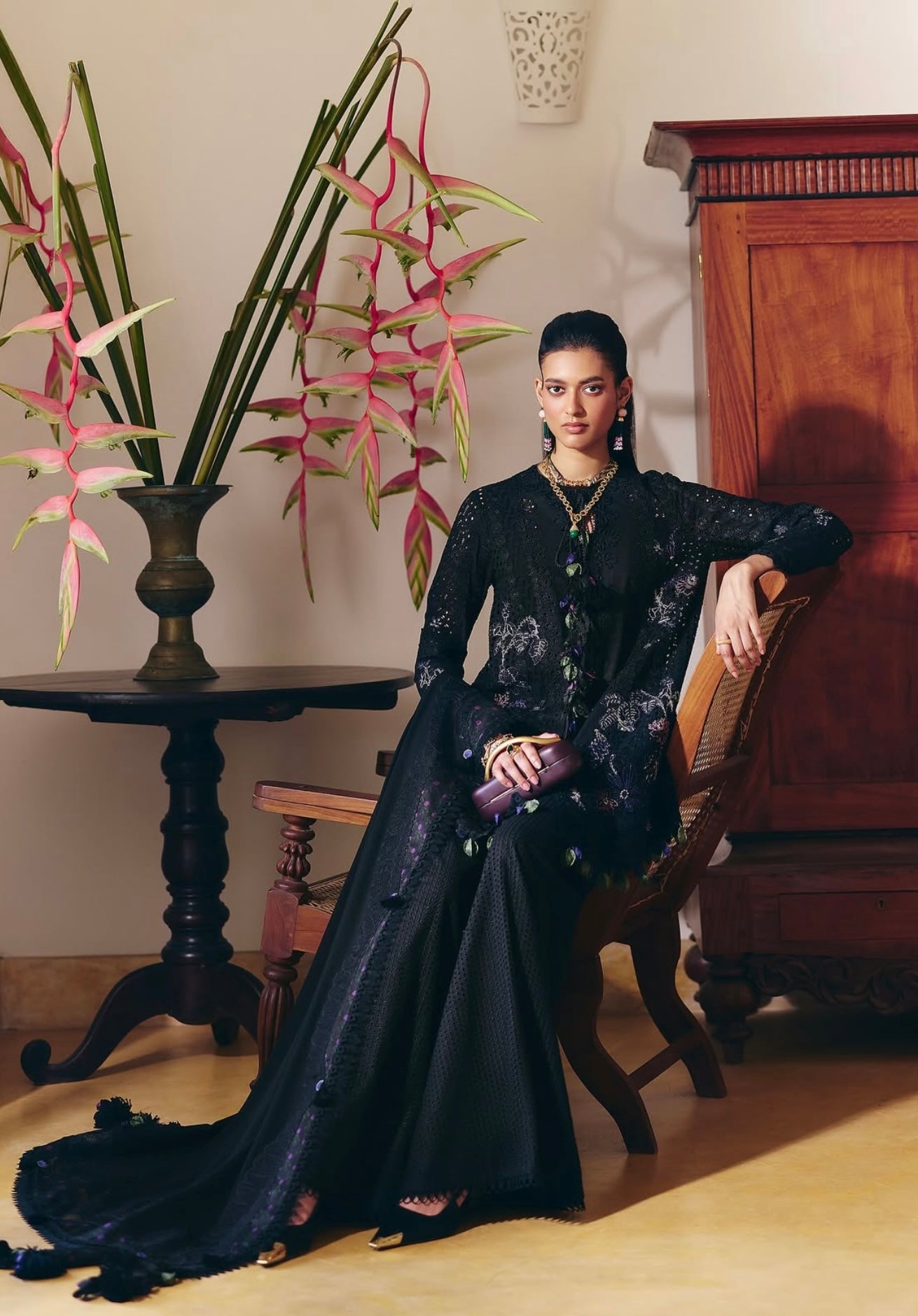Midnight Black cotton shirt featuring a close-to-neck neckline. Marori detail on the front, with tassels hanging from the neck. Embroidered shirt with lace details. Moroccan floral embroidery, and the sleeves are fitted. It comes with a slip.