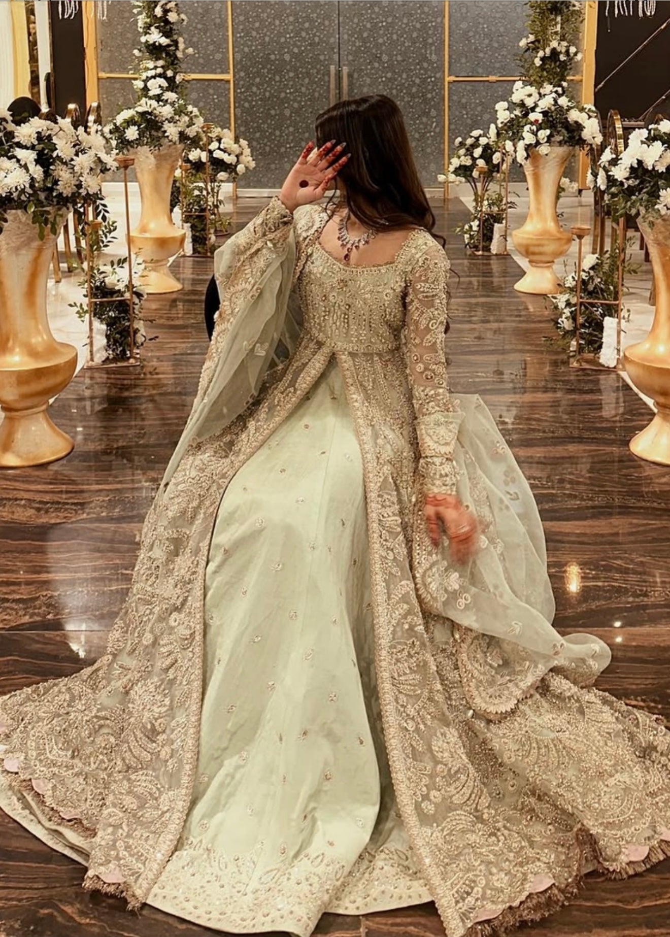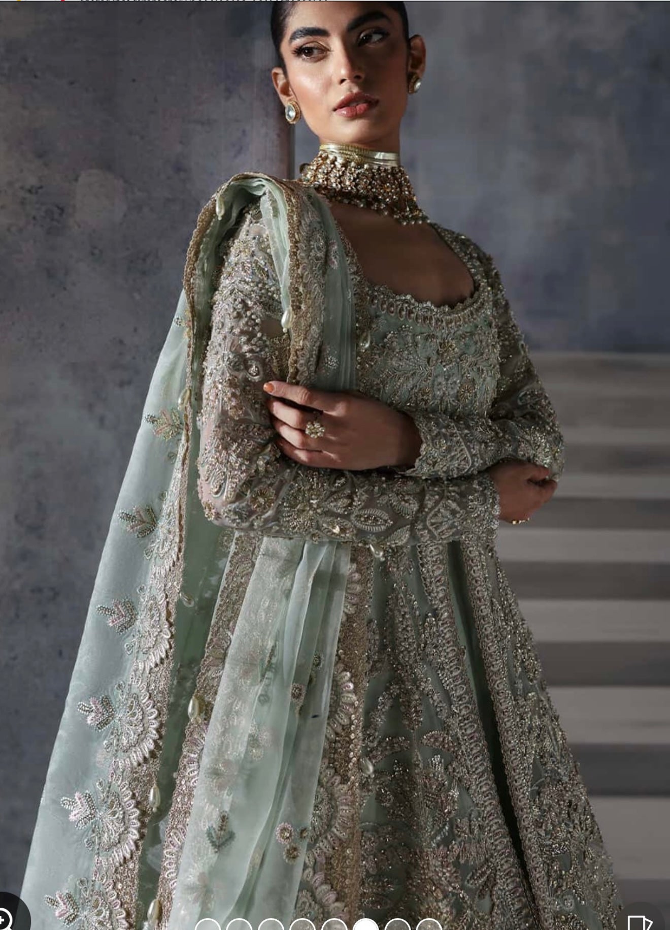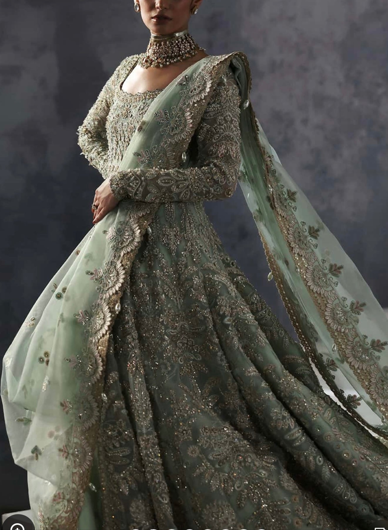 Organza embroidered open front style gown with lengha skirt. Organza embroidered dupatta.