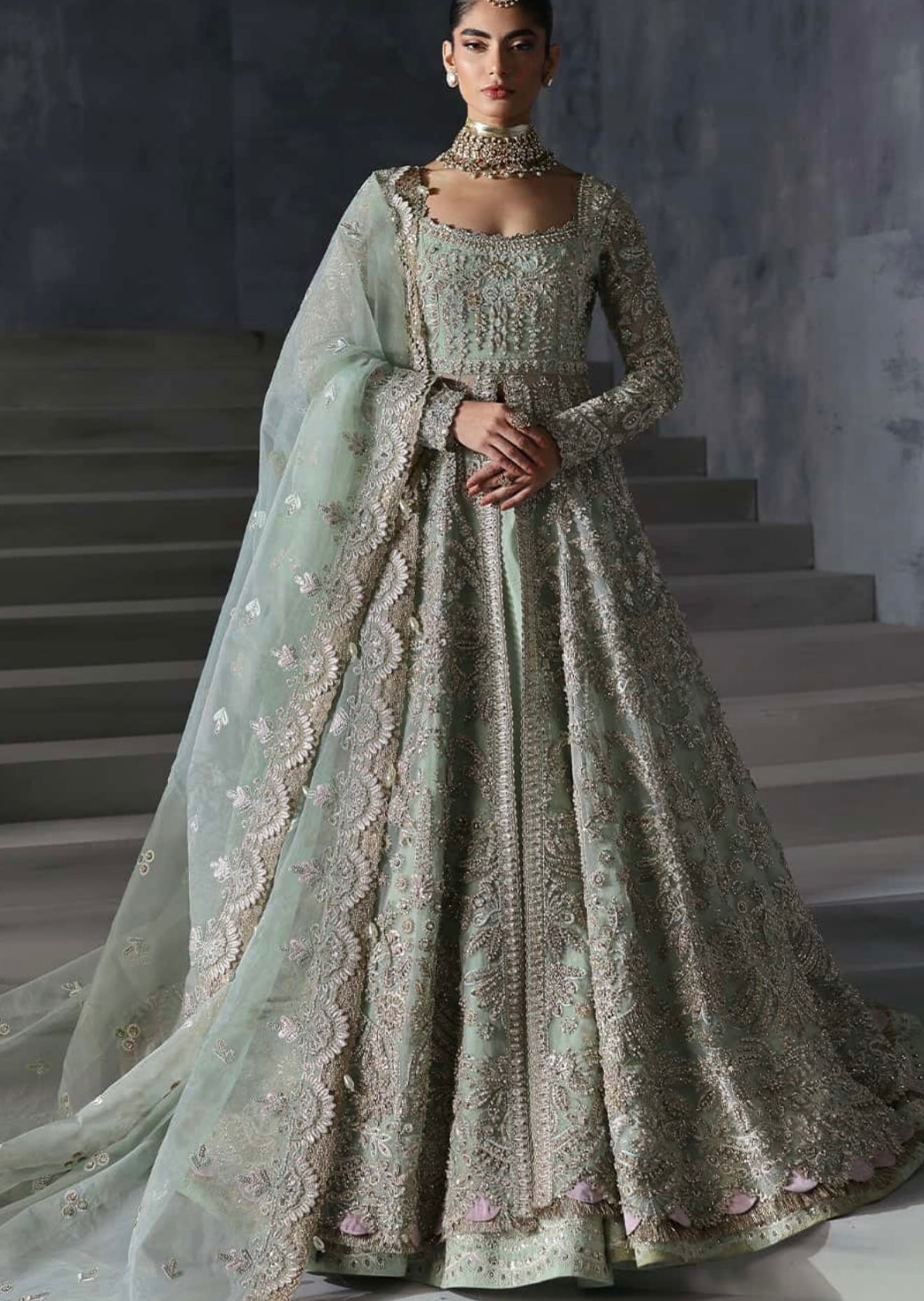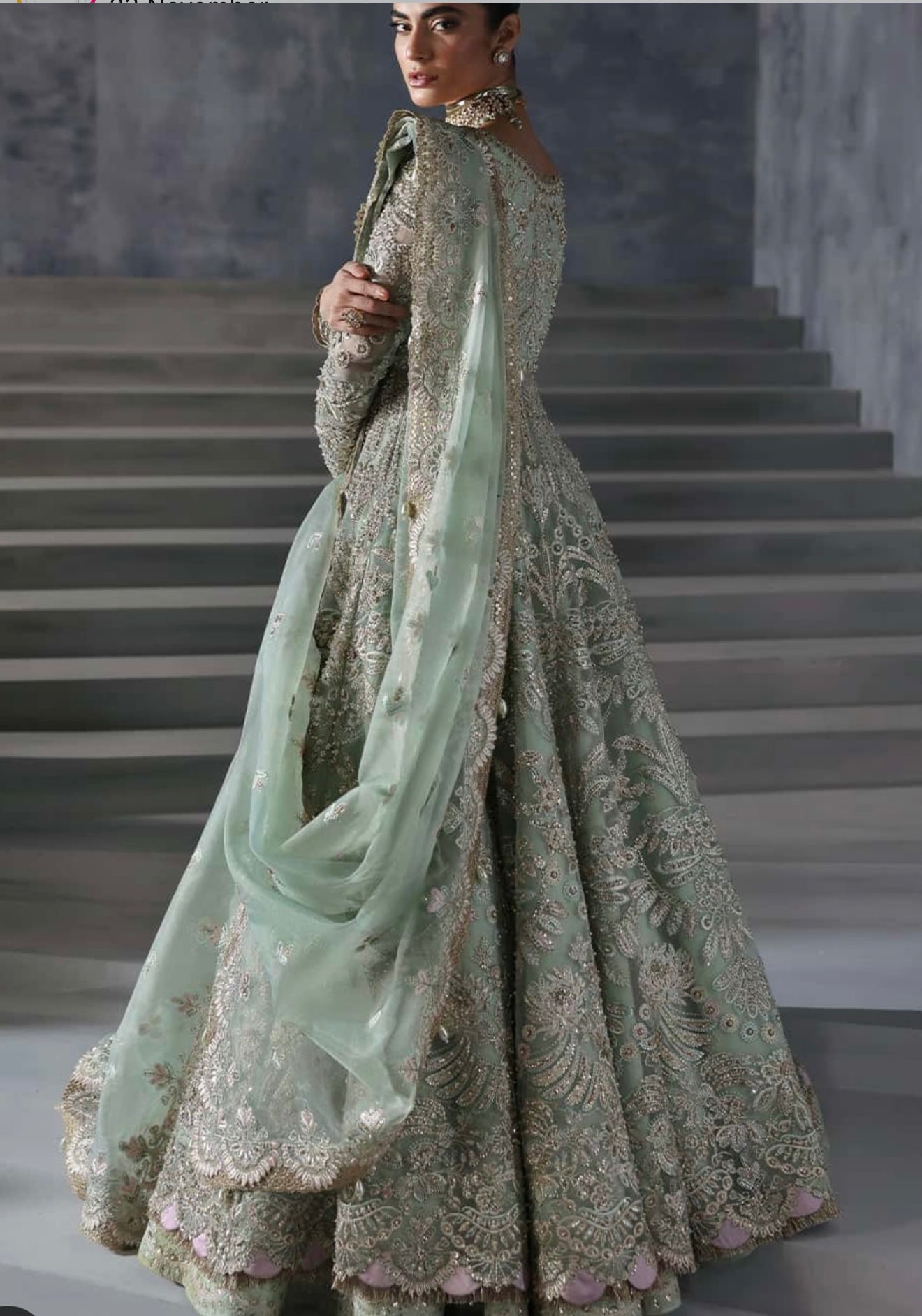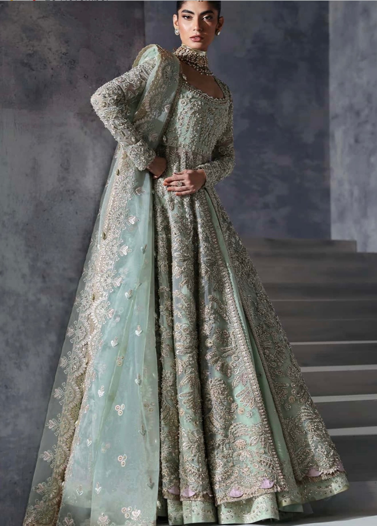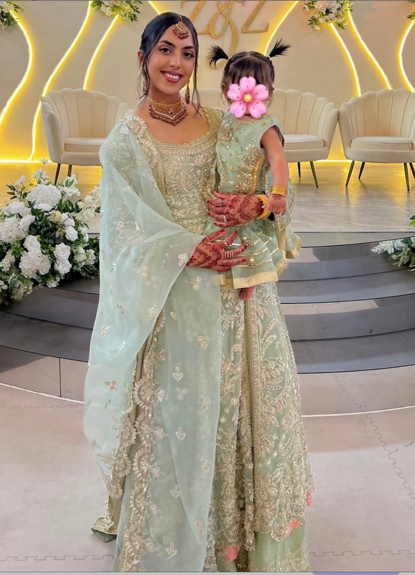 Organza embroidered open front style gown with lengha skirt. Organza embroidered dupatta.