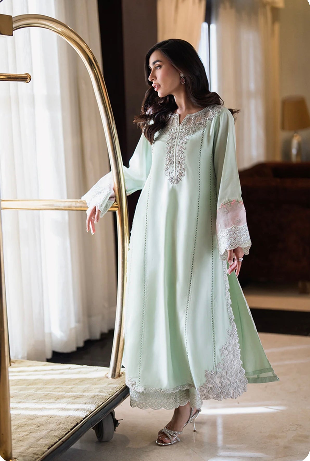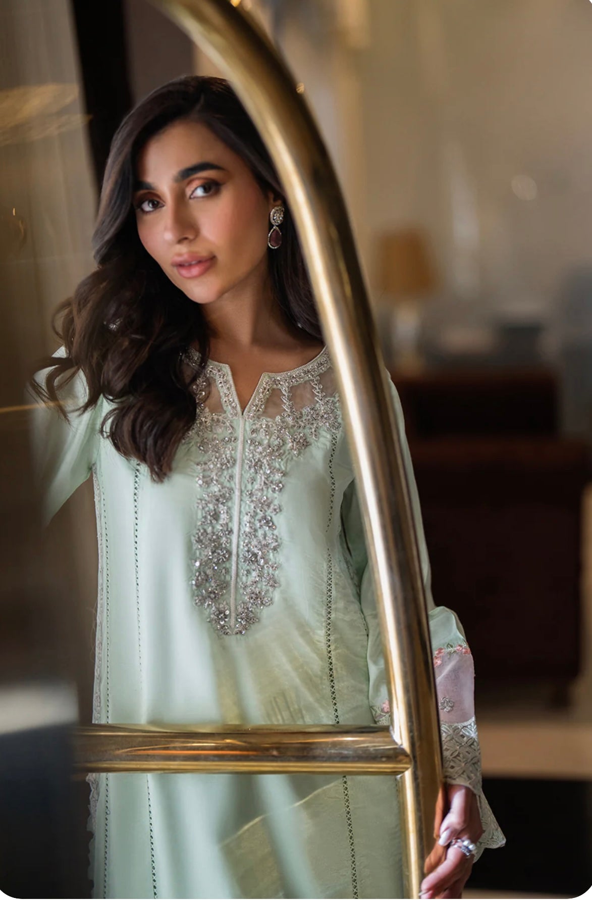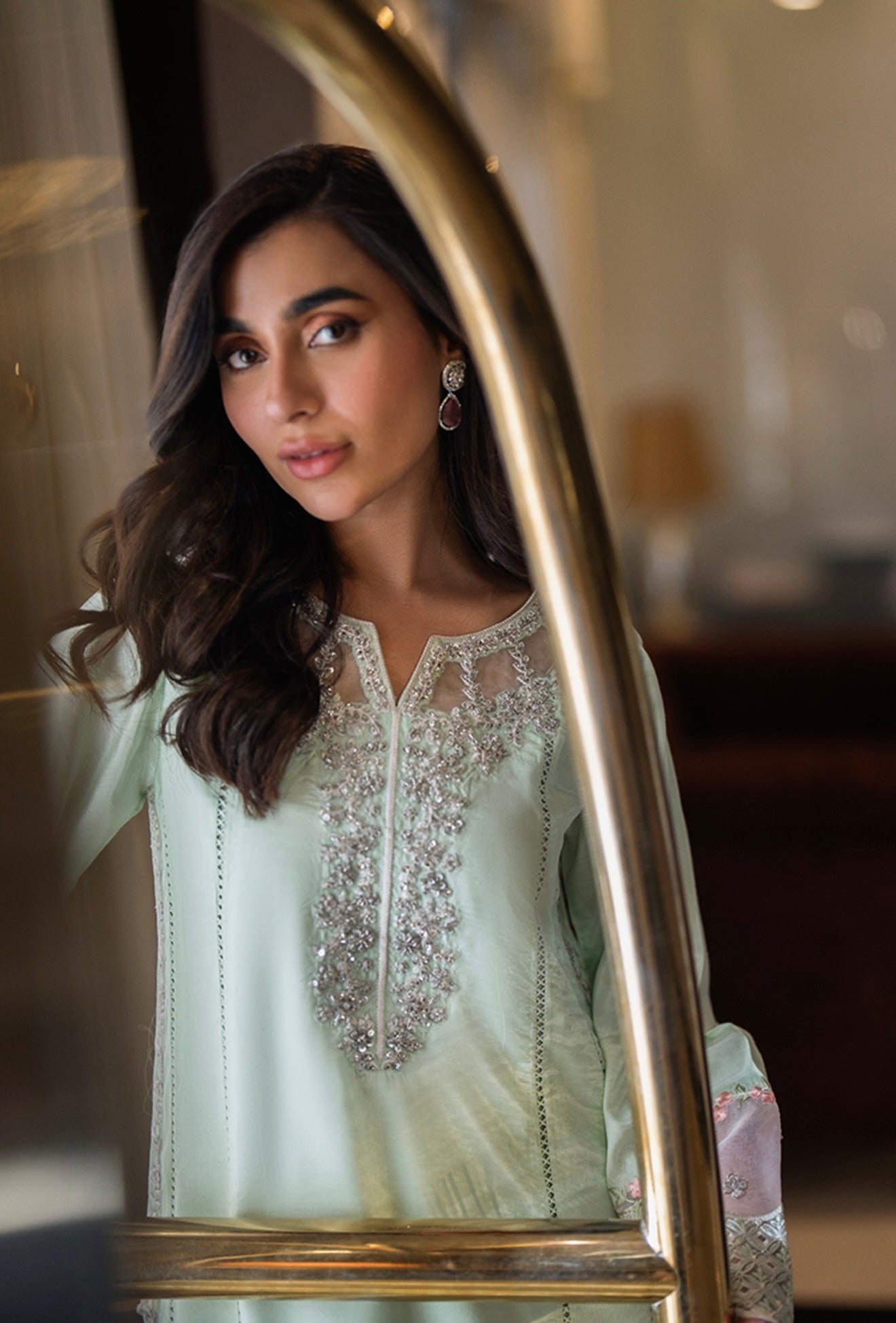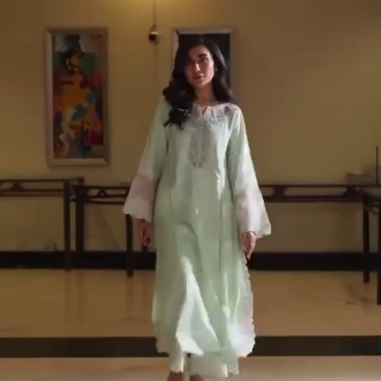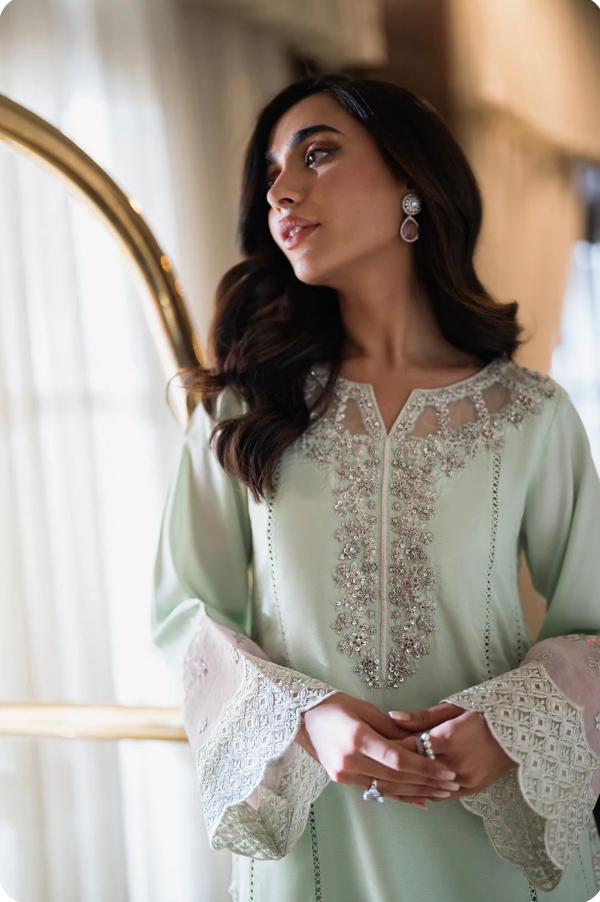 Light green raw silk 2 piece set with silver embellishments detailing and embroidery on sleeves.