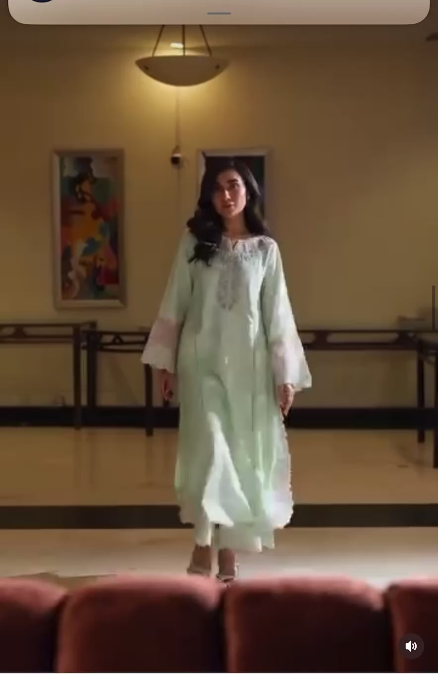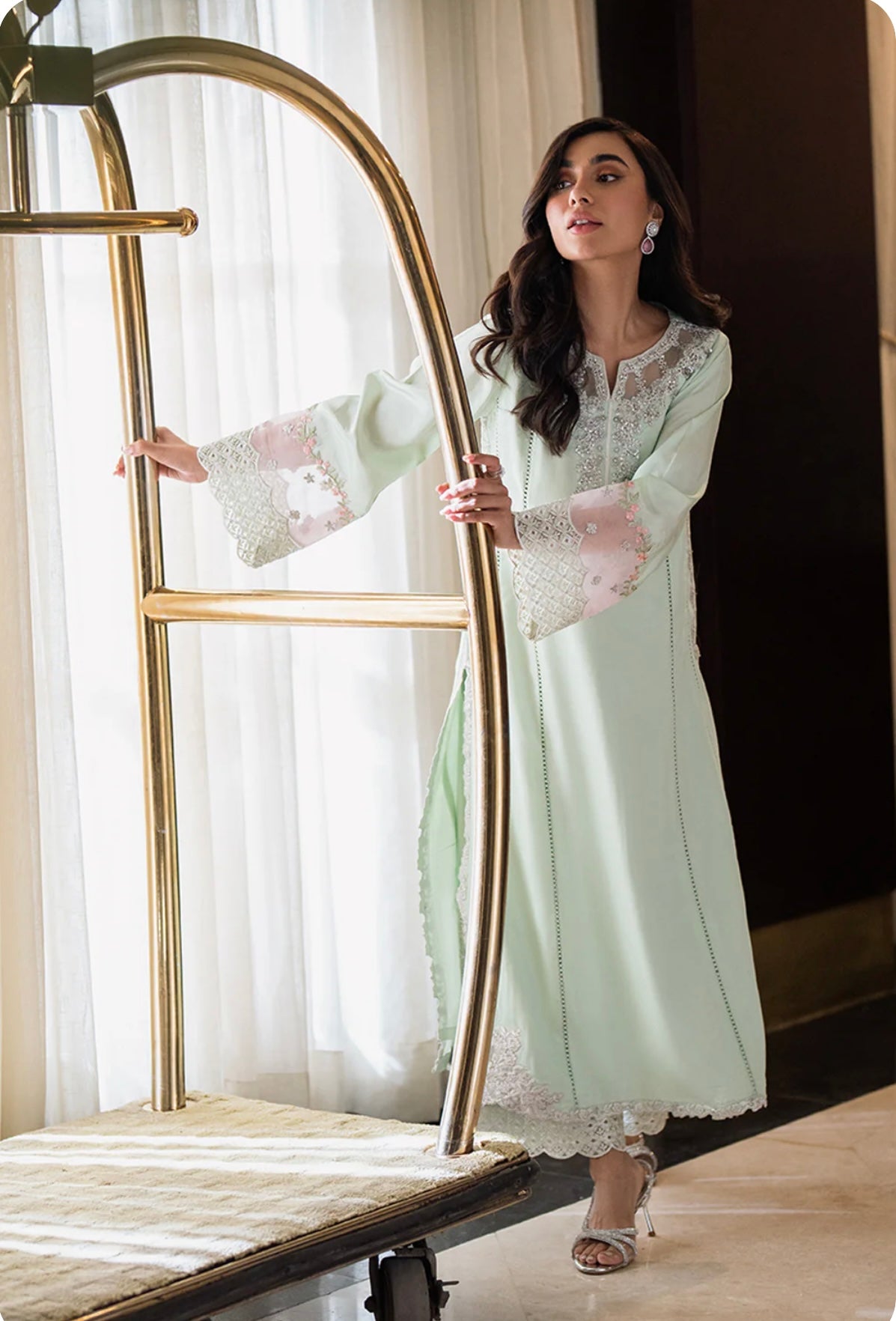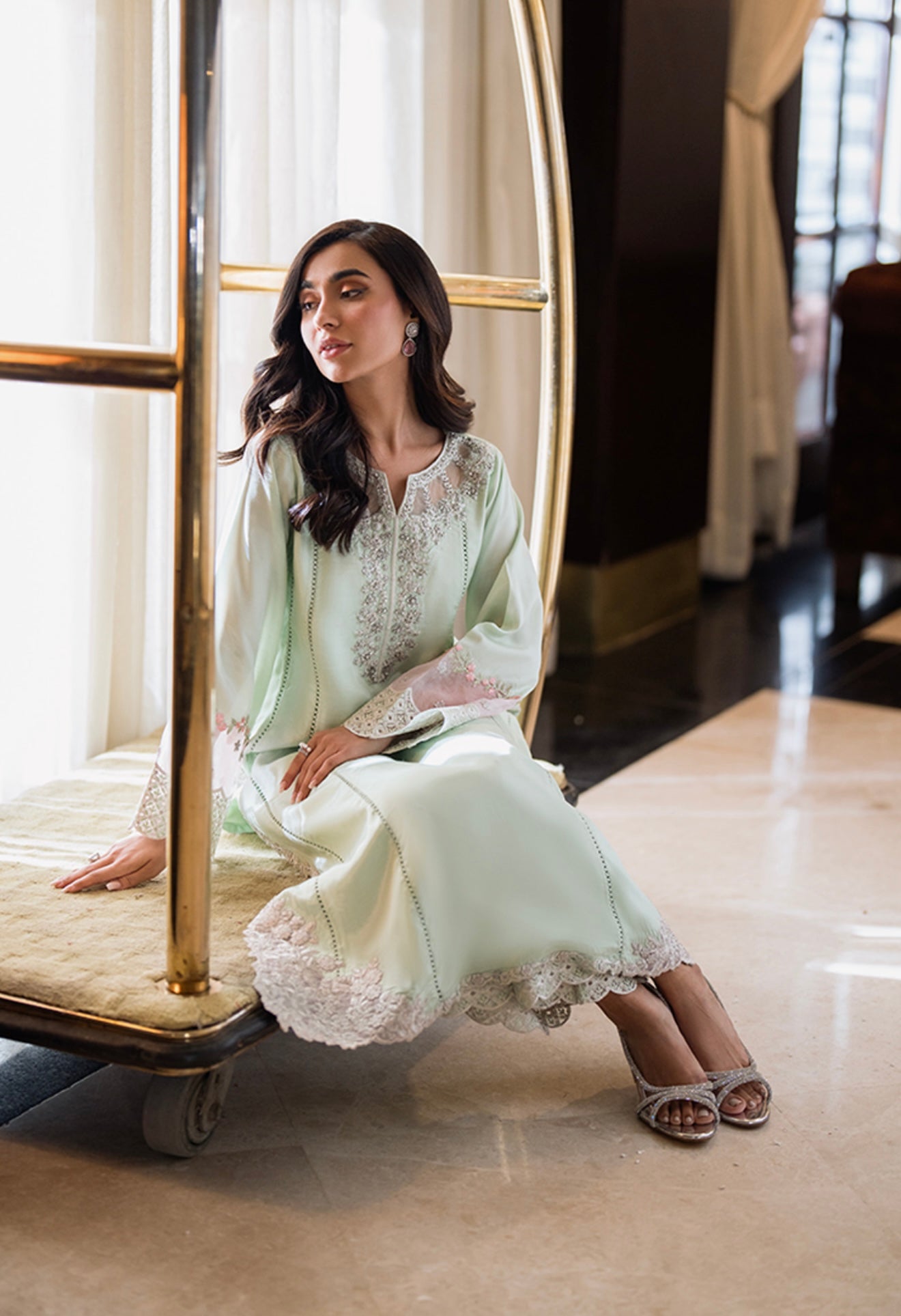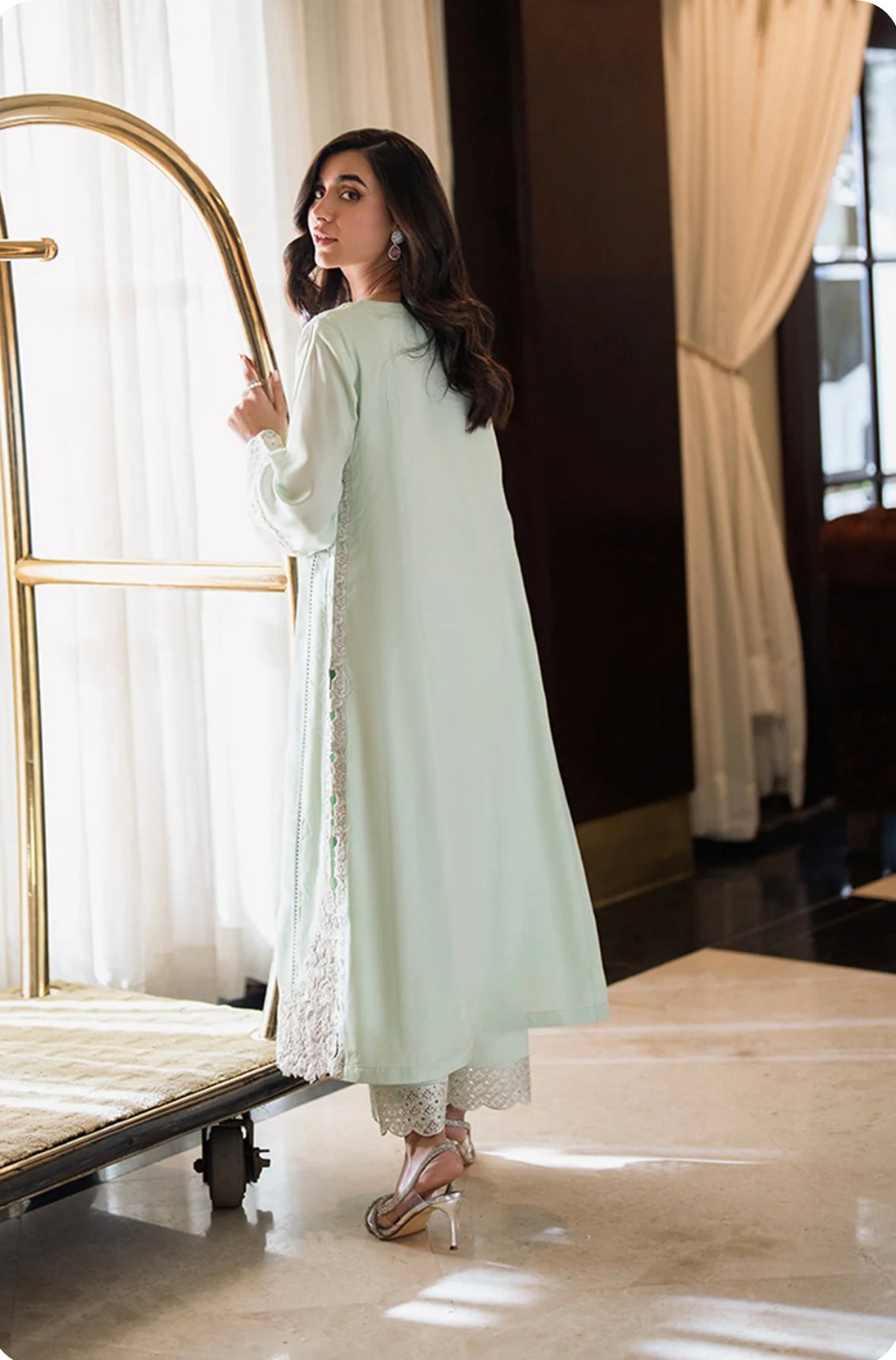 Light green raw silk 2 piece set with silver embellishments detailing and embroidery on sleeves.