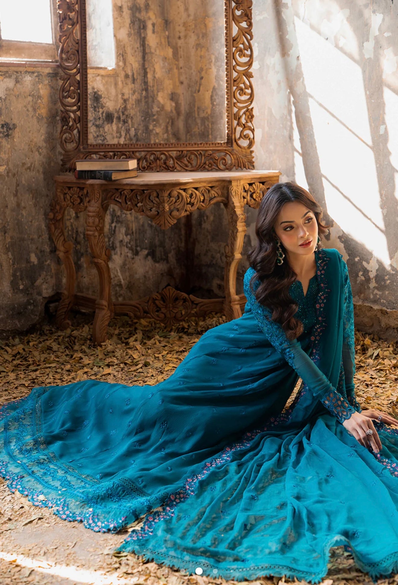 A captivating teal green chiffon creation, Mystic Teal is enhanced with a sequins-embroidered chiffon dupatta and a hand-embellished patch on the front.