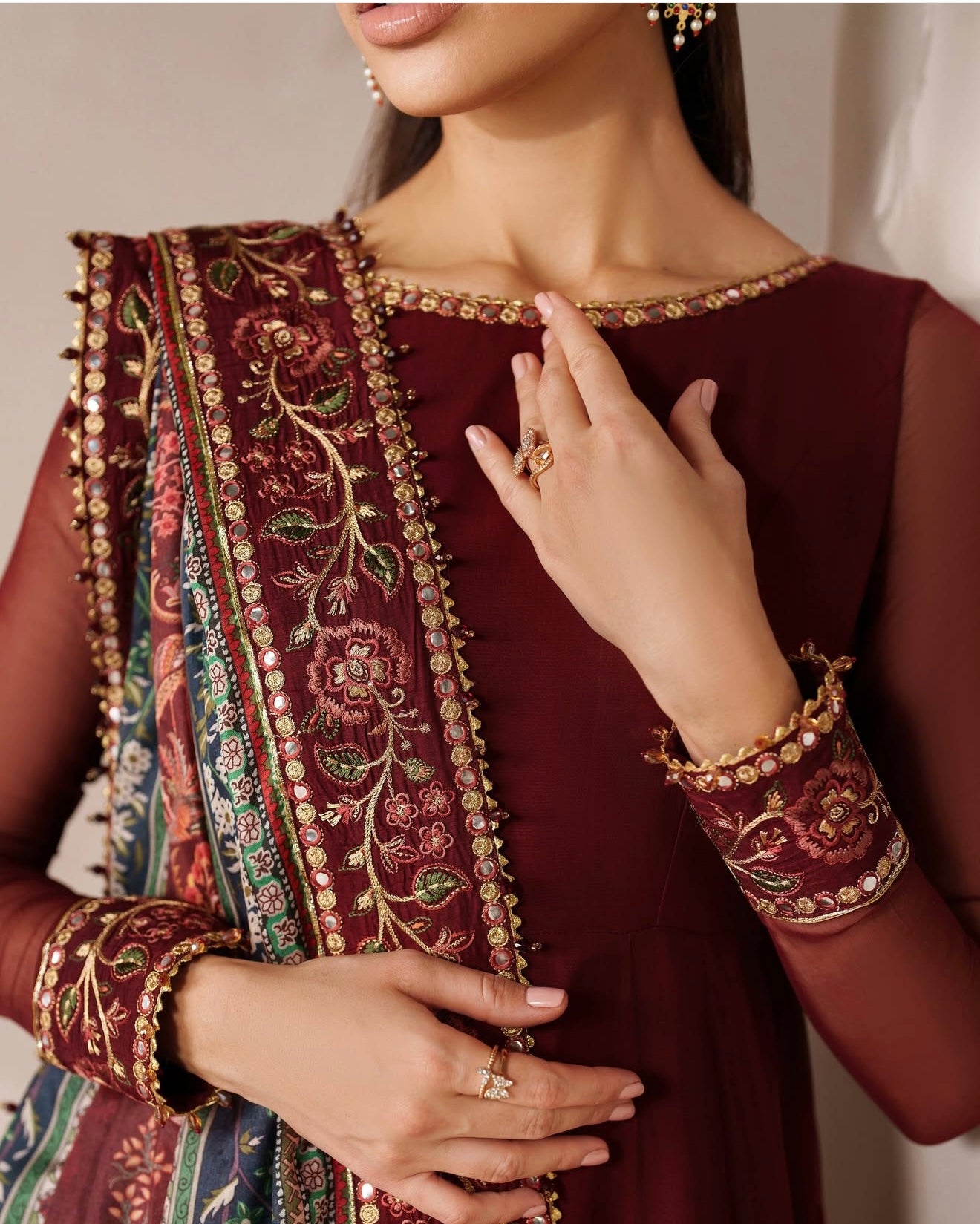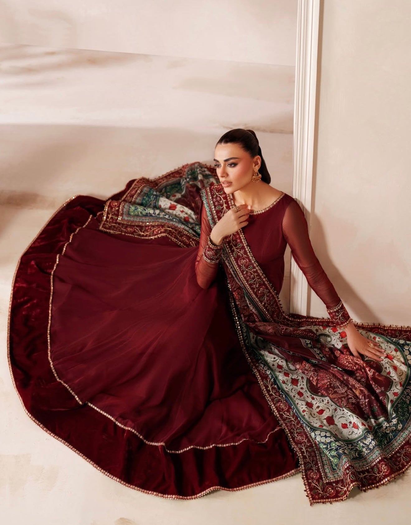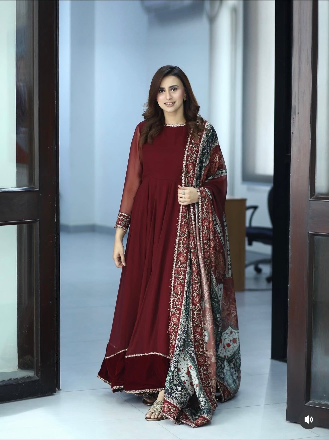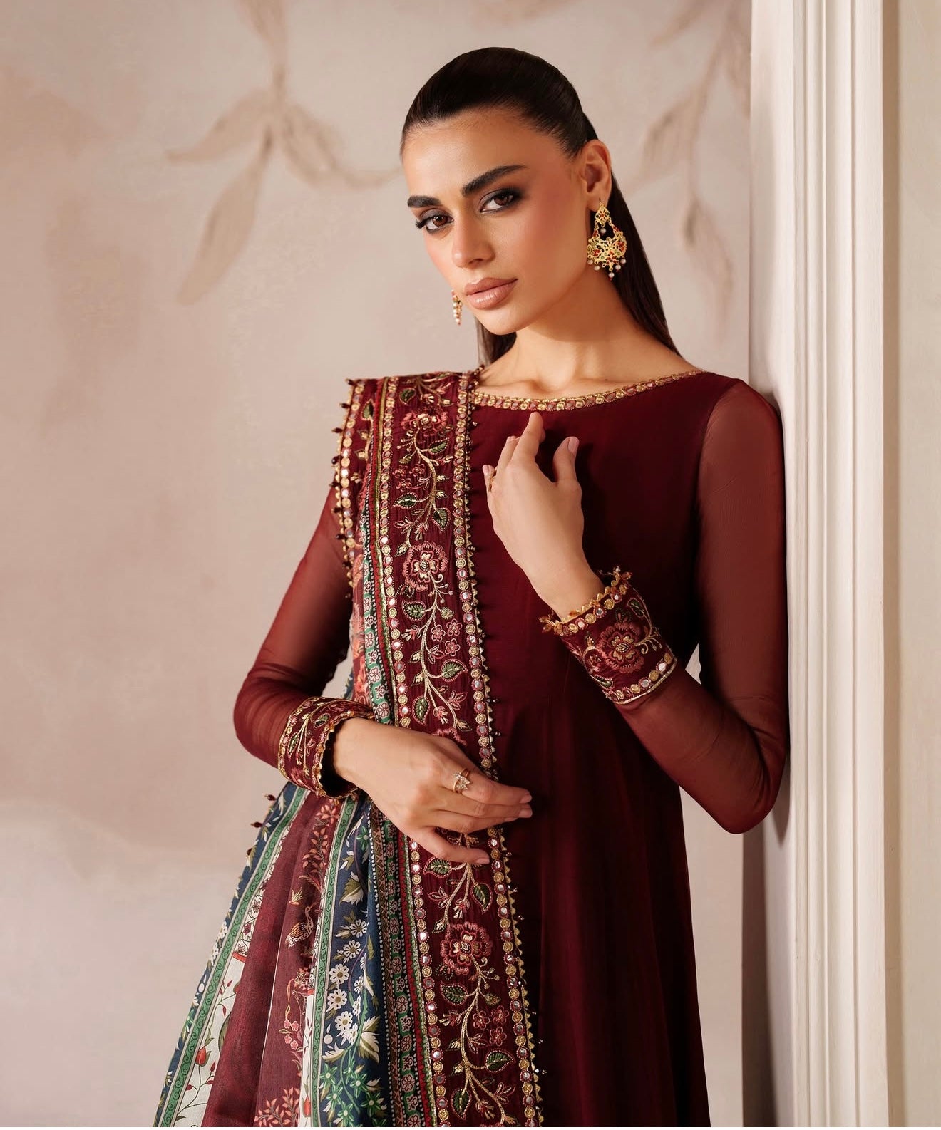 This elegant embroidered chiffon frock has delicately detailed neckline and sleeves, with a velvet border. The outfit includes a digitally printed silk dupatta and a grip trouser.