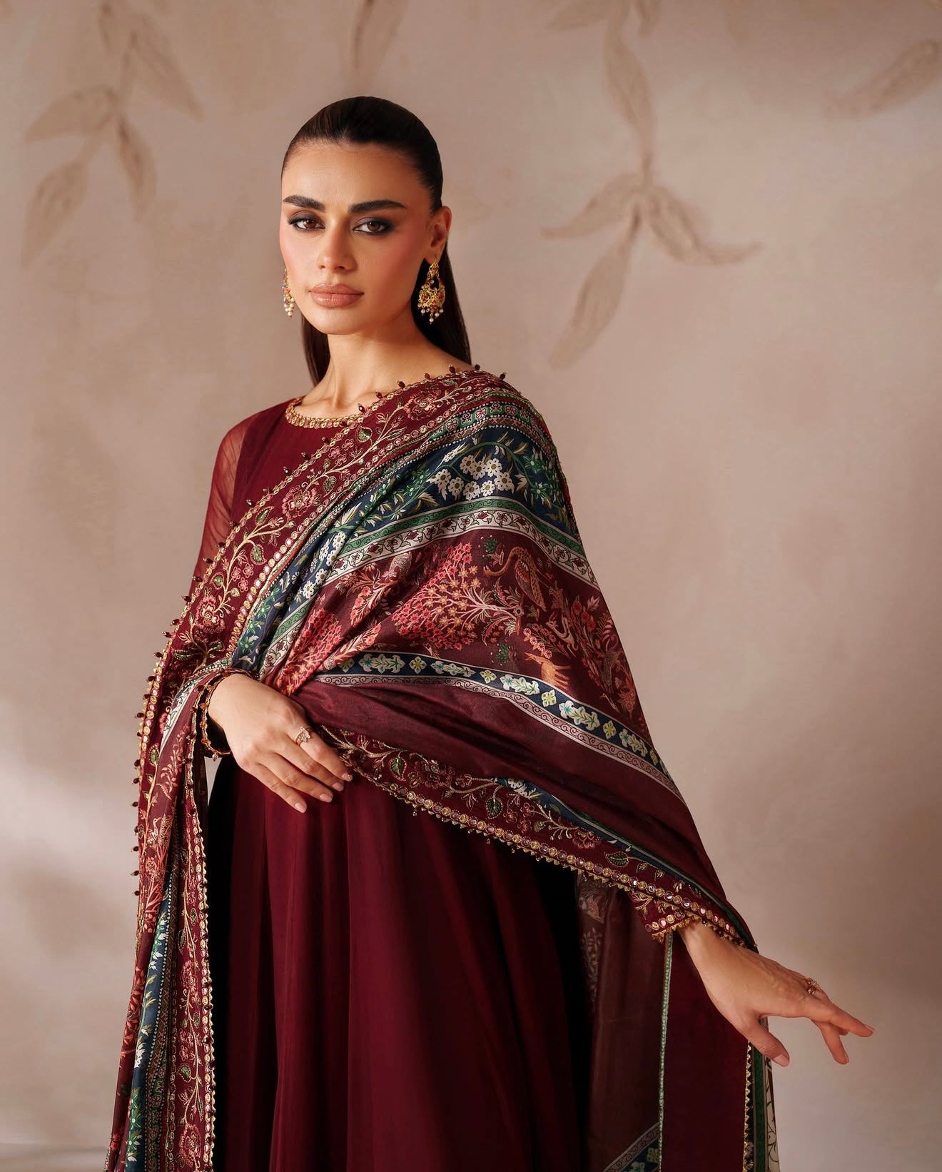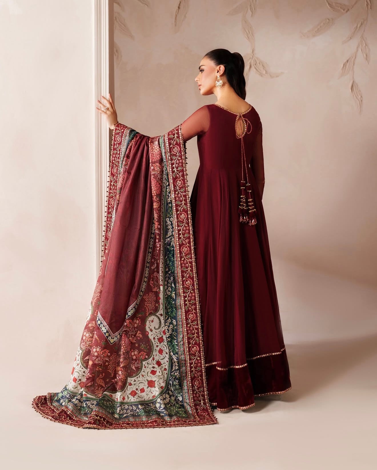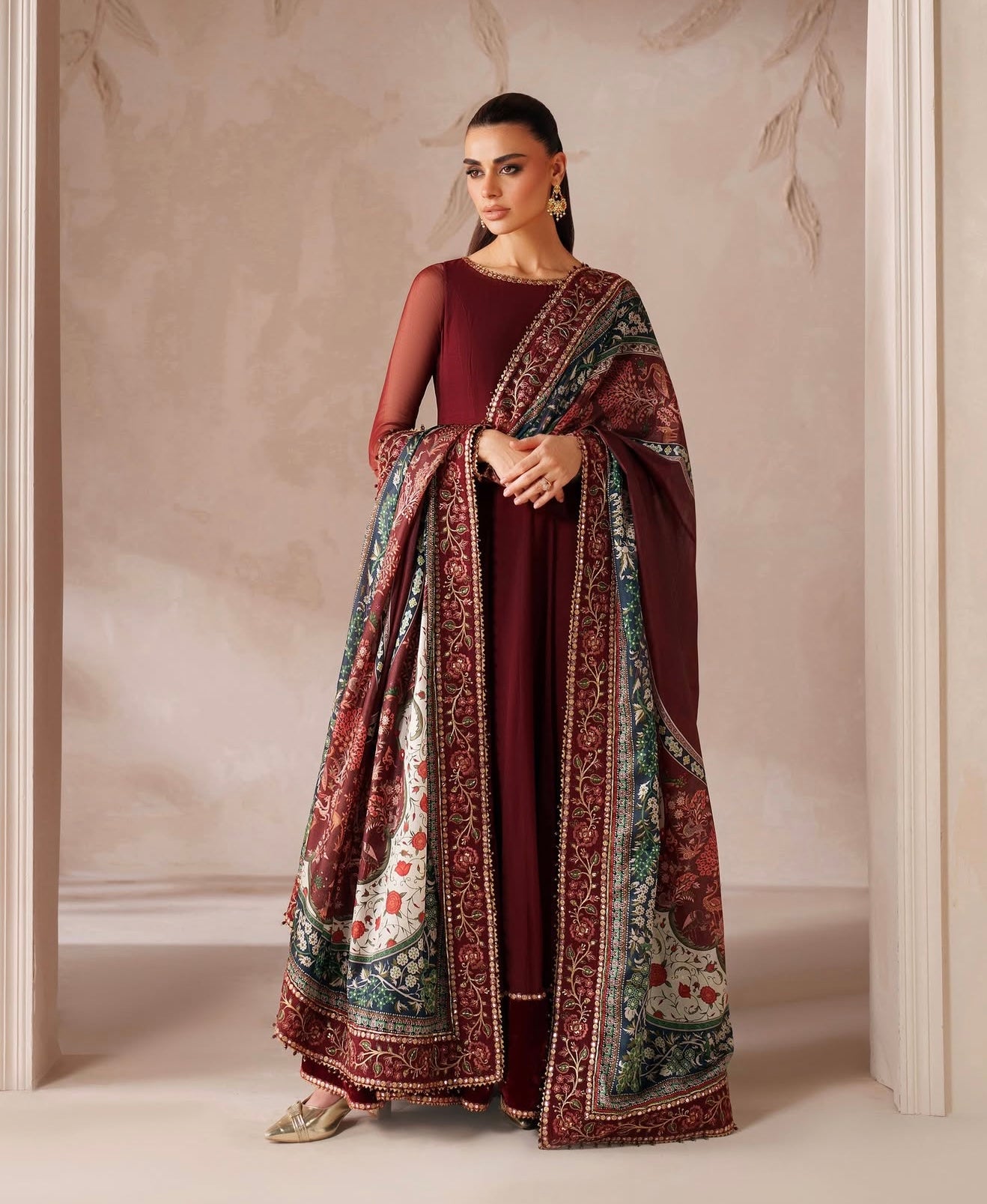 This elegant embroidered chiffon frock has delicately detailed neckline and sleeves, with a velvet border. The outfit includes a digitally printed silk dupatta and a grip trouser.