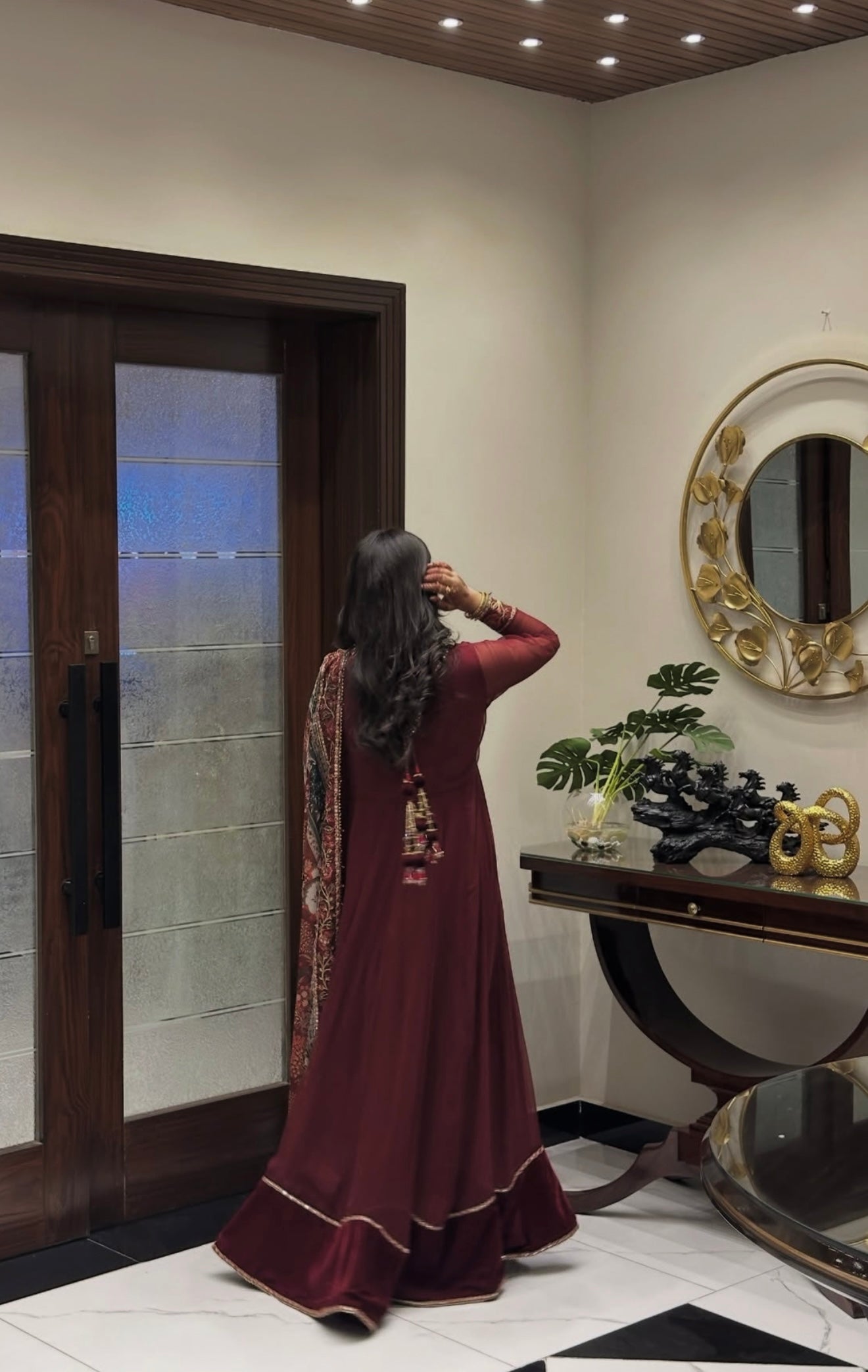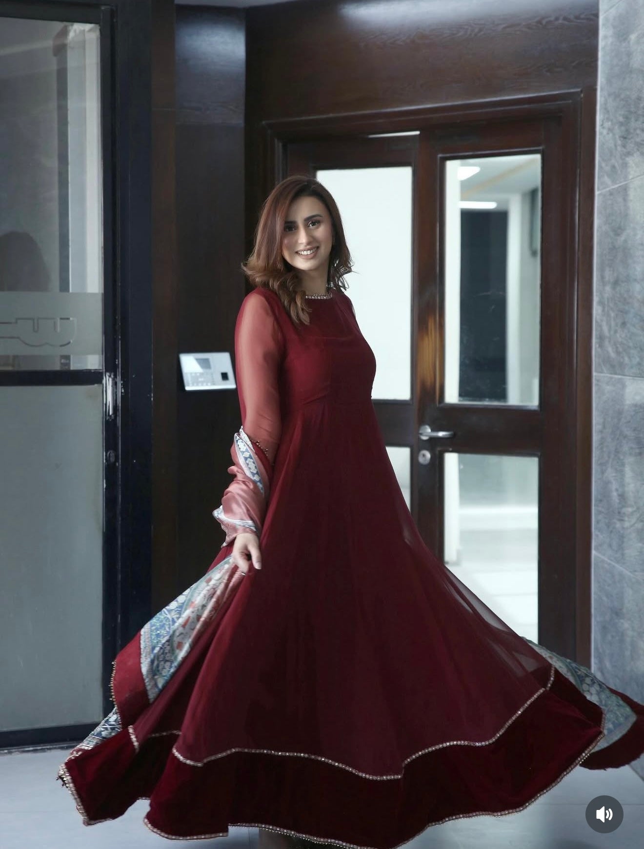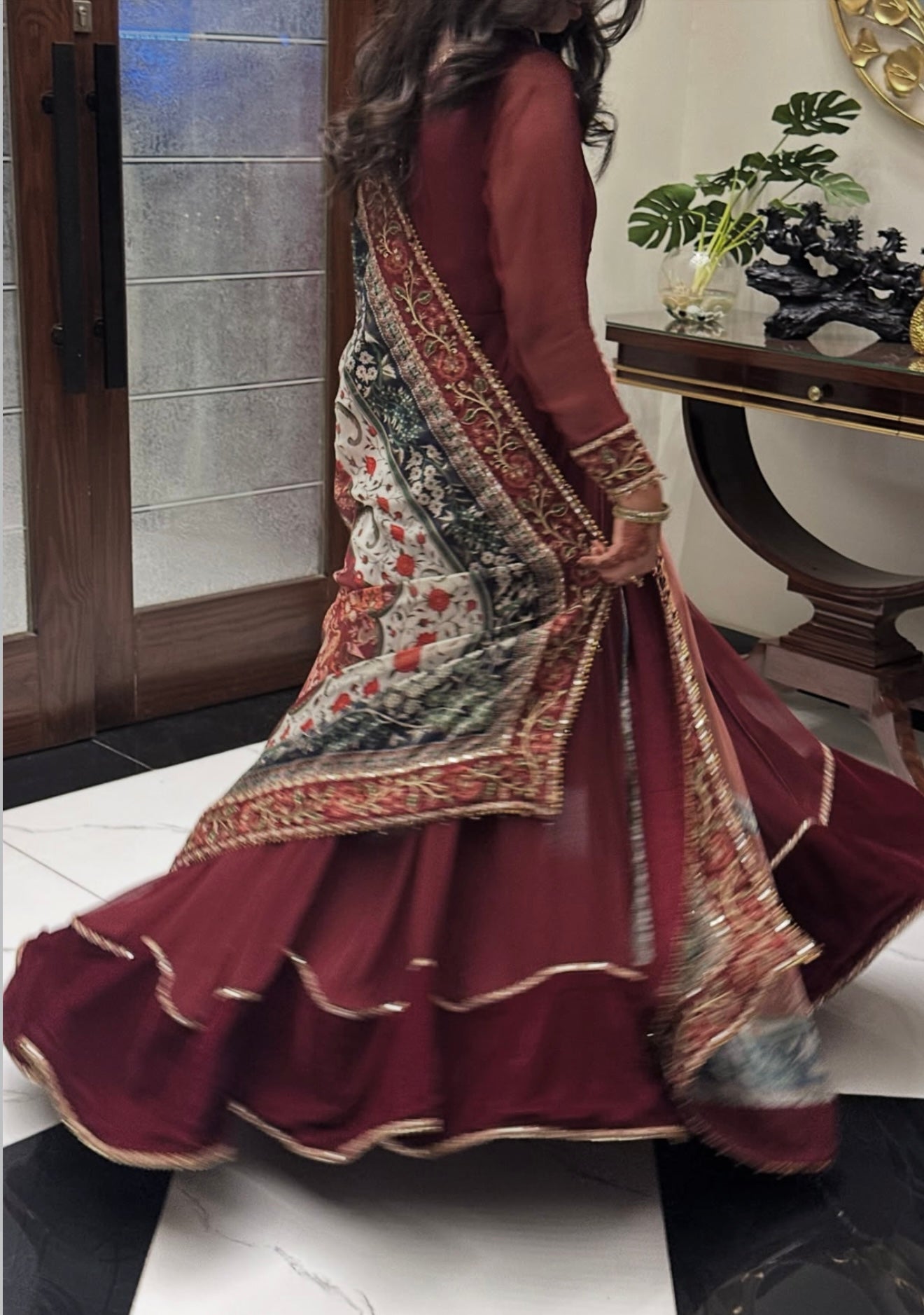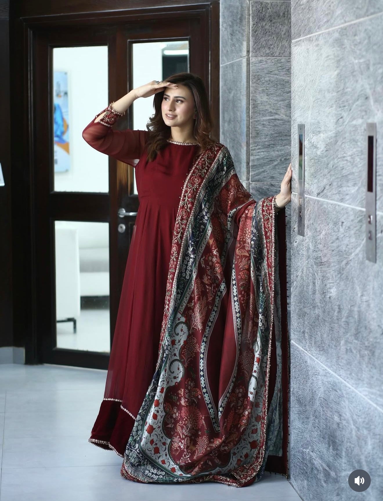 This elegant embroidered chiffon frock has delicately detailed neckline and sleeves, with a velvet border. The outfit includes a digitally printed silk dupatta and a grip trouser.
