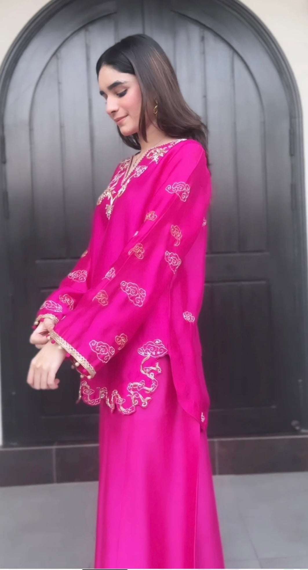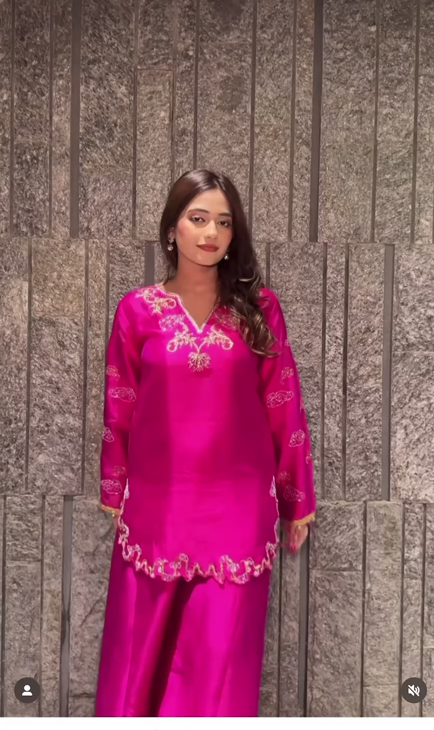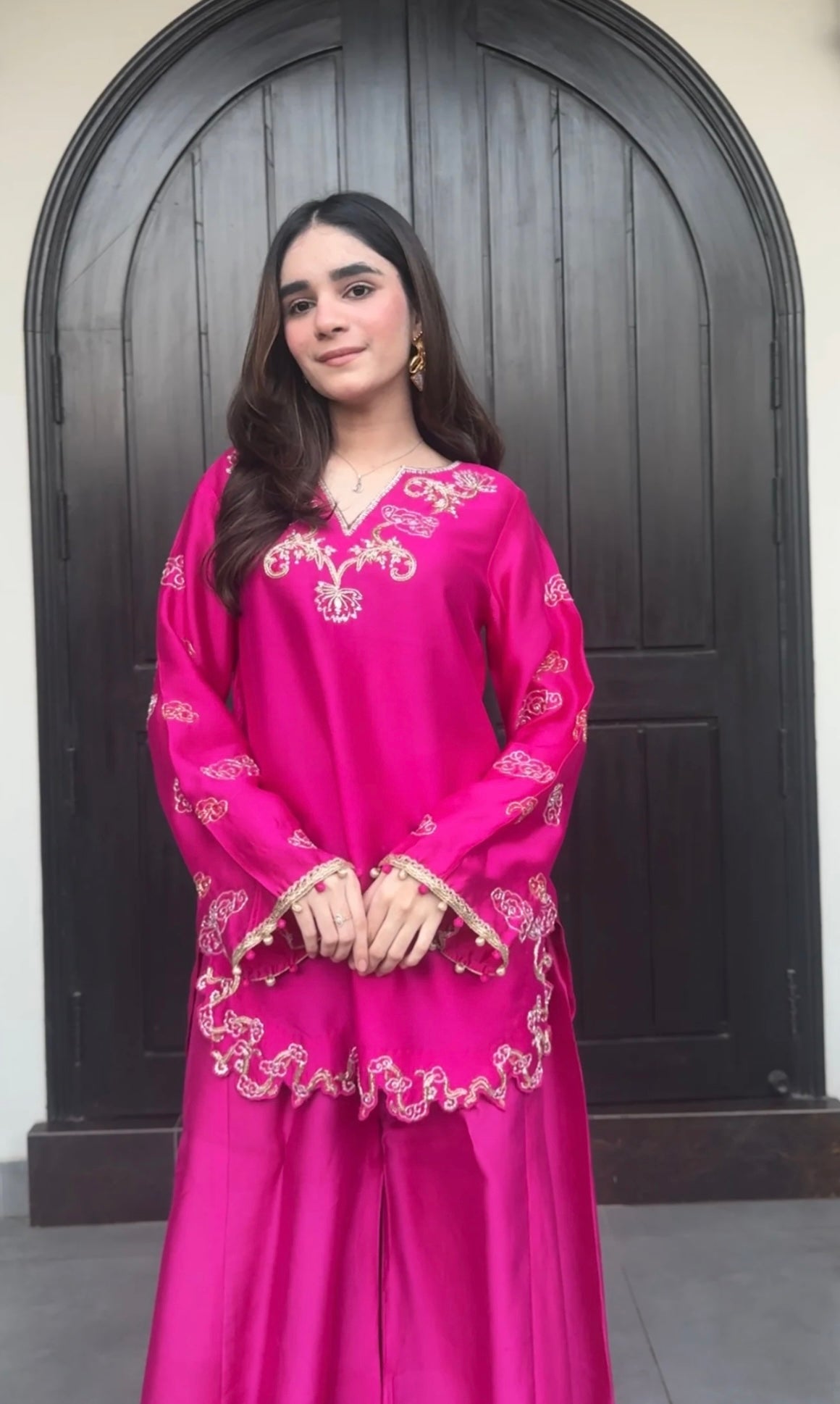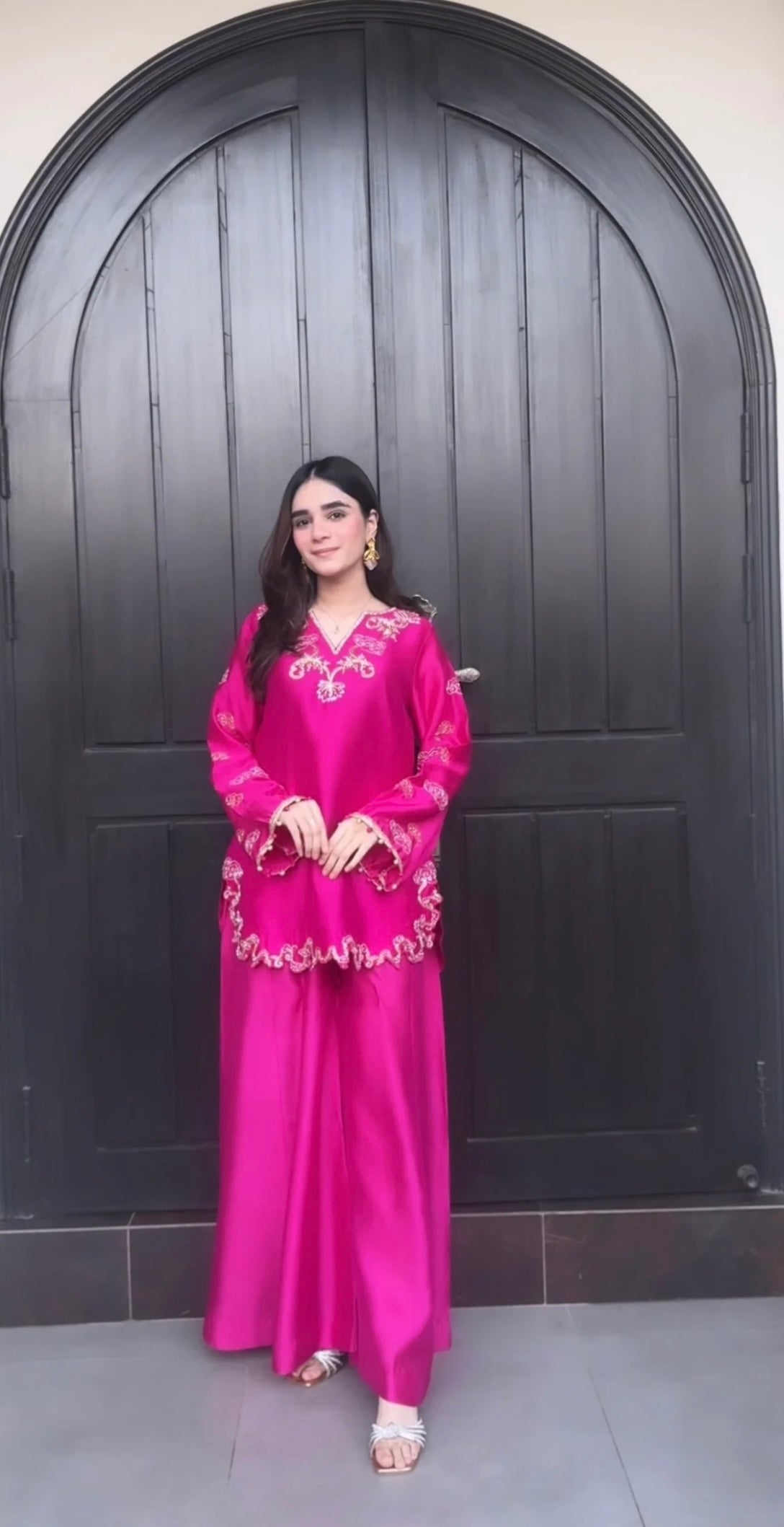 Raspberry is a contemporary statement piece, designed for those who embrace modern elegance. It features a chic, short-cut shirt paired with effortlessly flowy pants. The shirt is adorned with exquisite Japanese cutdana work. Dupatta is included.