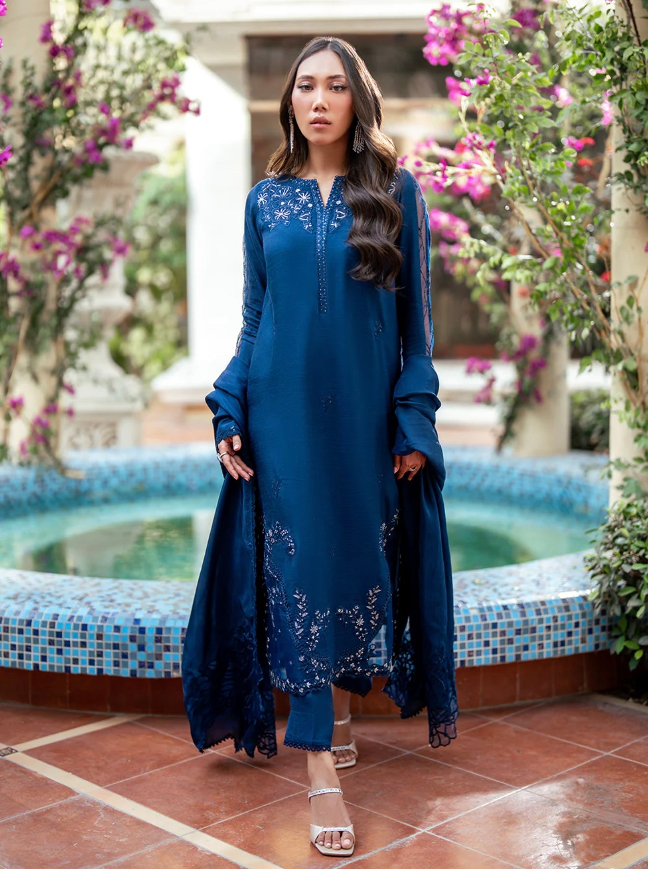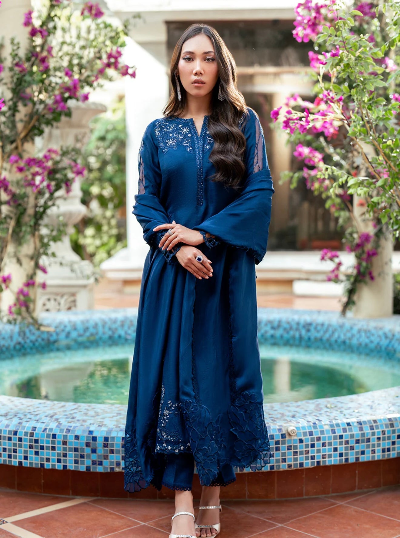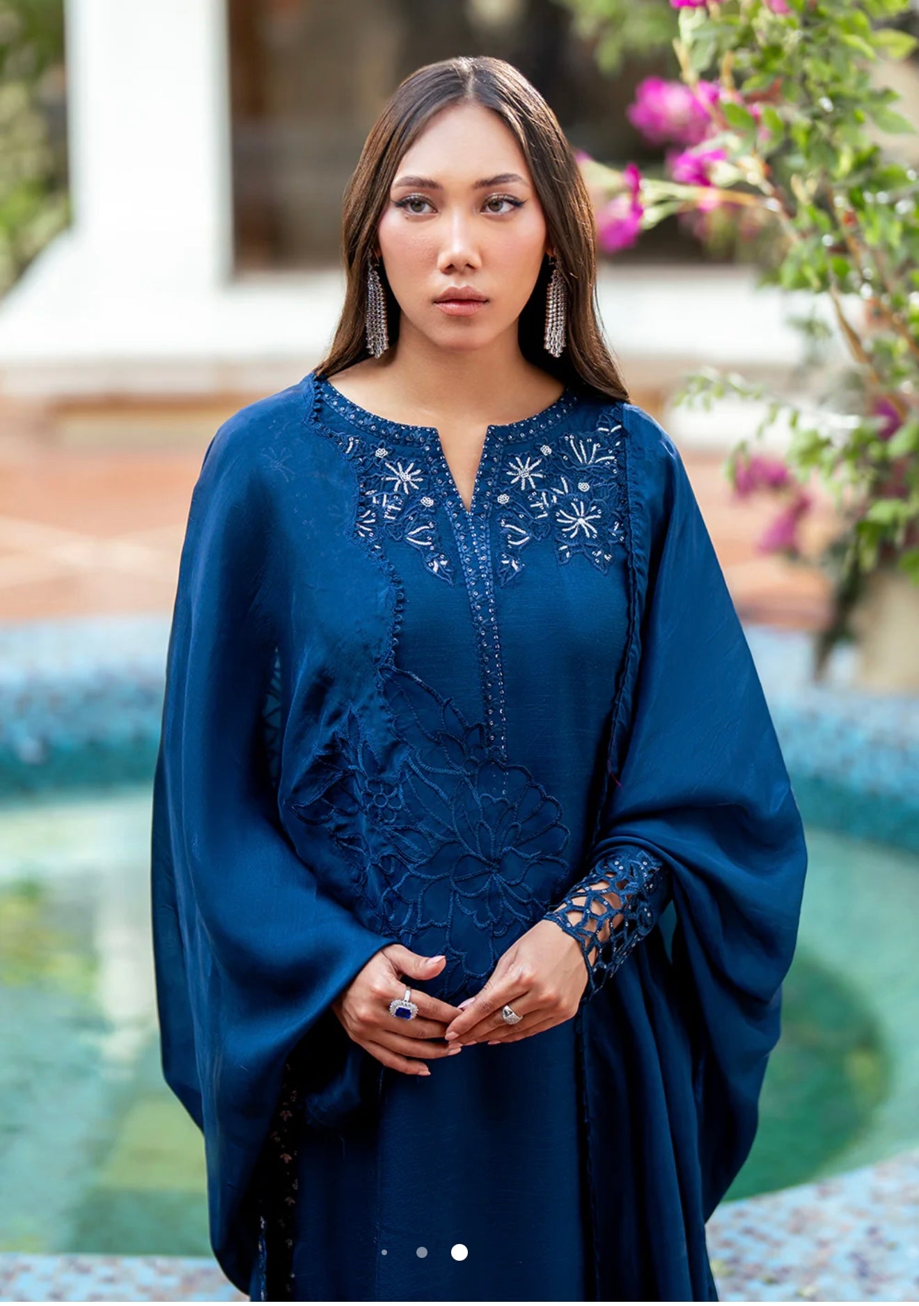 Drape yourself in the richness of Regal Cobalt, crafted from luxurious raw silk in a deep, captivating dark blue hue. Enhanced with exquisite patchwork and paired with sleek straight pants.