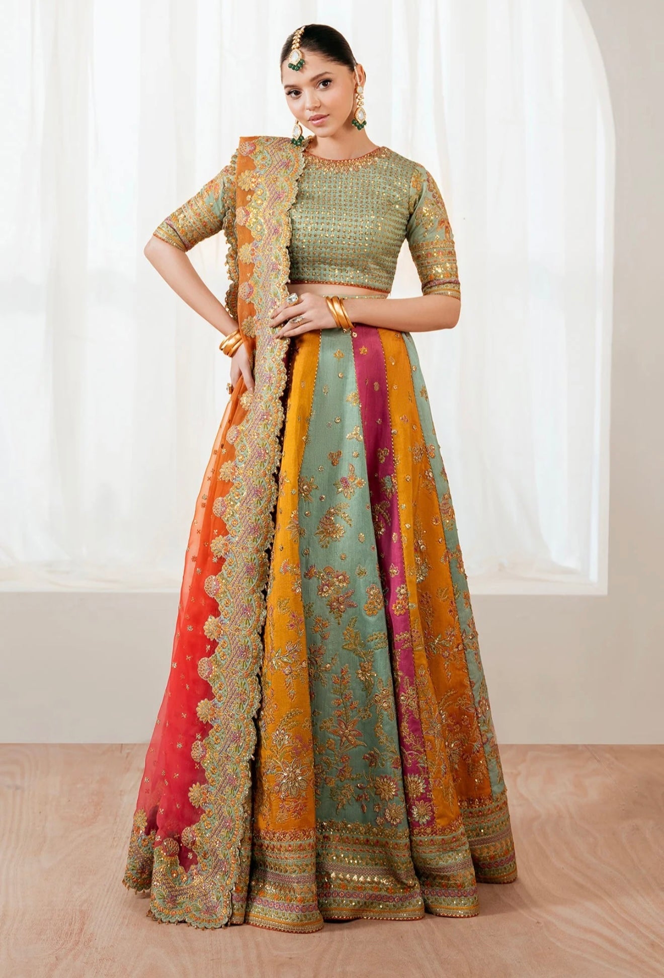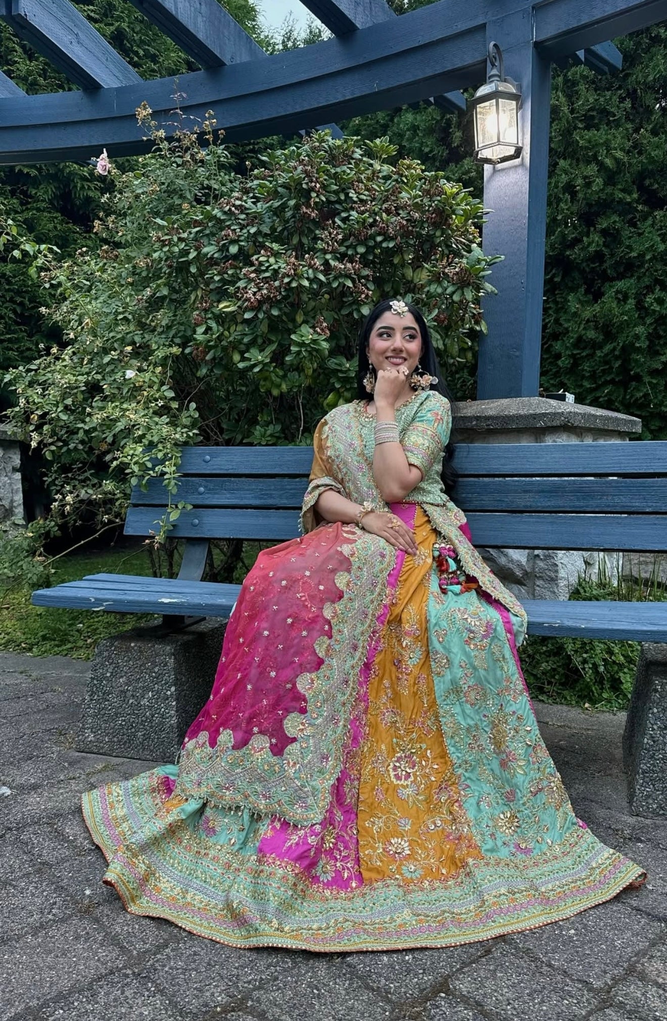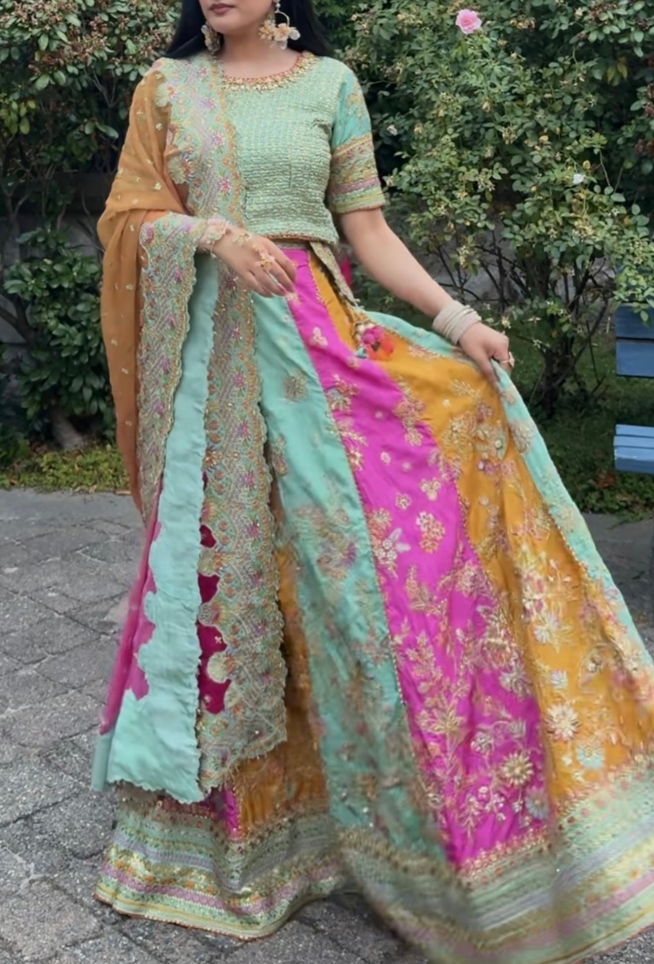 This multi-colored lehnga and choli features hand-embellished front kali pieces and neckline made of raw silk. The front panel is adorned with intricate designs in multicolors, while the back panel showcases embroidery in matching shades. The belt border, sleeves, and dupatta border are all crafted with raw silk fabric. The chiffon dupatta is embroidered with gradient shades.