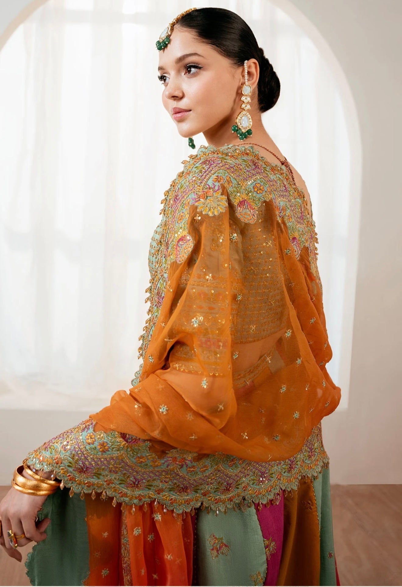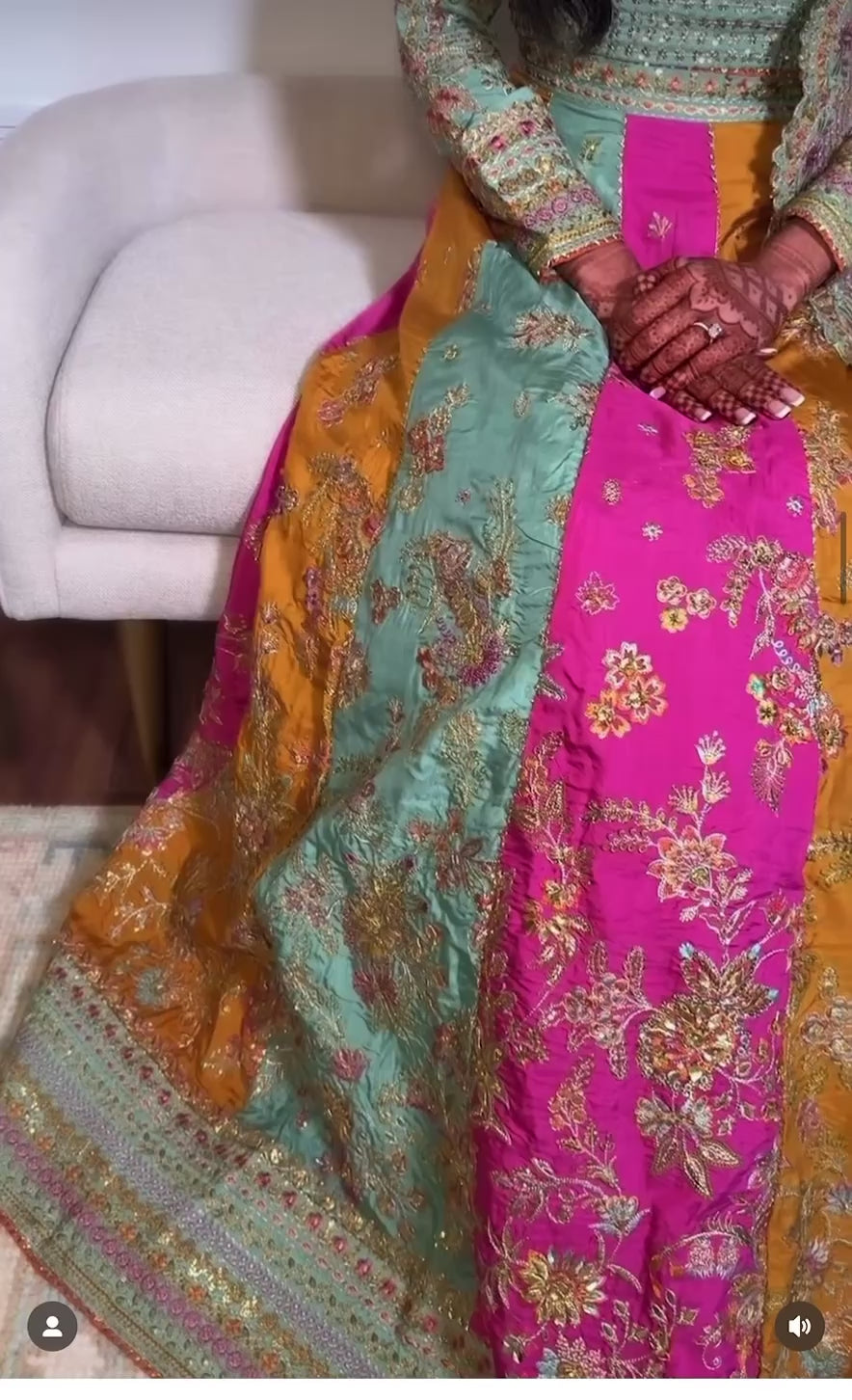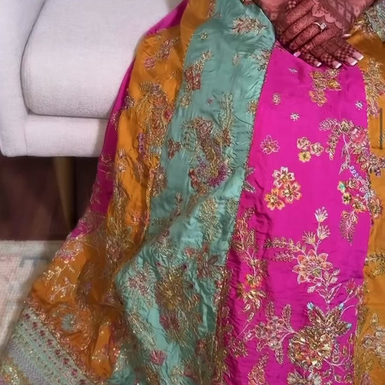 This multi-colored lehnga and choli features hand-embellished front kali pieces and neckline made of raw silk. The front panel is adorned with intricate designs in multicolors, while the back panel showcases embroidery in matching shades. The belt border, sleeves, and dupatta border are all crafted with raw silk fabric. The chiffon dupatta is embroidered with gradient shades.