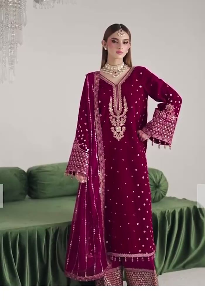 Velvet suit with chiffon embroidered dupatta and raw silk trousers.