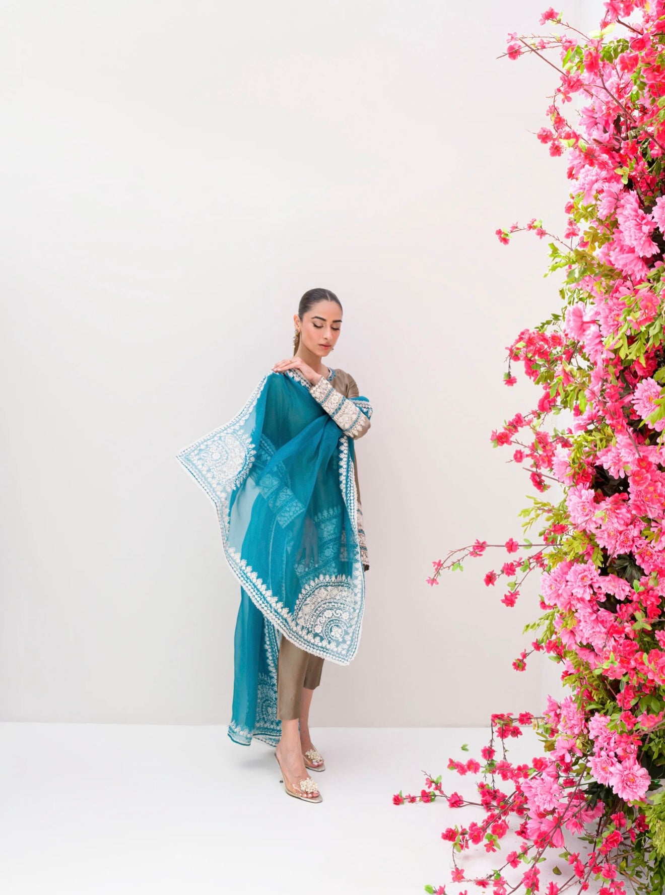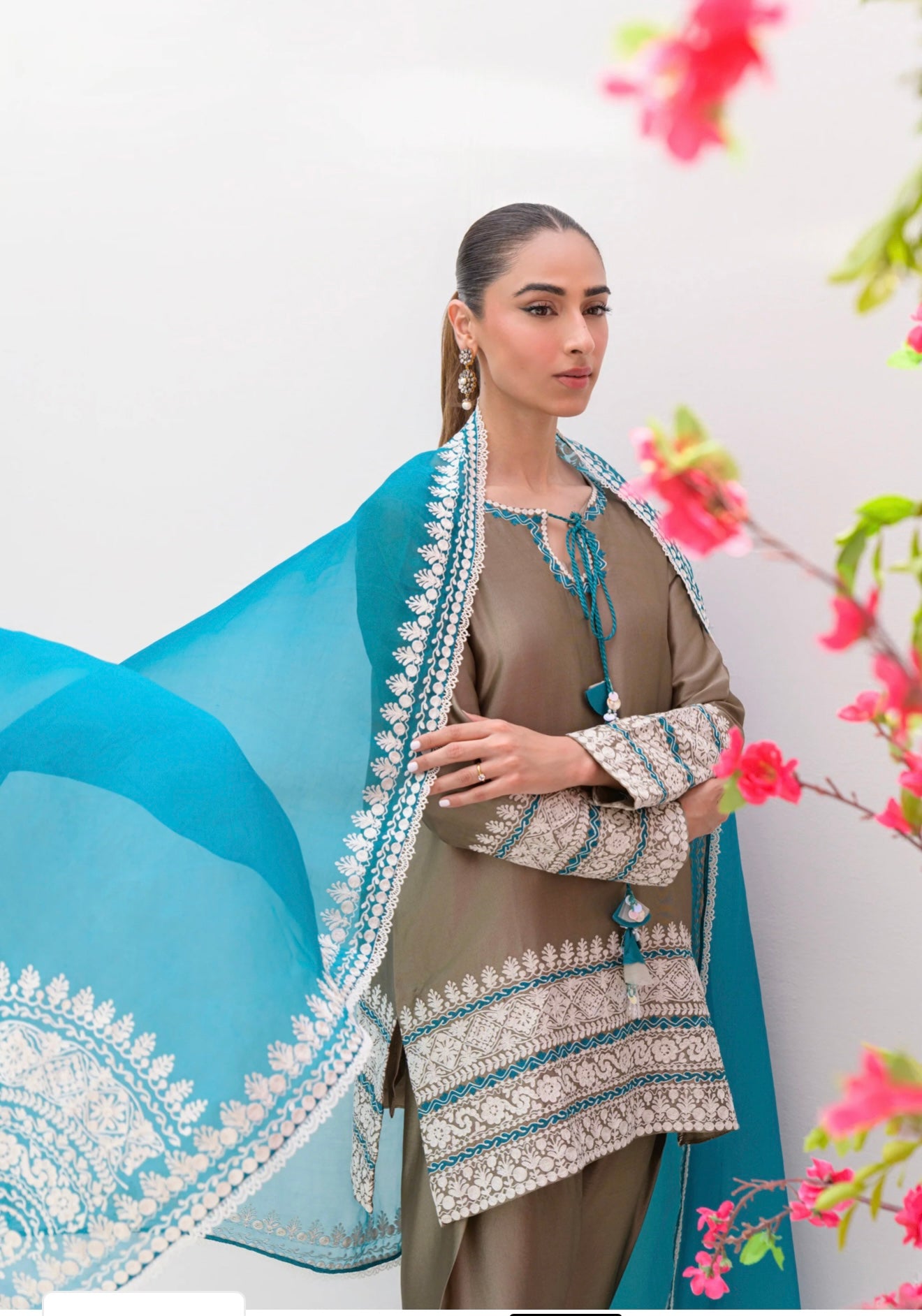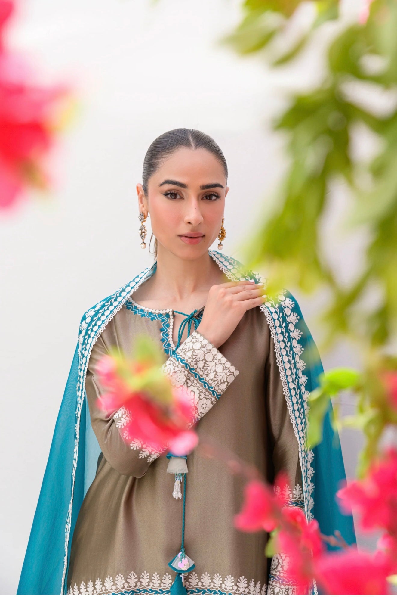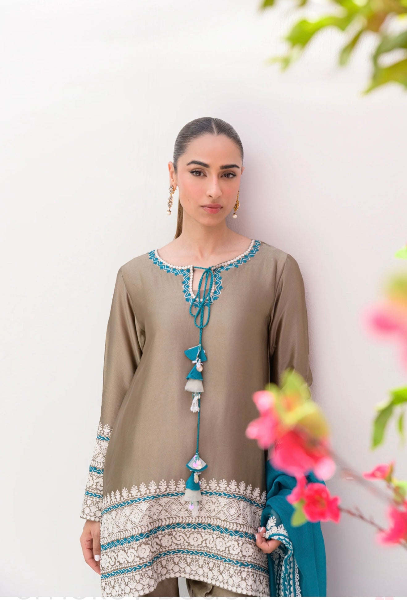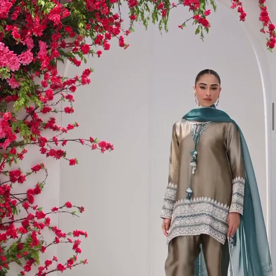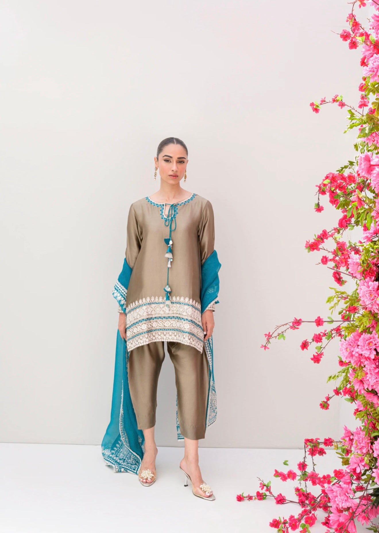 A dusty olive ensemble featuring a short-style shirt and sleek skinny shalwar, both tailored in pure sheesha silk with teal green pure kittan organza dupatta. Adorned with intricate aari work in pearl and teal shades.