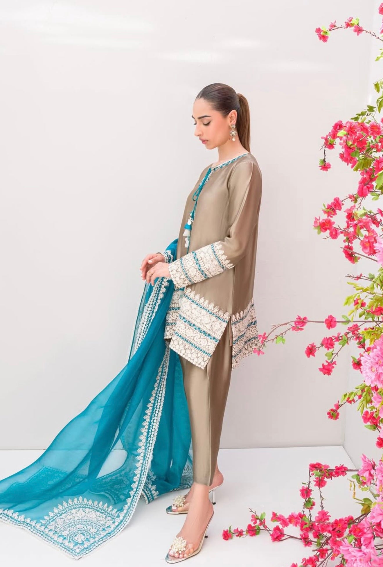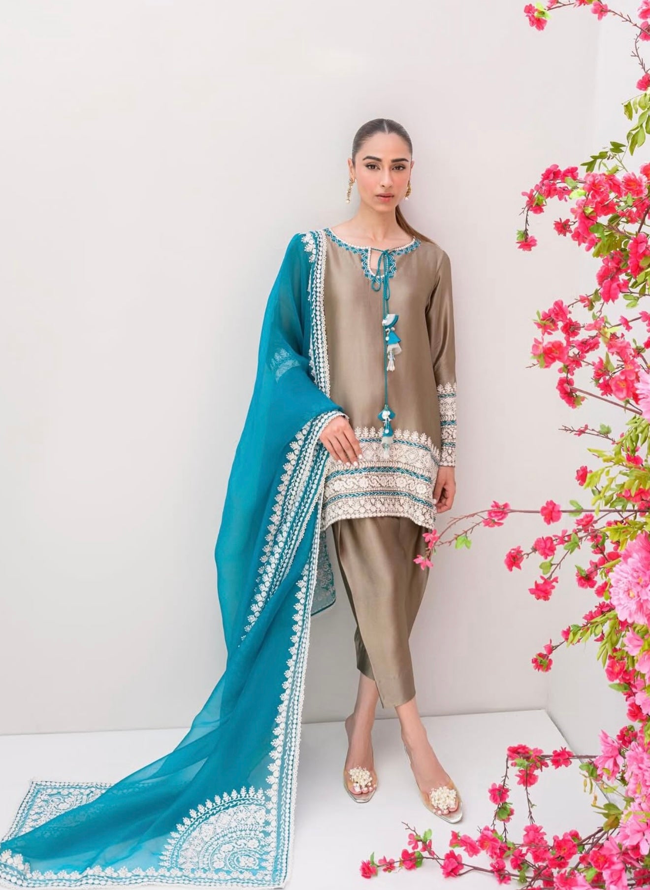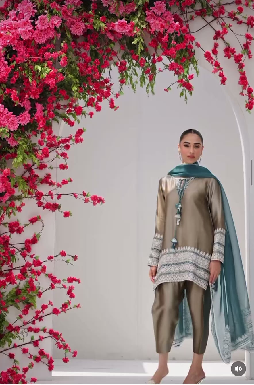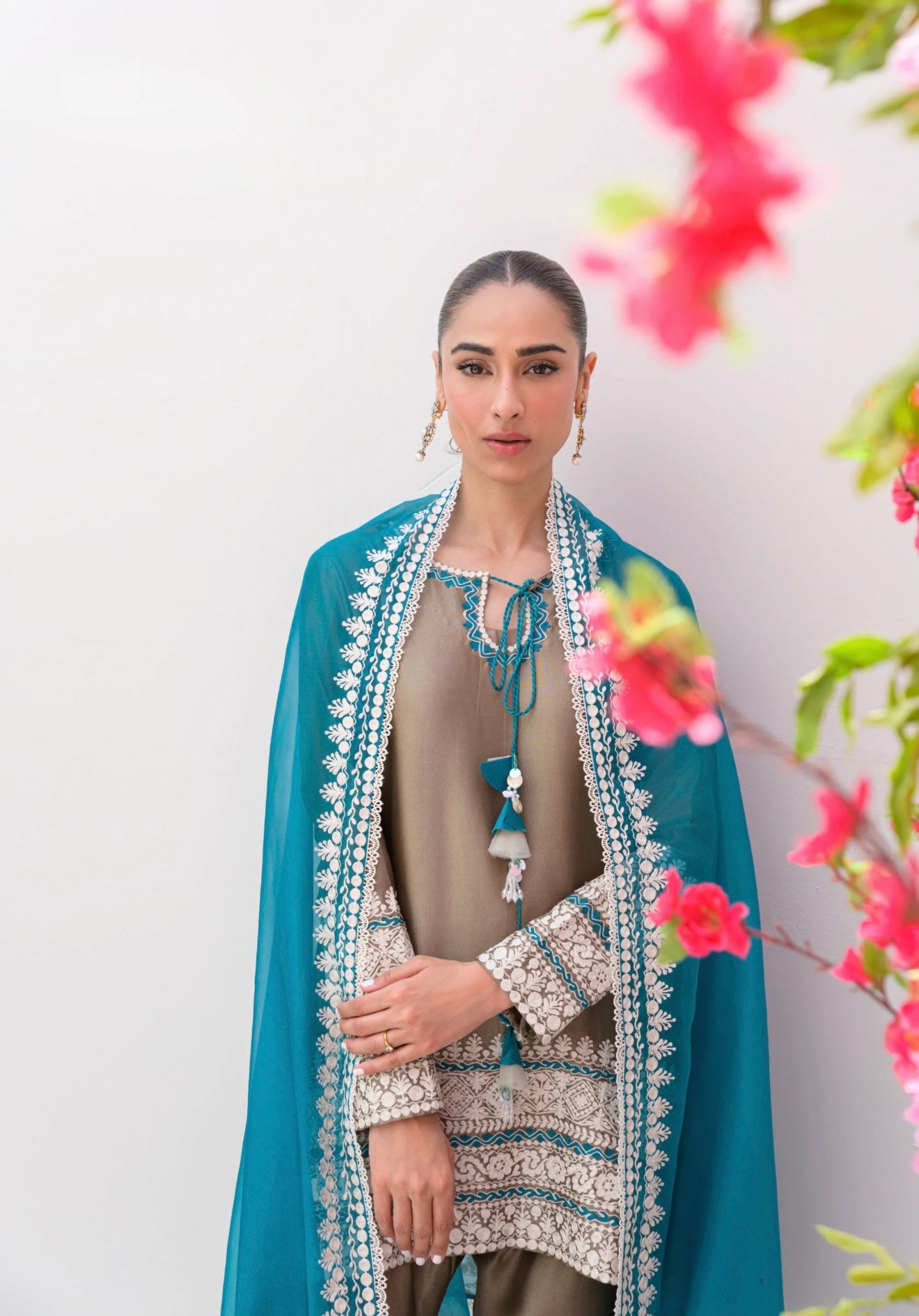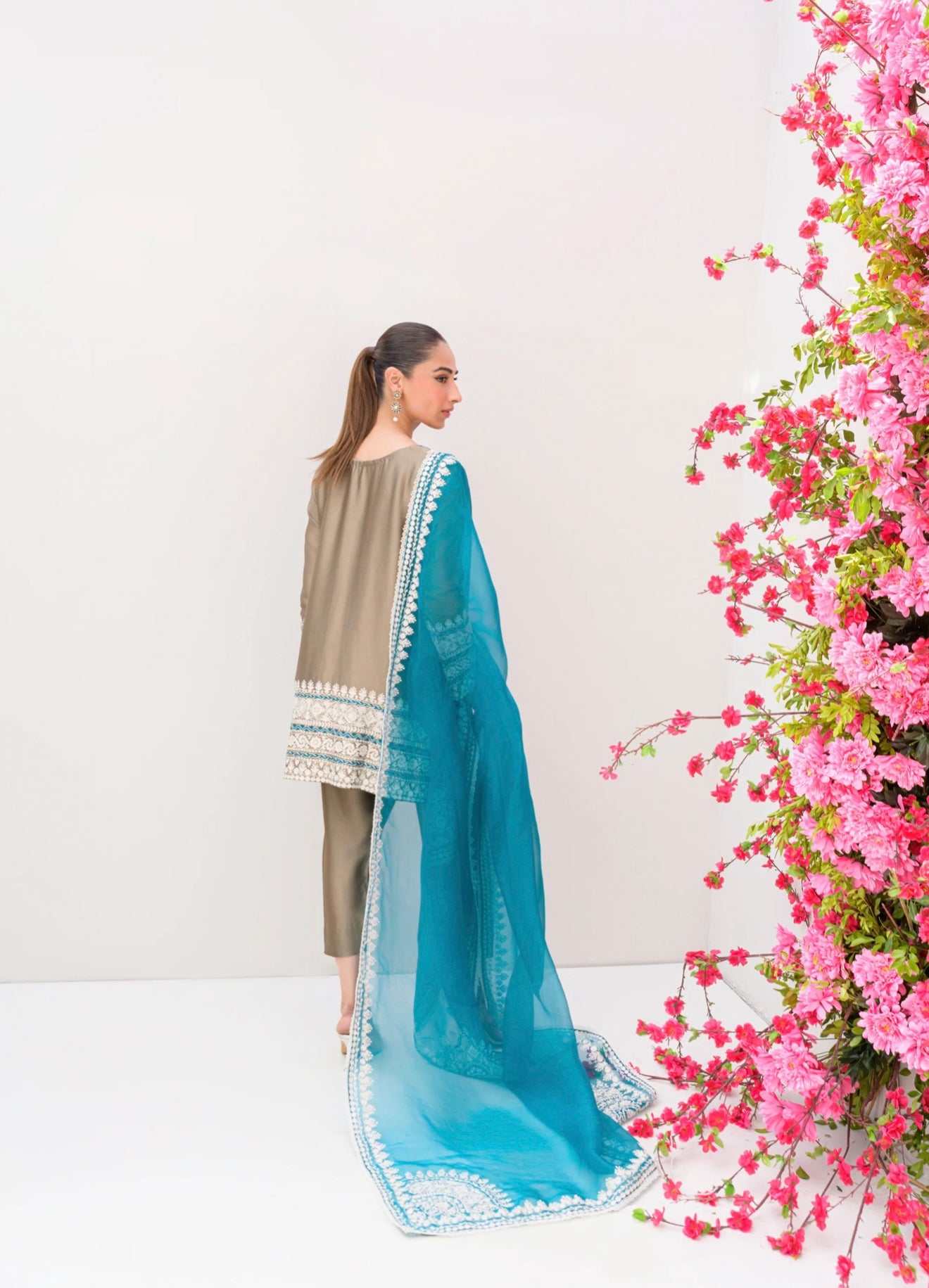 A dusty olive ensemble featuring a short-style shirt and sleek skinny shalwar, both tailored in pure sheesha silk with teal green pure kittan organza dupatta. Adorned with intricate aari work in pearl and teal shades.