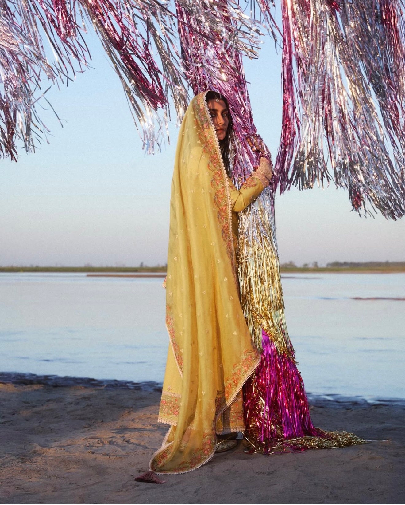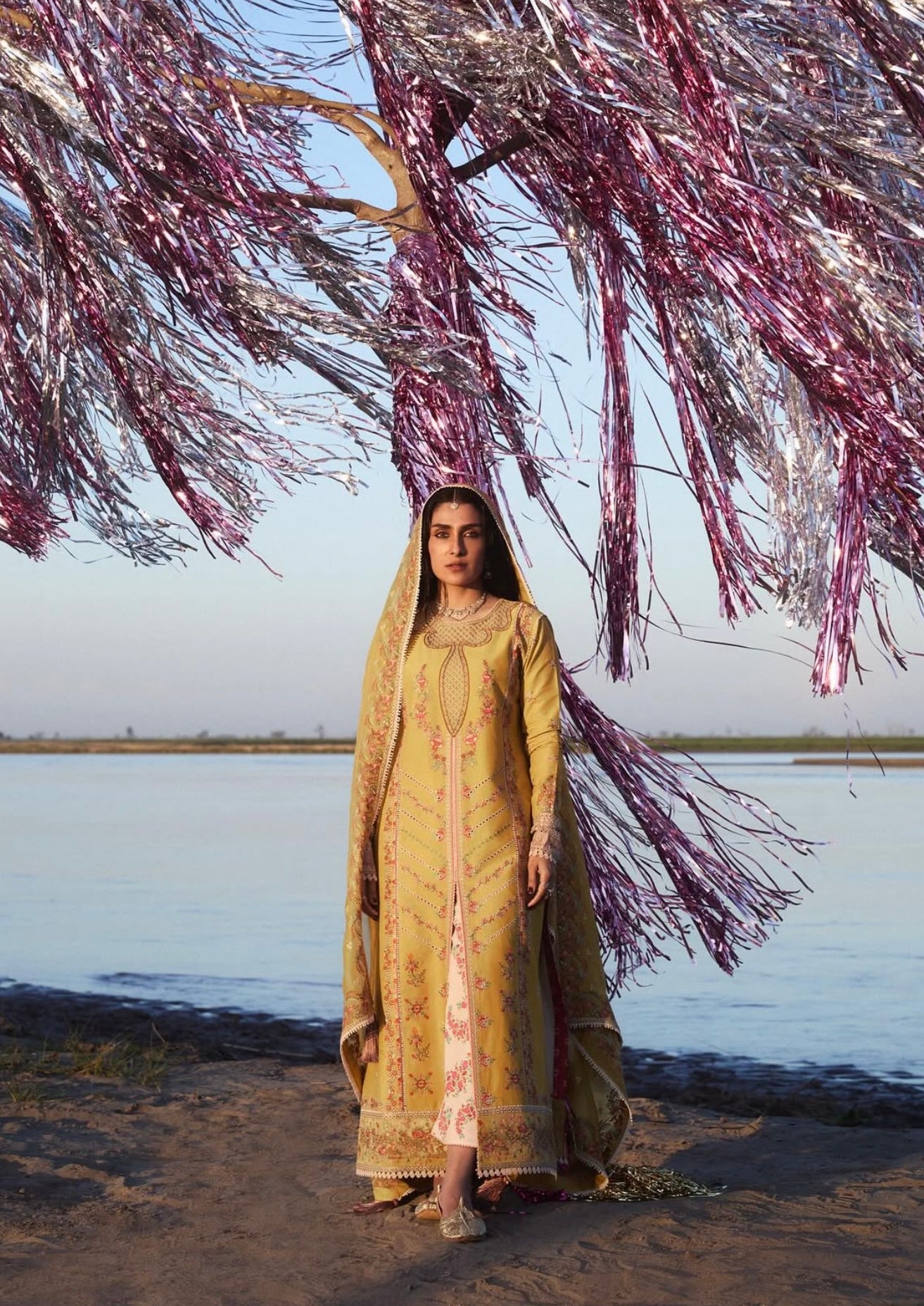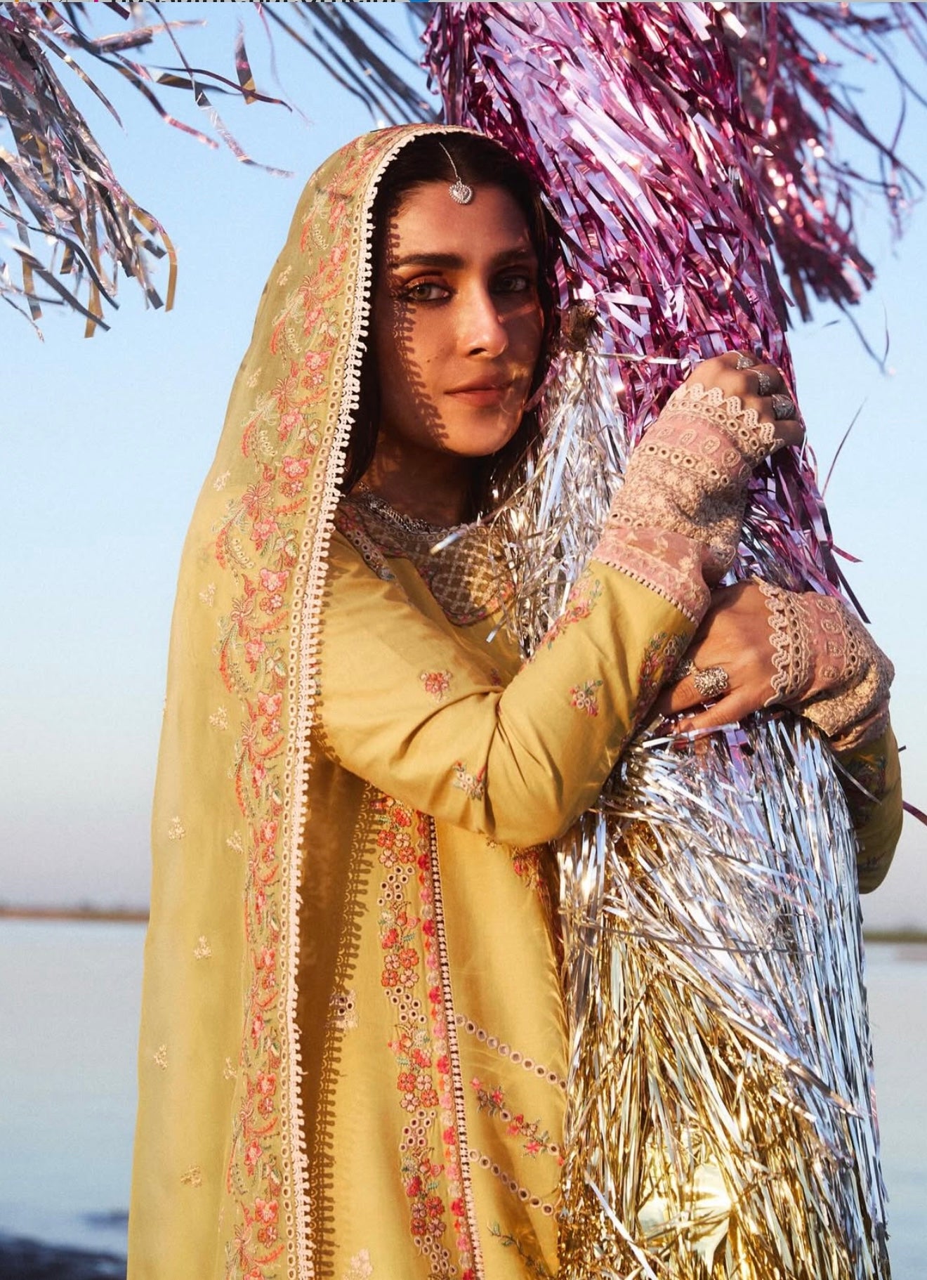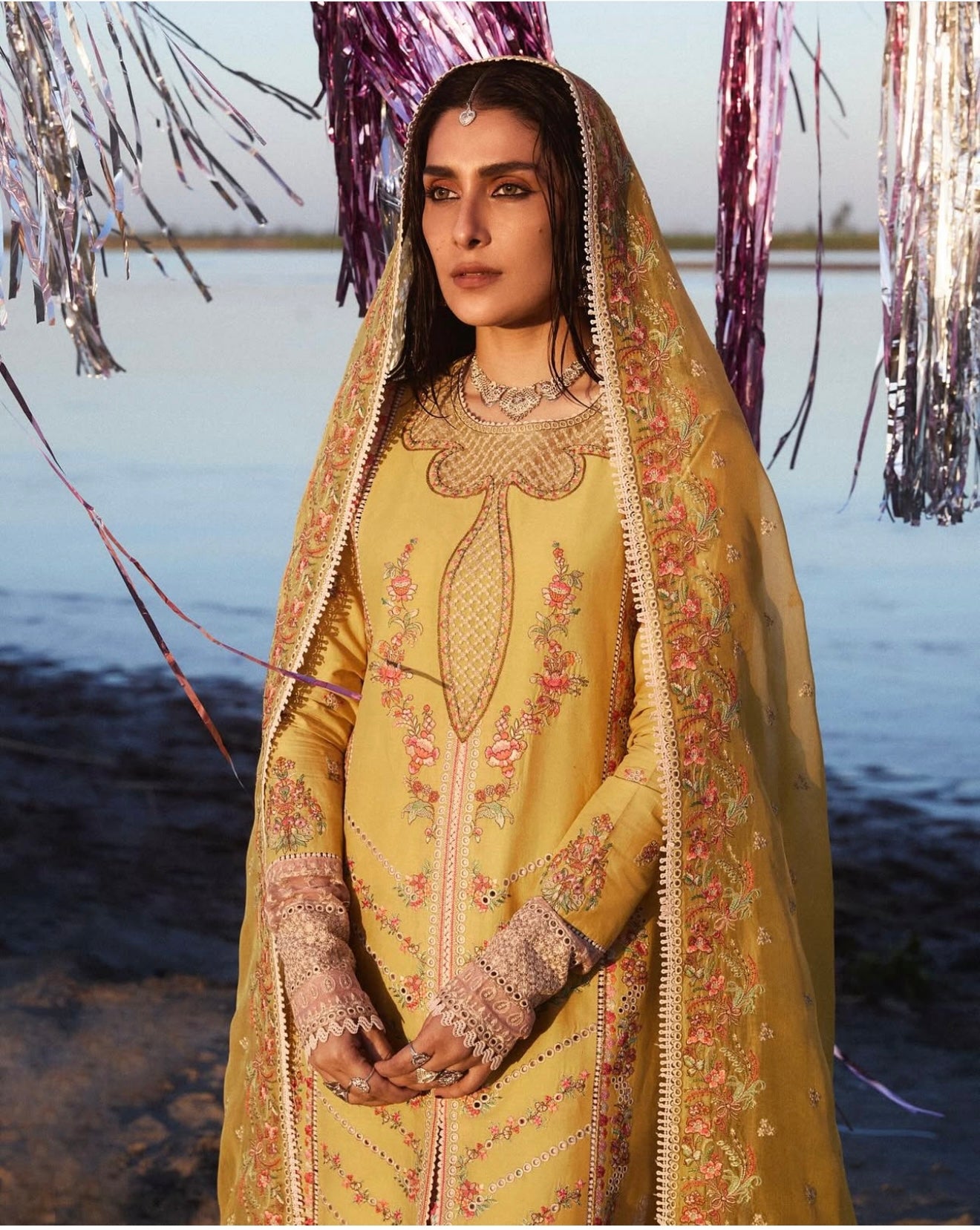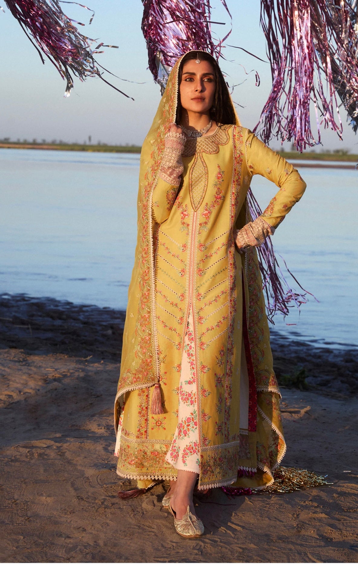 The bottom piece is a contrasting ivory Printed fabric with a floral pattern in red and green, complementing the embroidery on the kameez. Paired with matching mustard-yellow organza dupatta