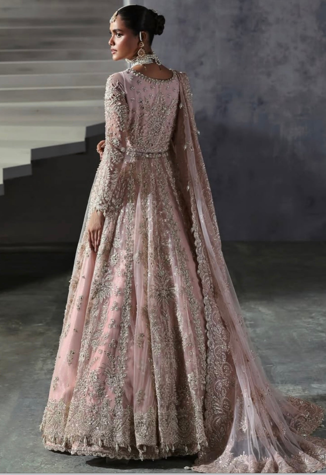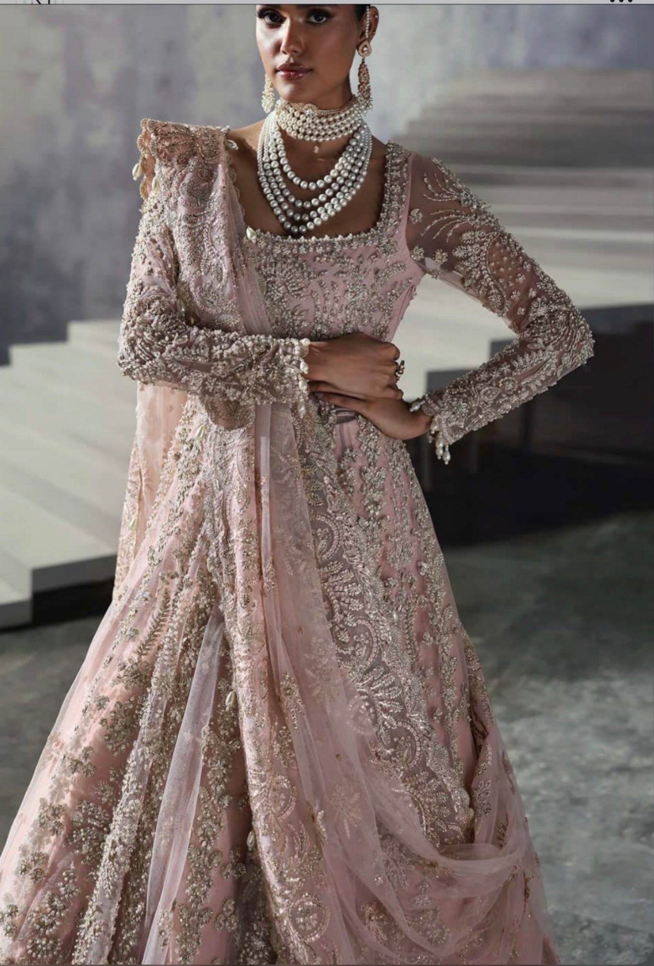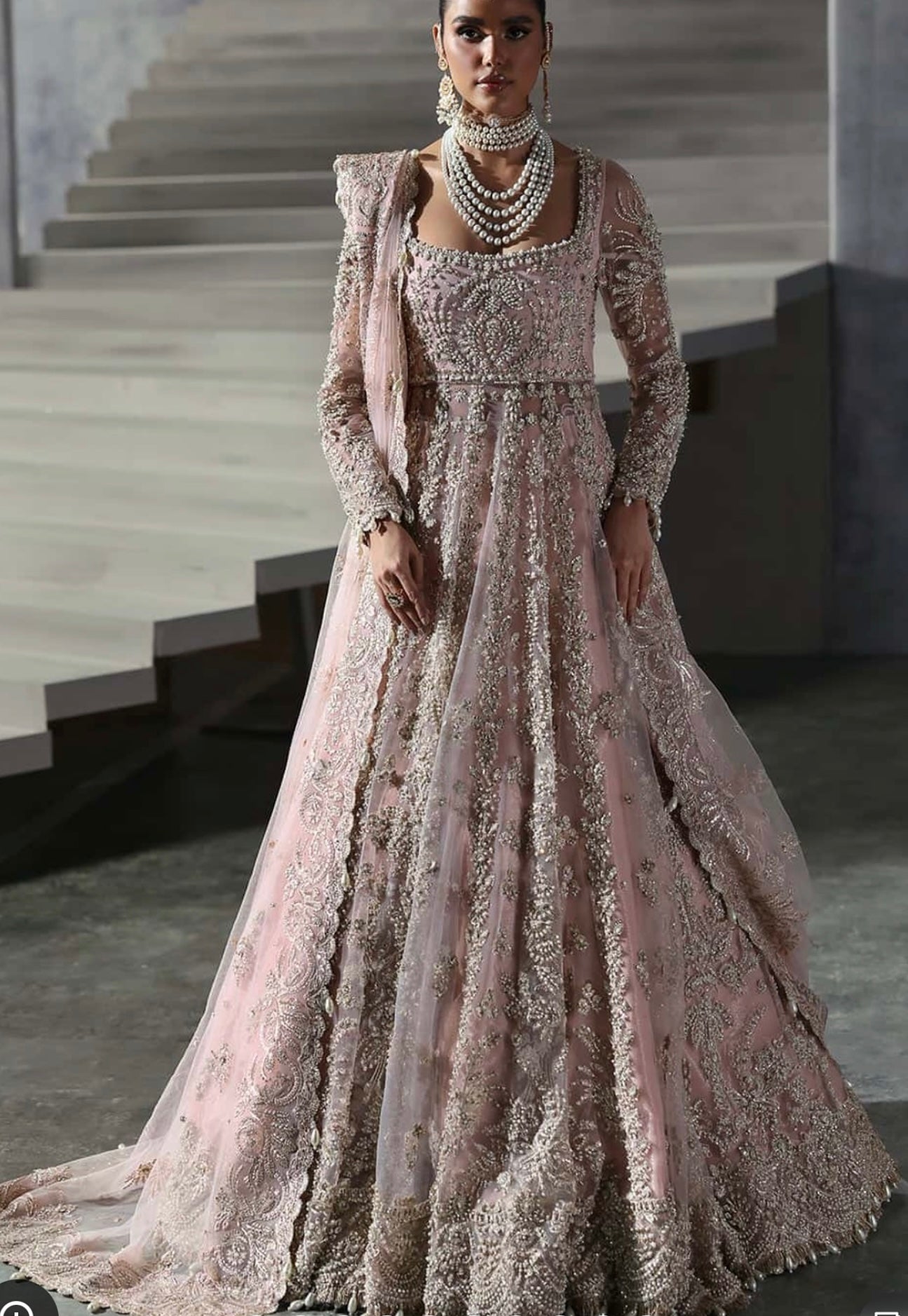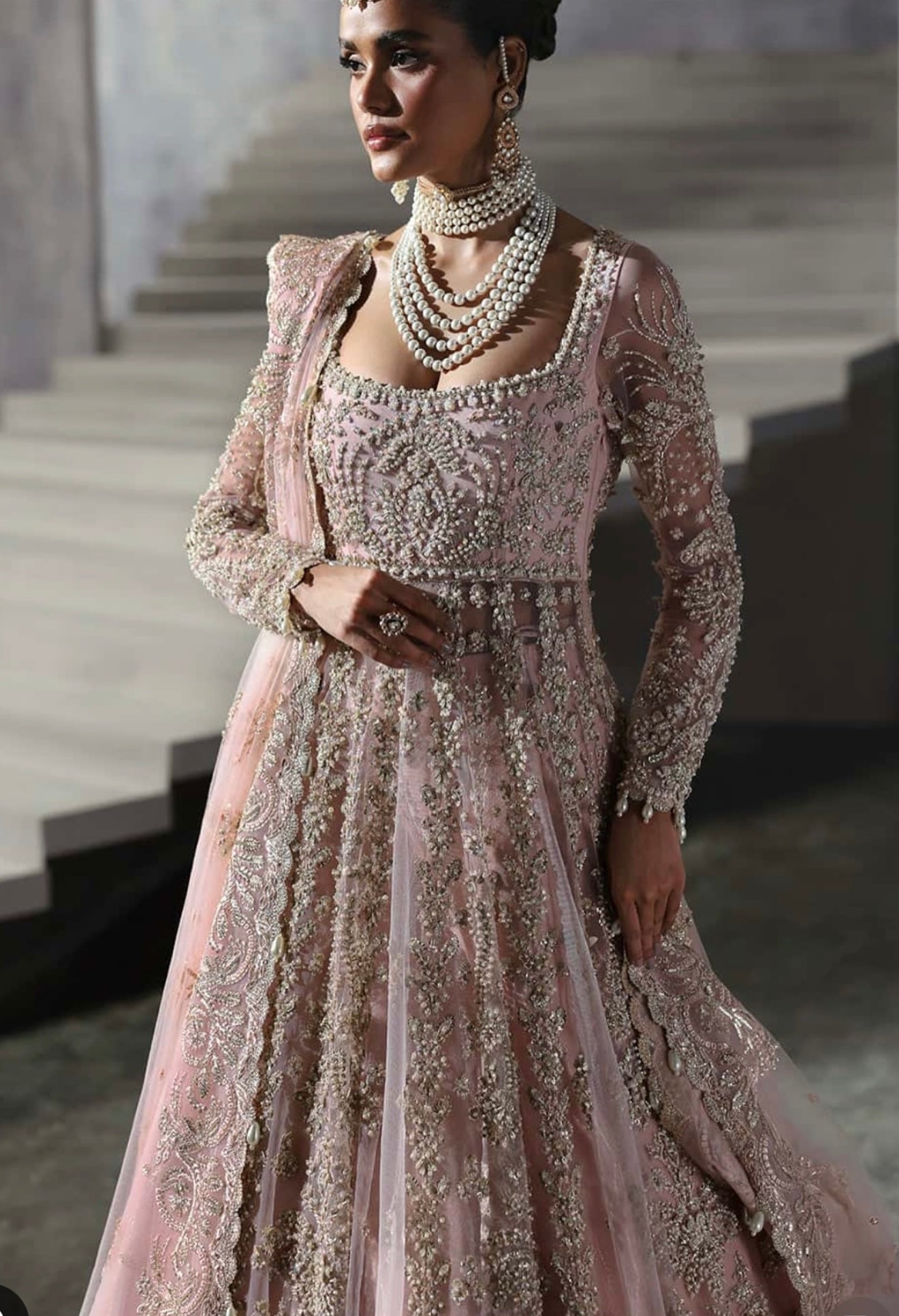 Long net embroidered and embellished peshwas dress with zari tissue material skirt and net embroidered dupatta.