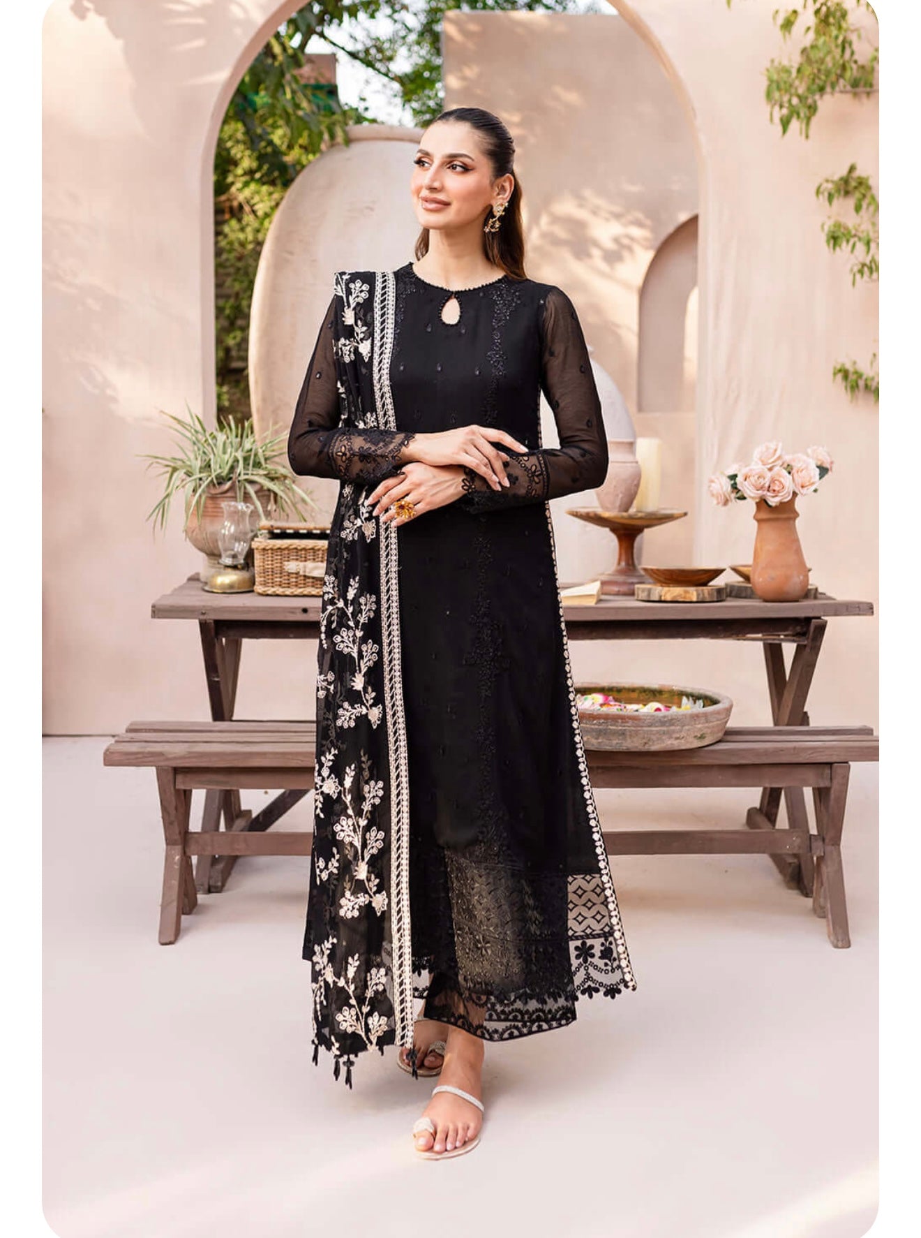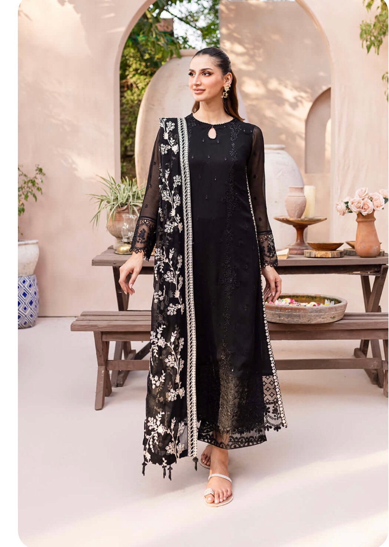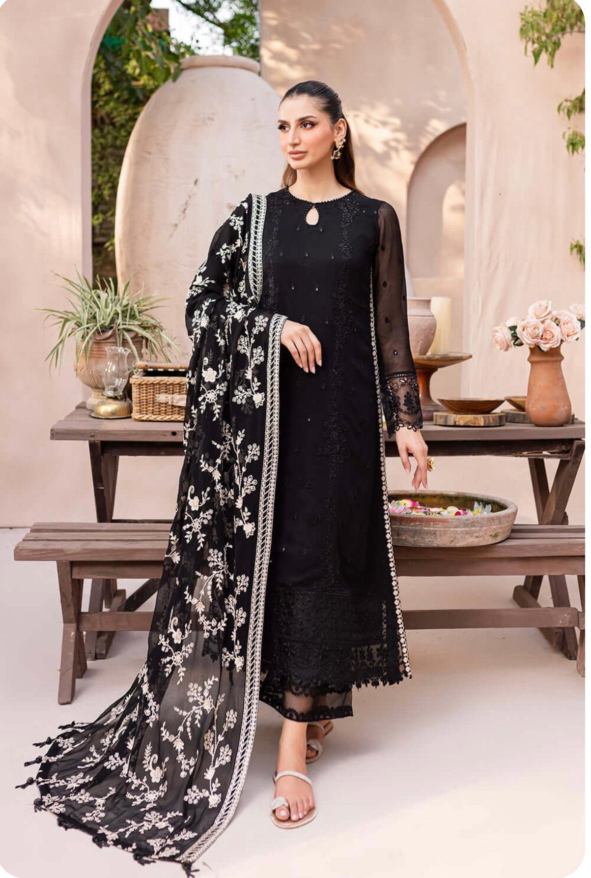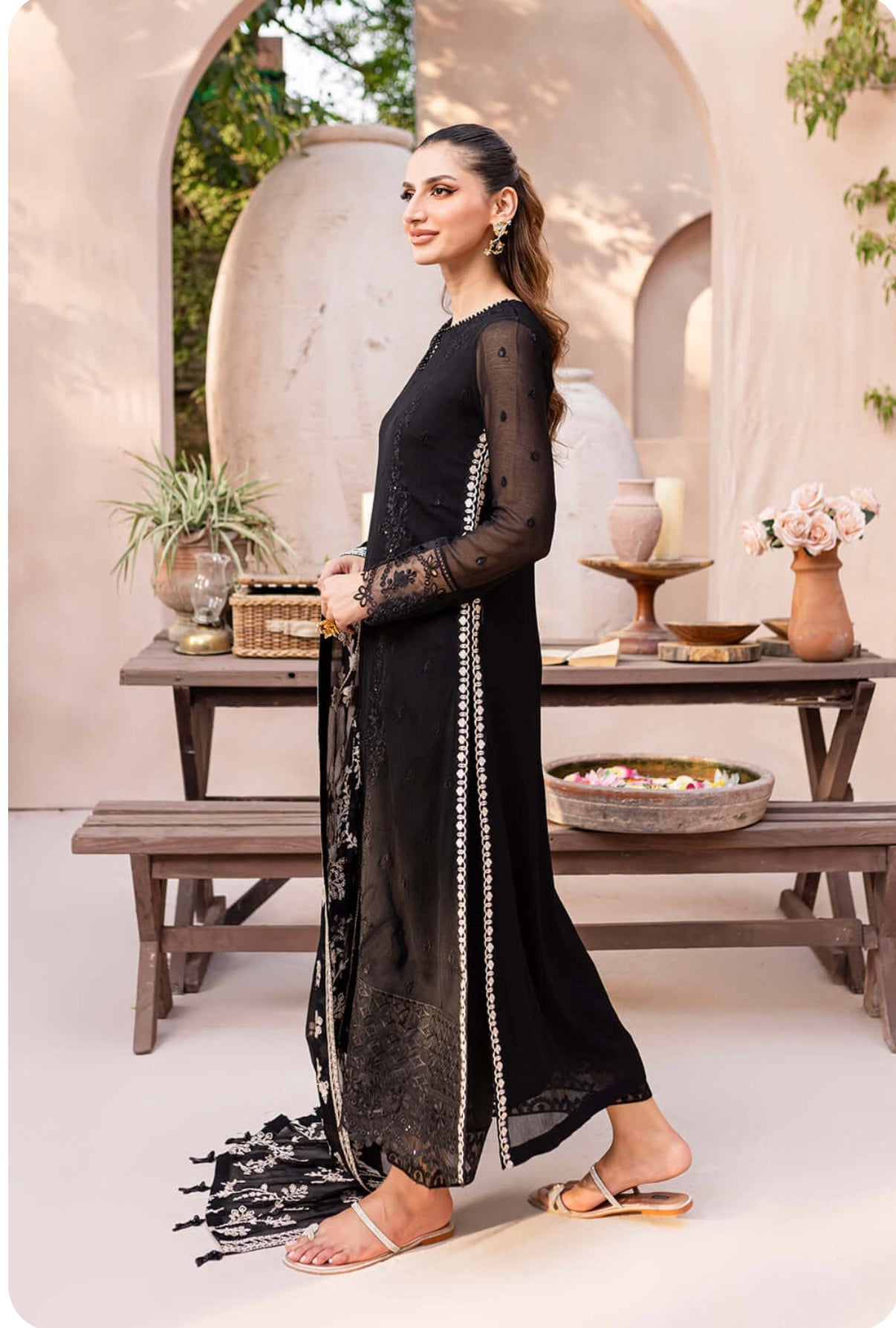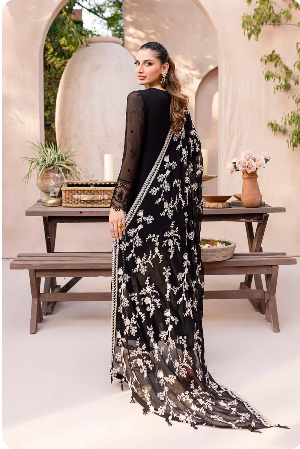 Starry Bliss, midnight black dress with sequins embroidered chiffon on the front and on the sleeves. With 5 meters of sequins embroidered organza front and back side laces. Paired with a 2.5 yard contrast embroidered chiffon dupatta. Includes inner fabric and 2.5 yards of dyed raw silk for the bottom.
