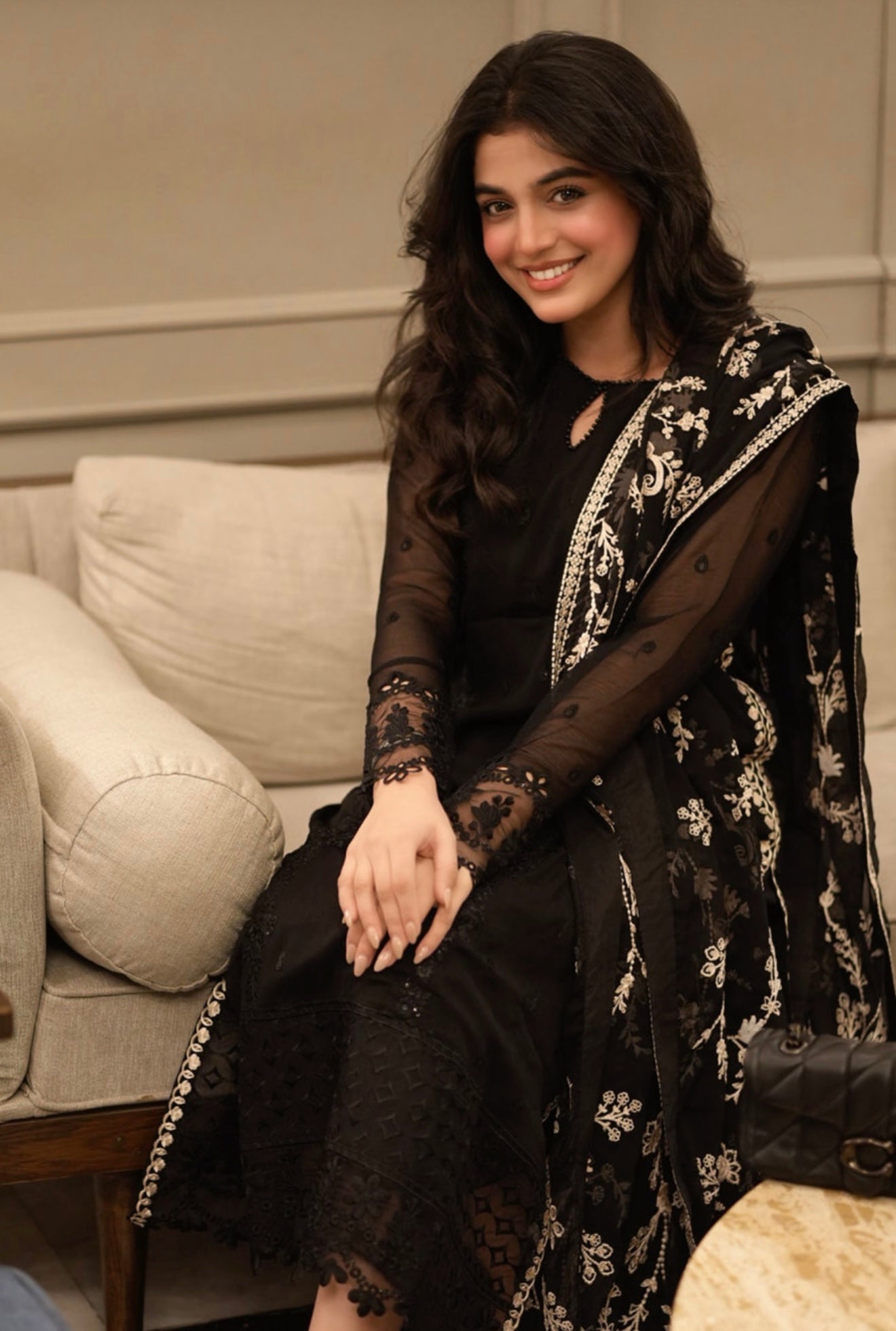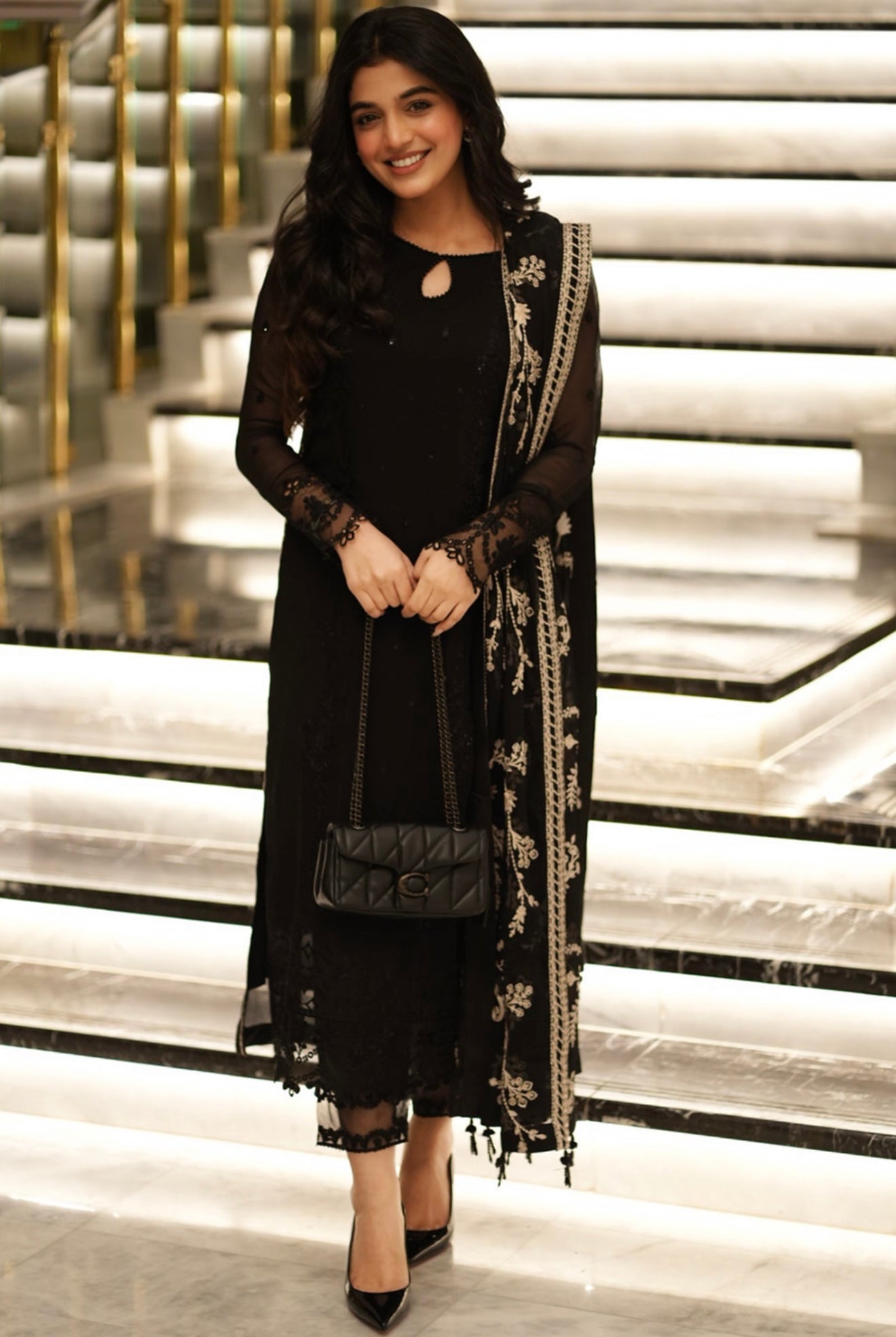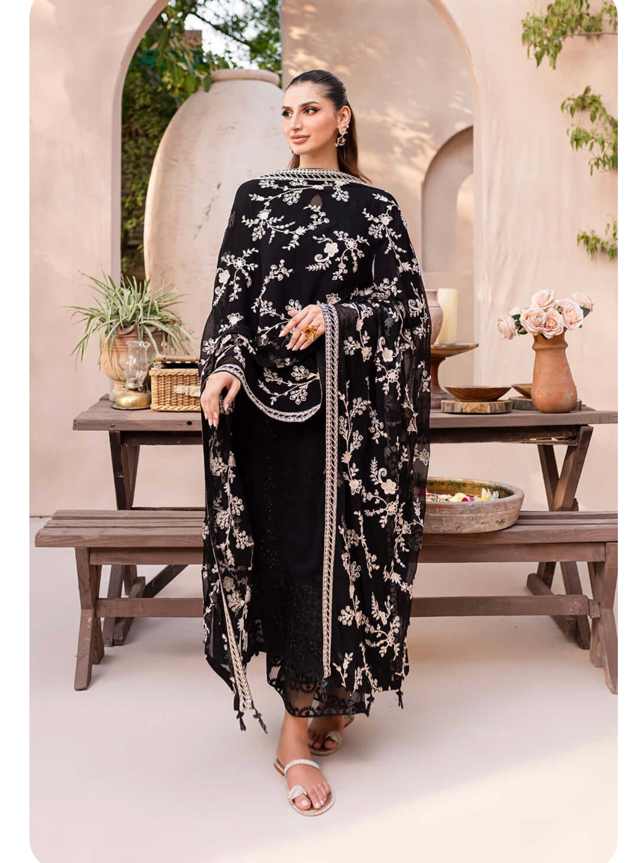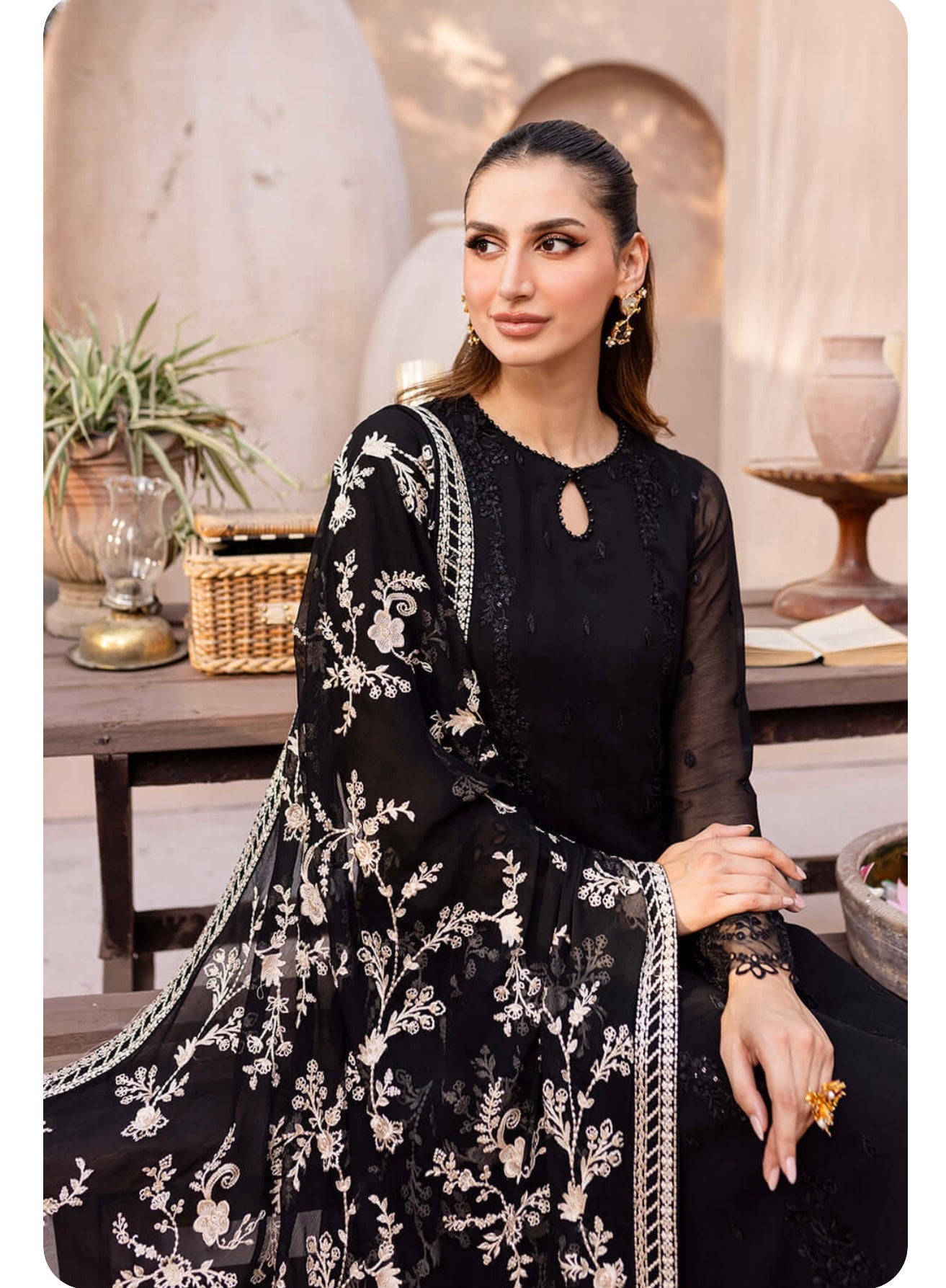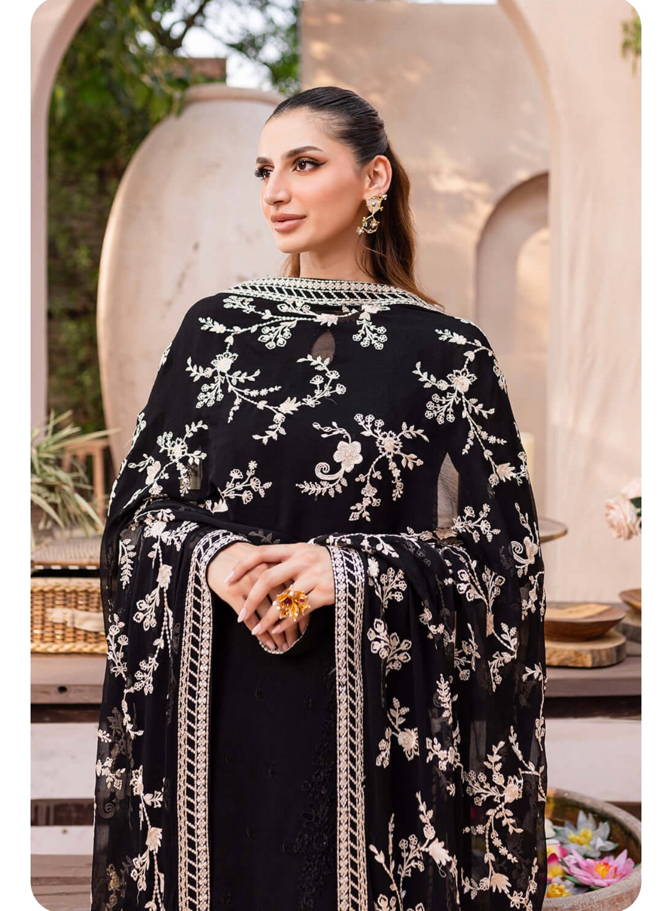 Starry Bliss, midnight black dress with sequins embroidered chiffon on the front and on the sleeves. With 5 meters of sequins embroidered organza front and back side laces. Paired with a 2.5 yard contrast embroidered chiffon dupatta. Includes inner fabric and 2.5 yards of dyed raw silk for the bottom.
