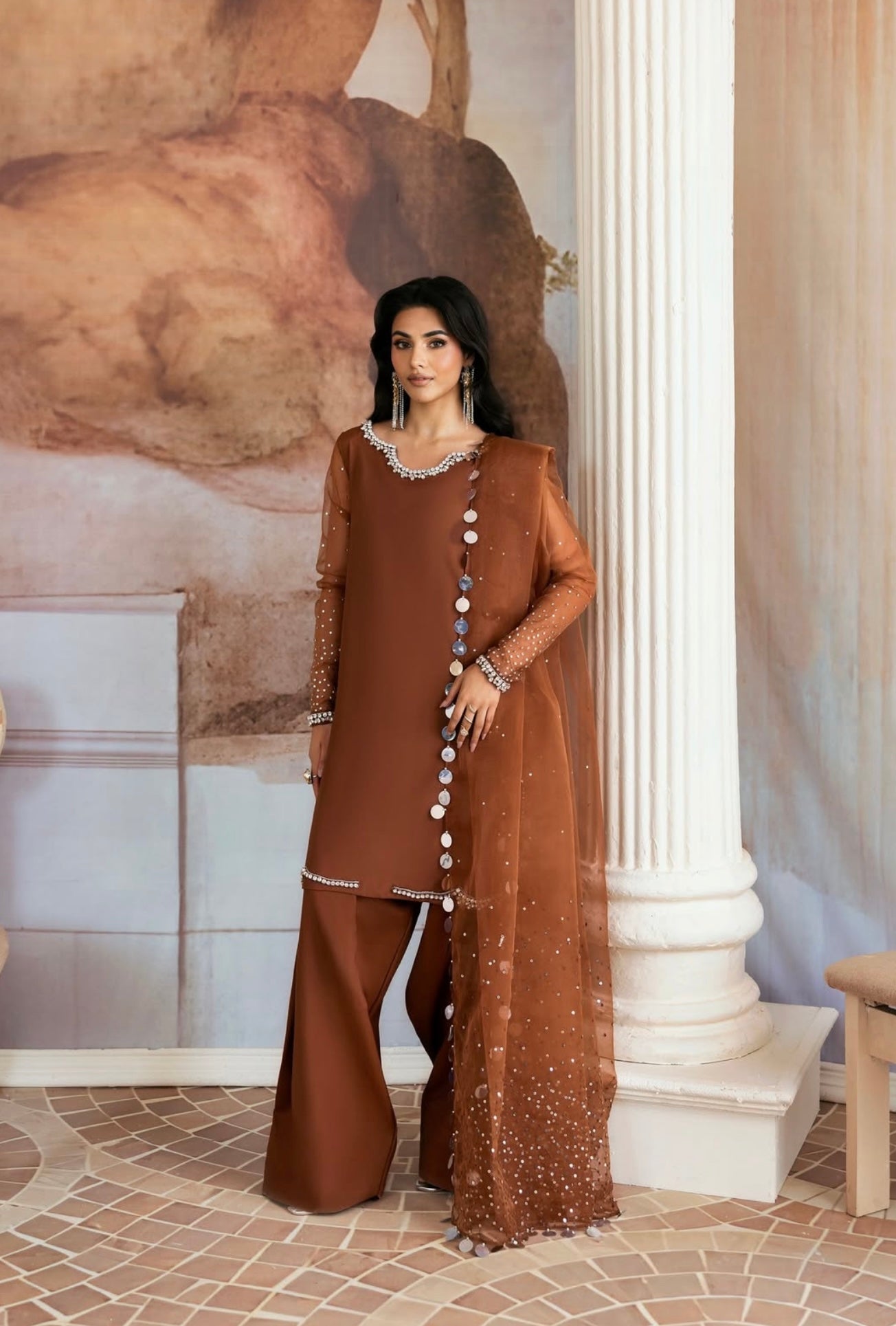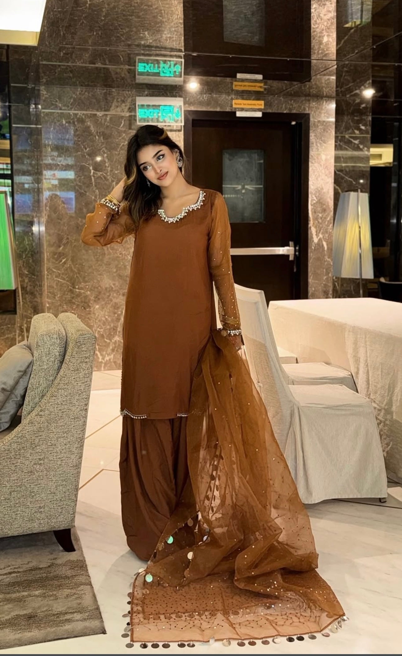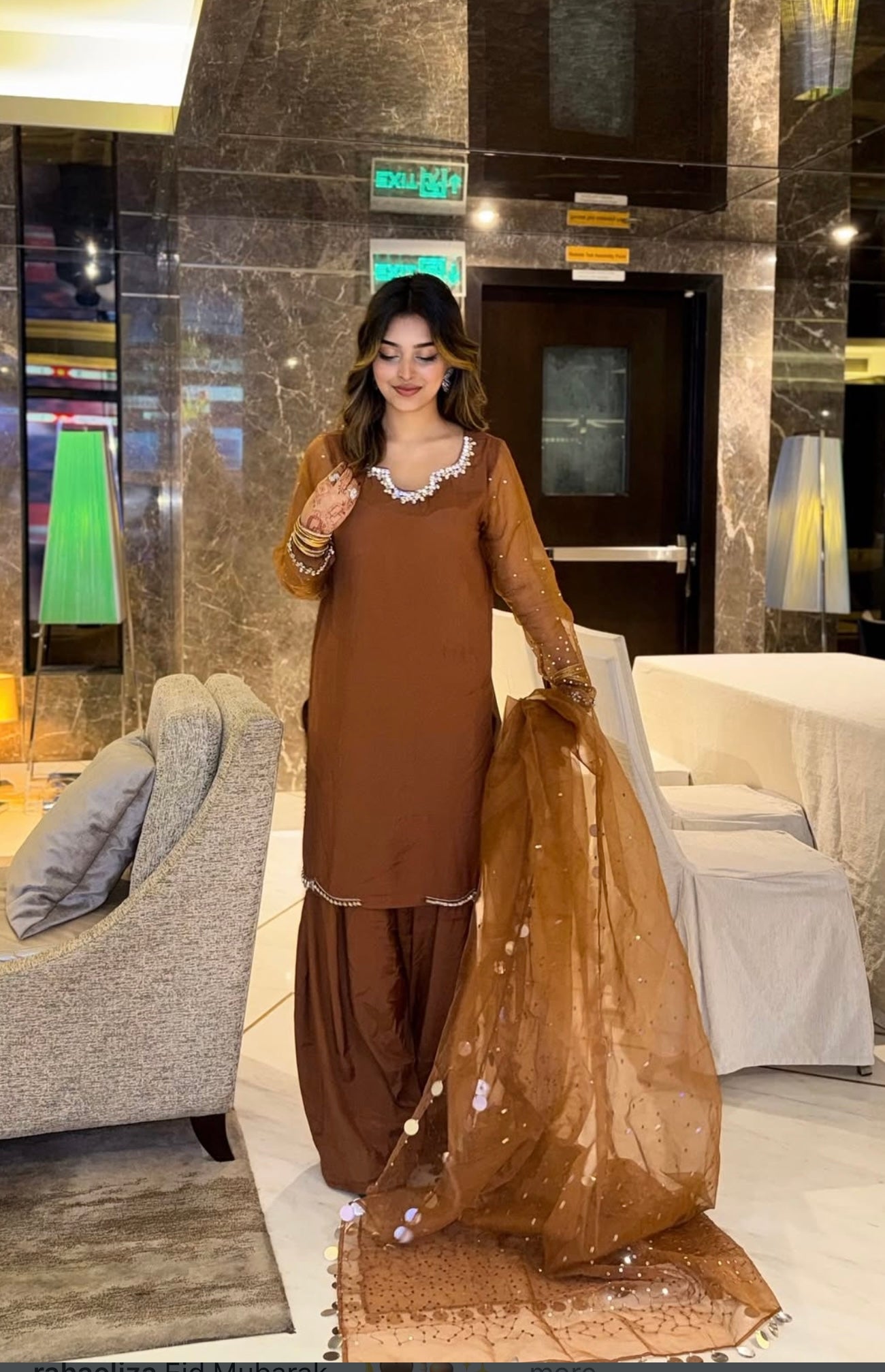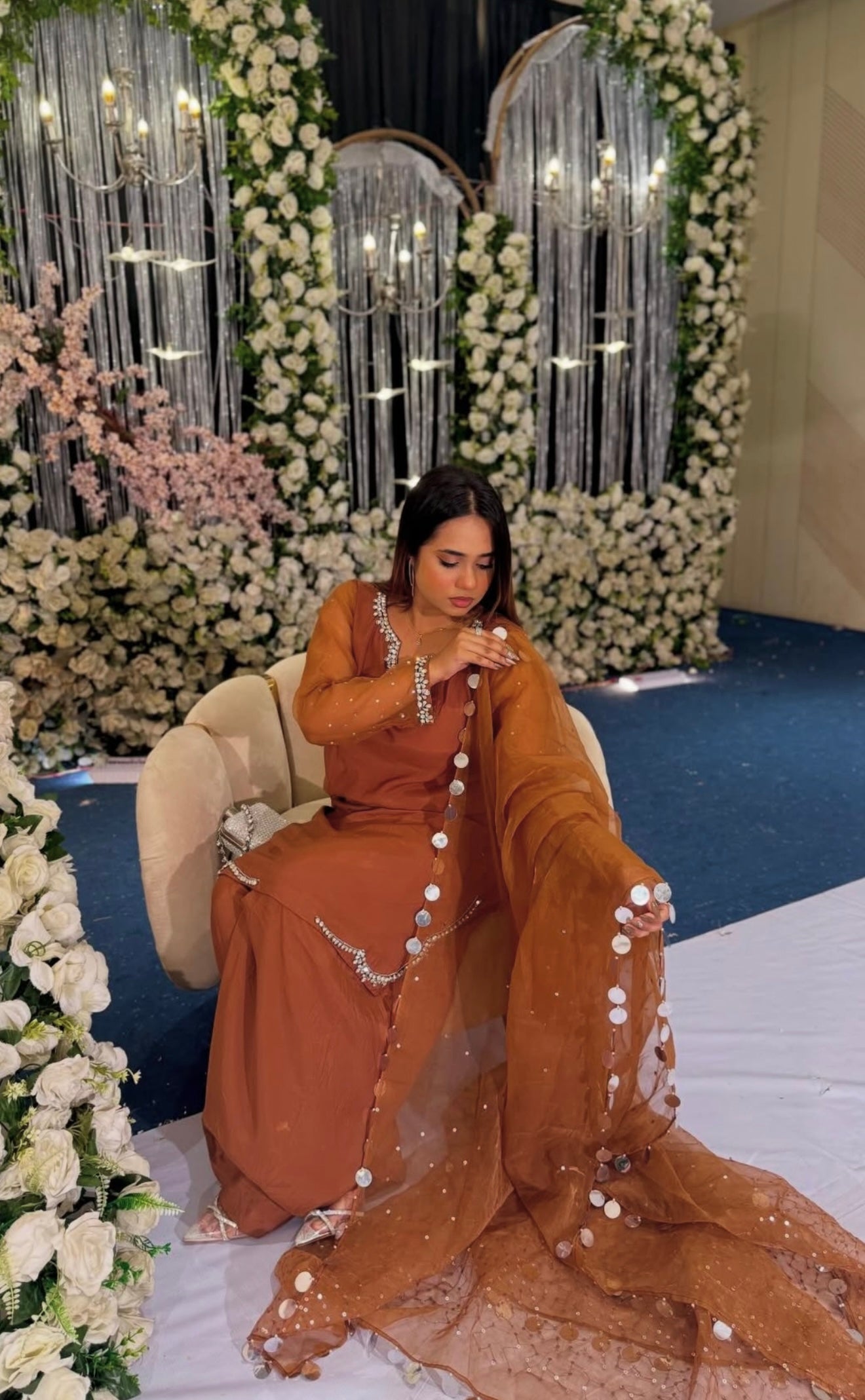 Rust silk short shirt with delicate embroidery and hand embellishments, paired with farshi shalwar and embellished organza dupatta.