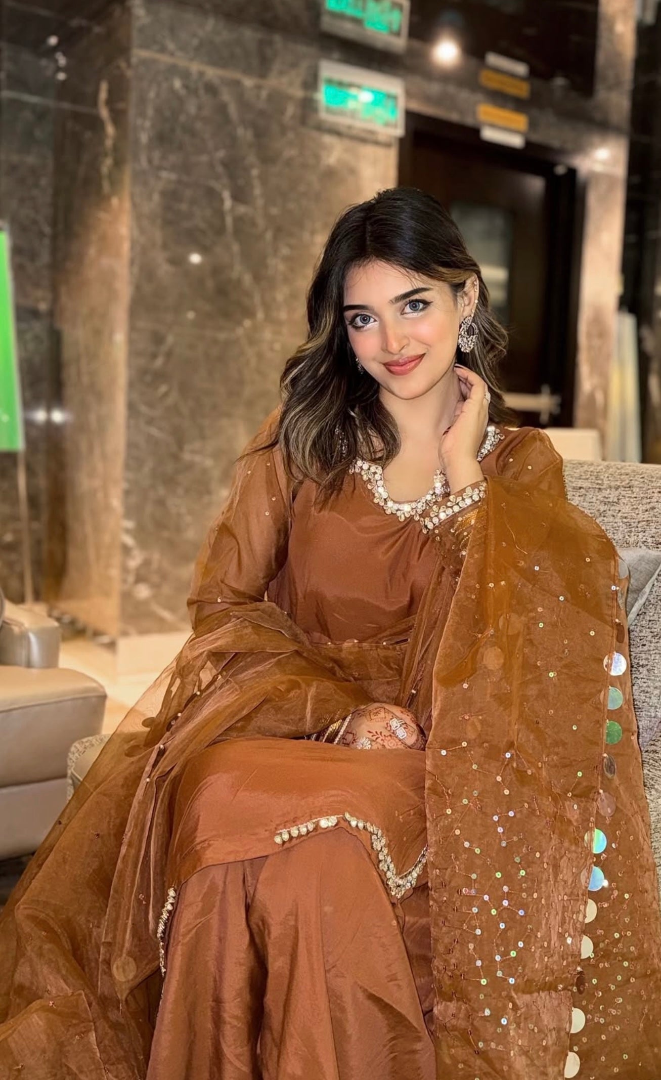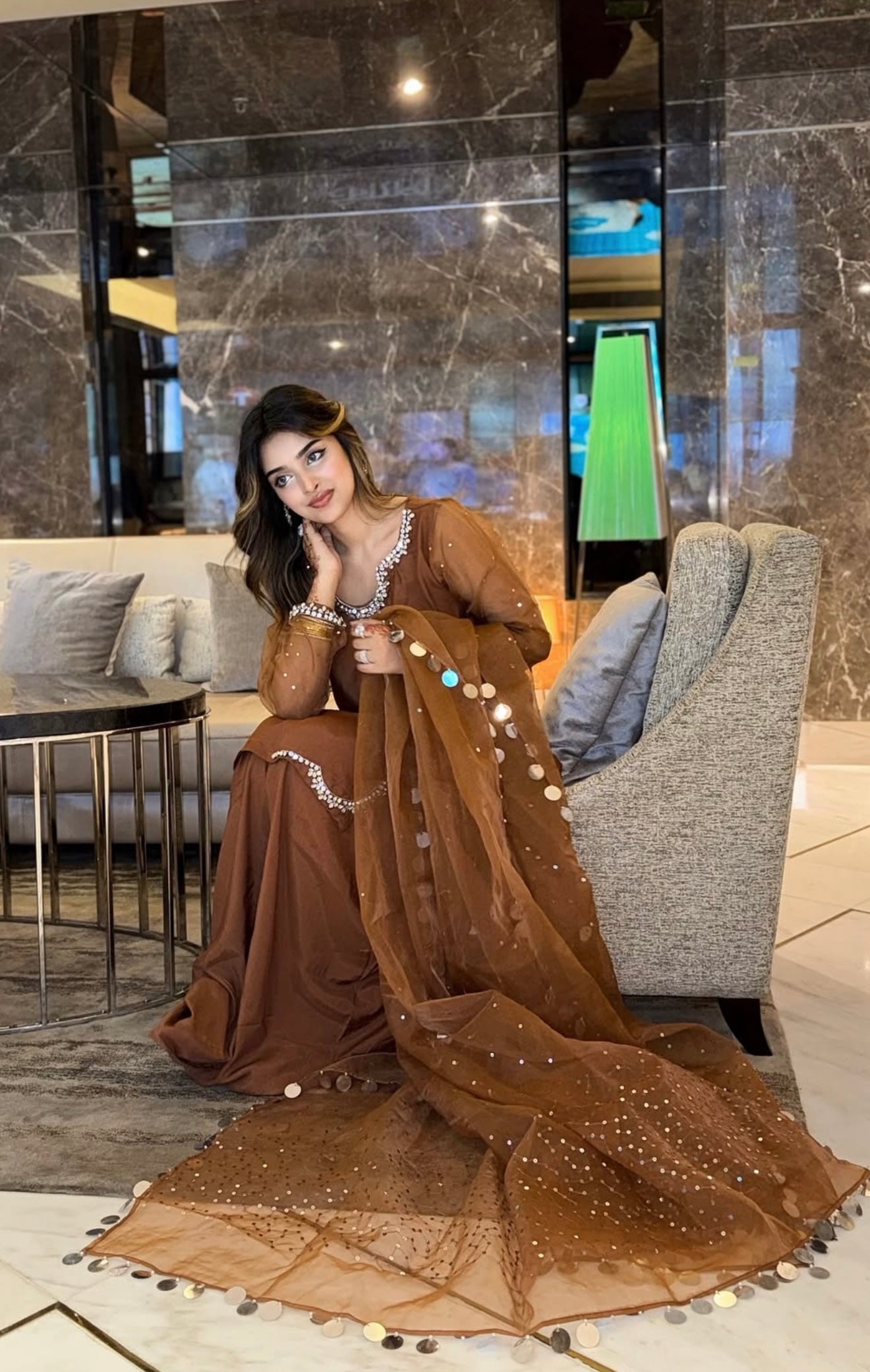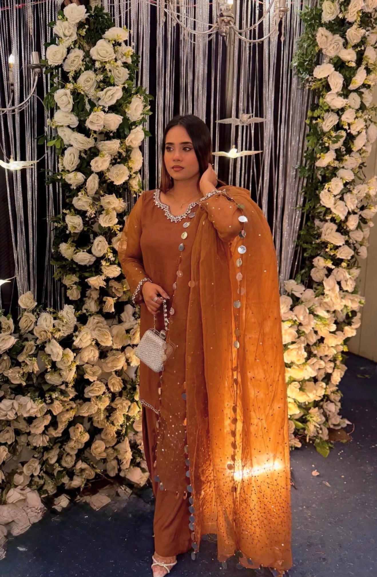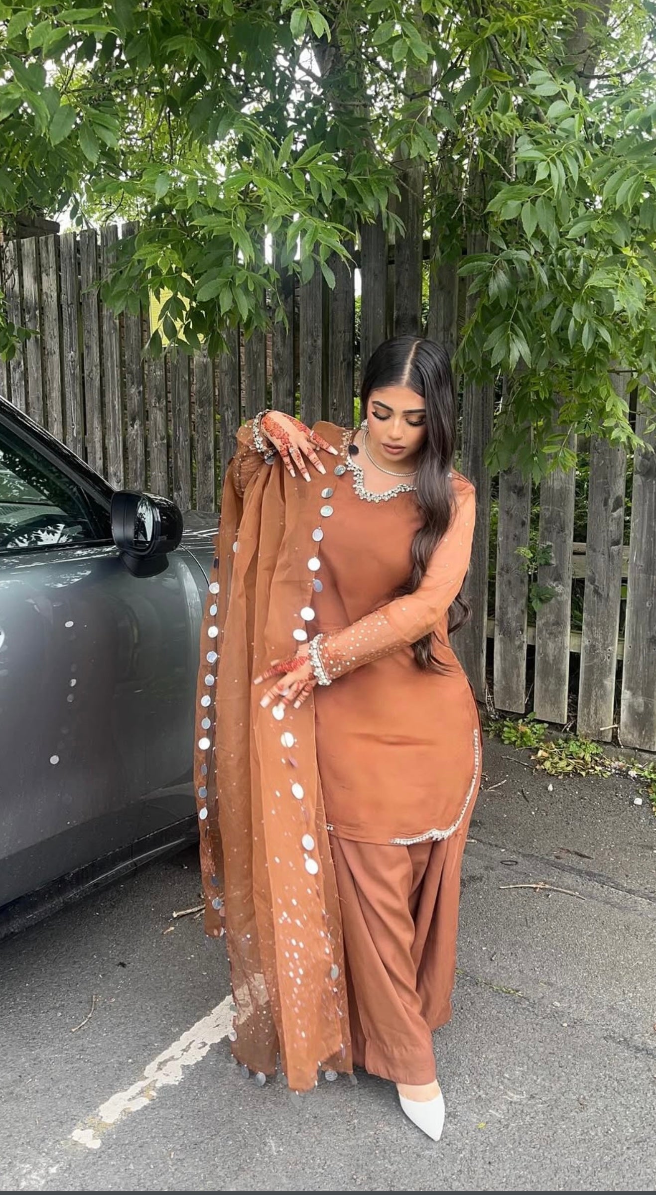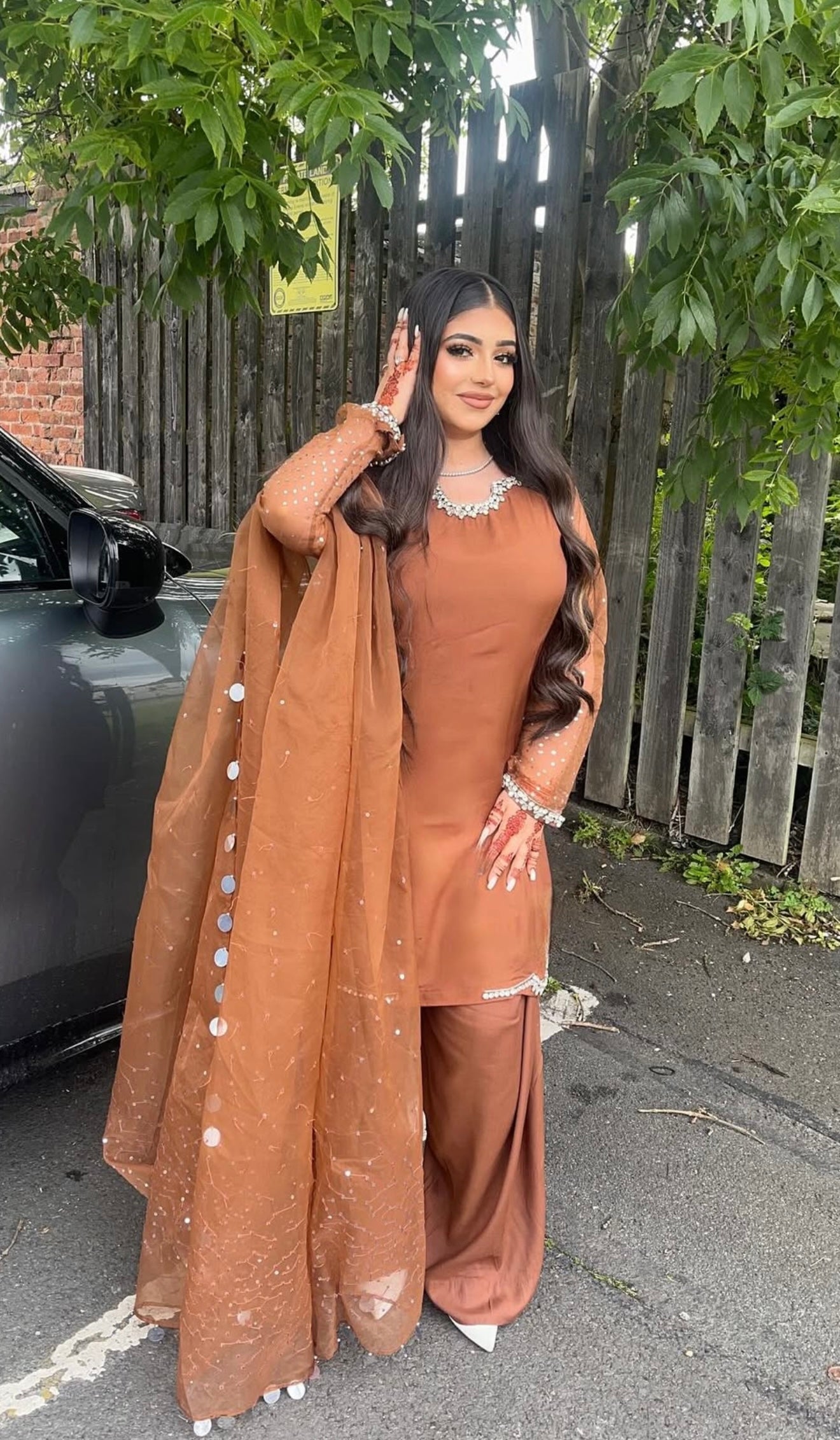 Rust silk short shirt with delicate embroidery and hand embellishments, paired with farshi shalwar and embellished organza dupatta.