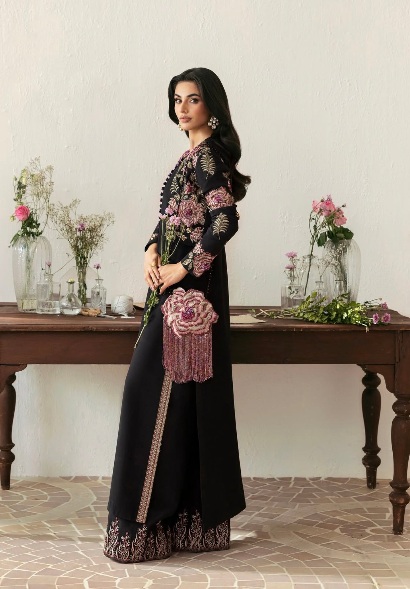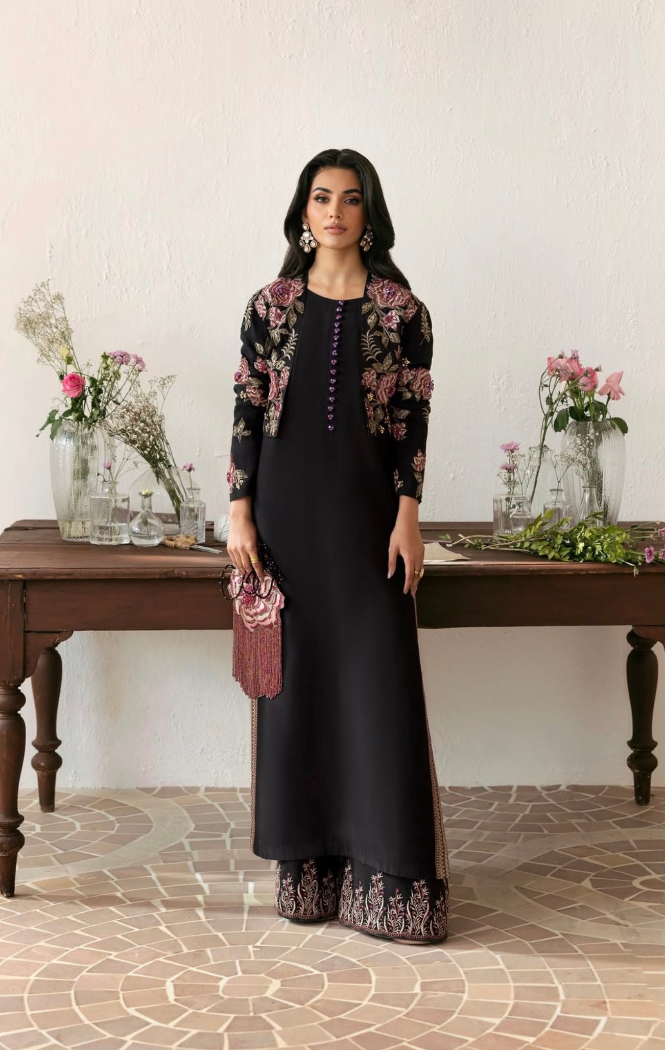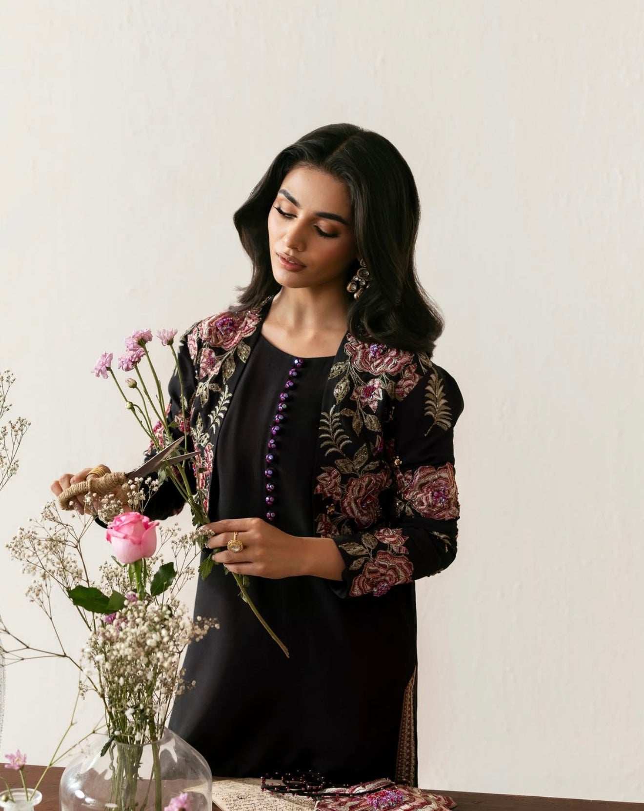 A 3-piece ensemble featuring a black shirt with slit embroidery and embellished front buttons, paired with embroidered embellished jacket and trousers