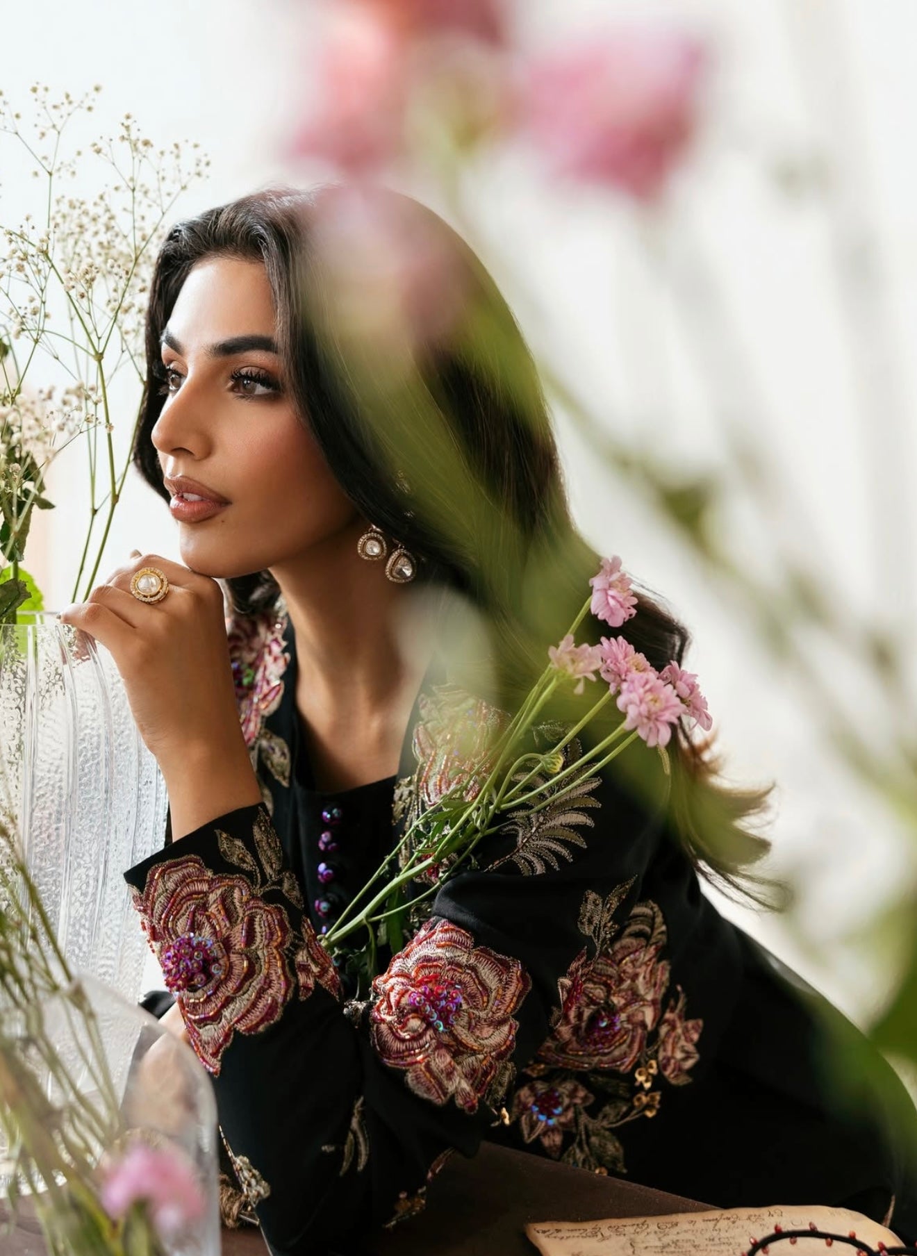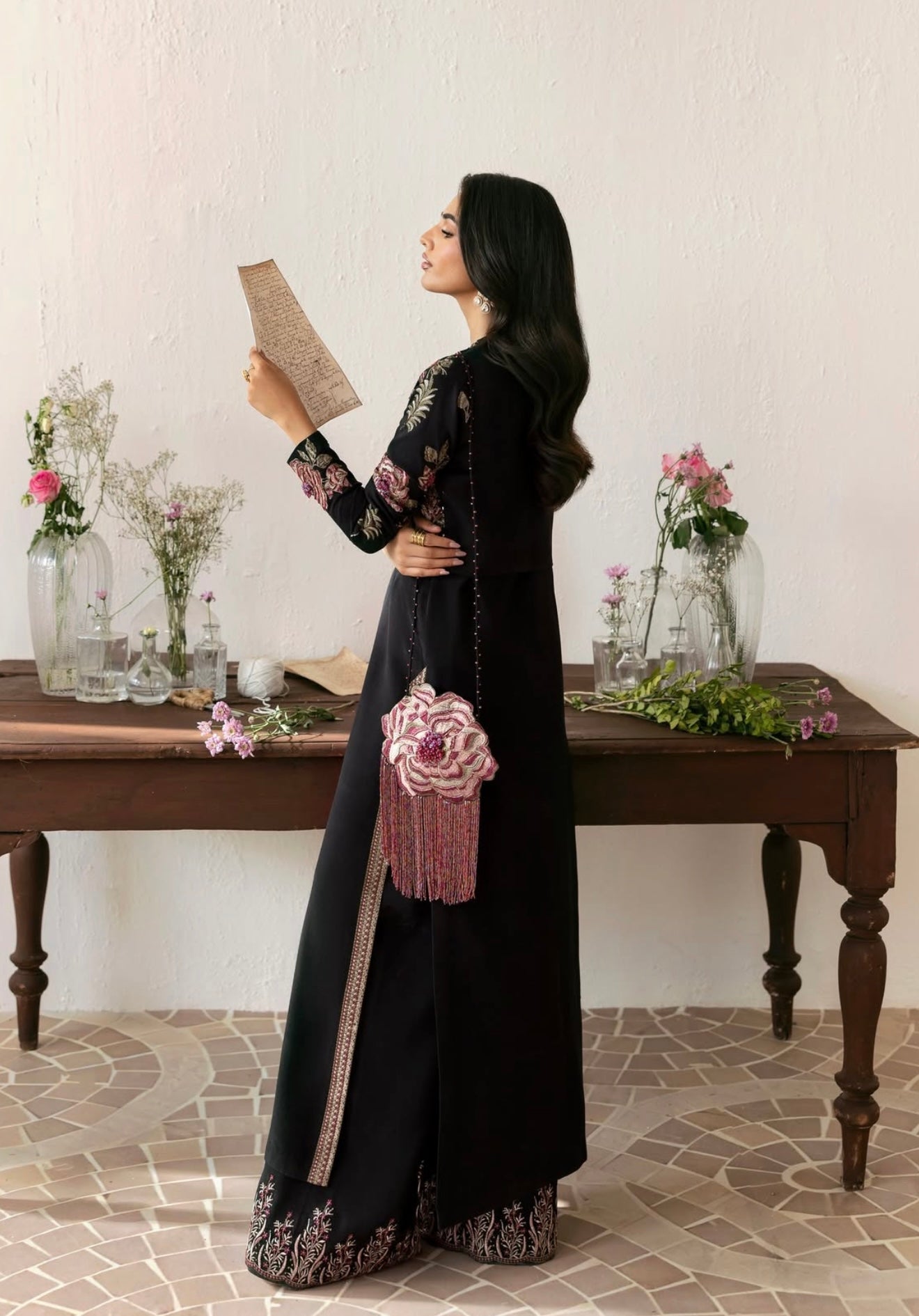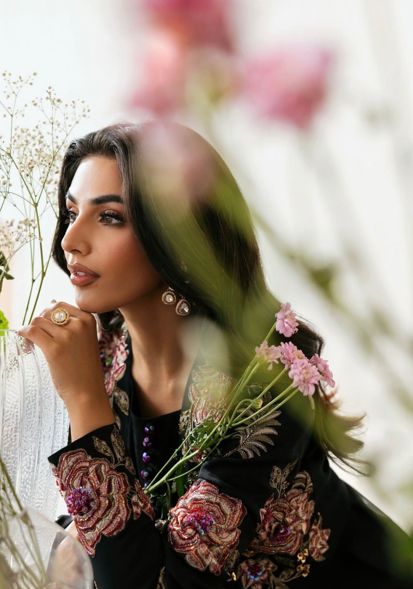 A 3-piece ensemble featuring a black shirt with slit embroidery and embellished front buttons, paired with embroidered embellished jacket and trousers